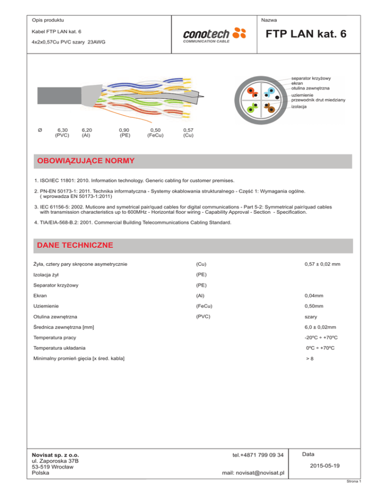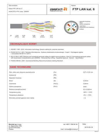 Nazwa Opis produktu Kabel FTP LAN kat. 6 FTP LAN kat. 6 4x2x0,57Cu PVC szary 23AWG Ø 6,30 (PVC) 6,20 (Al) COMMUNICATION CABLE 0,90 (PE) 0,50 (FeCu) 0,57 (Cu) OBOWIĄZUJĄCE NORMY 1. ISO/IEC 11801: 2010. Information technology. Generic cabling for customer premises. 2. PN-EN 50173-1: 2011. Technika informatyczna - Systemy okablowania strukturalnego - Część 1: Wymagania ogólne. ( wprowadza EN 50173-1:2011) 3. IEC 61156-5: 2002. Muticore and symetrical pair/quad cables for digital communications - Part 5-2: Symmetrical pair/quad cables with transmission characteristics up to 600MHz - Horizontal floor wiring - Capability Approval - Section - Specification. 4. TIA/EIA-568-B.2: 2001. Commercial Building Telecommunications Cabling Standard. DANE TECHNICZNE Żyła, cztery pary skręcone asymetrycznie (Cu) Izolacja żył (PE) Separator krzyżowy (PE) Ekran (Al) 0,04mm Uziemienie (FeCu) 0,50mm Otulina zewnętrzna (PVC) szary 0,57 ± 0,02 mm Średnica zewnętrzna [mm] 6,0 ± 0,02mm Temperatura pracy -20ºC ÷ +70ºC Temperatura układania 0ºC ÷ +70ºC Minimalny promień gięcia [x śred. kabla] >8 Novisat sp. z o.o. ul. Zaporoska 37B 53-519 Wrocław Polska tel.+4871 799 09 34 Data 2015-05-19 mail: [email protected] Strona 1