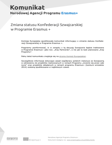 Zmiana statusu Konfederacji Szwajcarskiej w Programie Erasmus + Komisja Europejska opublikowała komunikat informujący o zmianie statusu Konfederacji Szwajcarskiej w Programie Erasmus +. Pragniemy poinformować, iż w związku z tą decyzją Szwajcaria będzie traktowana w Programie Erasmus+ jako tzw. „Kraj Partnerski”, a nie jak to było planowane „Kraj Programu”. Pełny tekst komunikatu znajduje się na stronie Komisji Europejskiej. Szczegółowe informacje dotyczące zasad współpracy polskich instytucji ze Szwajcarią w odniesieniu do projektów realizowanych w ramach Programu „Uczenie się przez całe życie” oraz projektów składanych w ramach programu Erasmus+ (konkurs wniosków 2014) zostaną opublikowane w najbliższym czasie. Narodowa Agencja Programu Erasmus+ Dokument dostępny na: www.erasmusplus.org.pl/dokumenty