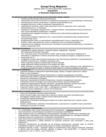 Zarząd Dróg Miejskich ogłasza nabór na wolne stanowisko urzędnicze specjalista w Wydziale Organizacji Ruchu Do głównych zadań osoby zatrudnionej na tym stanowisku będzie należało: • aktualizacja dokumentacji zbiorczej oznakowania, • wykonywanie zleceń dla kart kontroli na uzupełnienie brakującego lub nieprawidłowego oznakowania, • inwentaryzacja w terenie oznakowania i urządzeń bezpieczeństwa ruchu • przeglądy techniczne i odbiory wdrażanych organizacji ruchu • rozpatrywanie wniosków, uwag i skarg dotyczących zmian w organizacji ruchu w granicach administracyjnych m. st. Warszawy, • współpraca z zarządcami dróg gminnych - Urzędami Dzielnic, administratorami dróg wewnętrznych, oraz innymi jednostkami budżetowymi i miejskimi • sprawdzanie pod względem formalnym i merytorycznym dokumentacji projektowej złożonej do zaopiniowania • wykonywanie projektów organizacji ruchu z wykorzystaniem specjalistycznego oprogramowania komputerowego (Cad) • przygotowywanie zleceń na wprowadzenie zaprojektowanych zmian w organizacji ruchu • kontrola i odbiór wprowadzonych zmian w organizacji ruchu na podstawie projektów • analizowanie pod względem merytorycznym i formalnym otrzymywanej korespondencji z wnioskami o zmiany w organizacji ruchu Wymagania konieczne: • wykształcenie wyższe: Kierunek - Inżynieria Lądowa, specjalność - Inżynieria Komunikacyjna lub Wydział Transportu • min. 4 lata stażu pracy w budownictwie o profilu: budowa dróg, infrastruktura drogowa lub w jednostkach o działalności z zakresu utrzymania dróg, zarządzania drogami, zarządzania ruchem • prawo jazdy kat. B • umiejętność czytania dokumentacji budowlanej w tym dokumentacji projektowej- map geodezyjnych, projektów wykonawczych, projektów organizacji ruchu • dobra znajomość programu projektowego AutoCad, ZWCAD • biegła znajomość obsługi komputera w tym pakietu Ms Office • pełna zdolność do czynności prawnych, korzystanie z pełni praw publicznych oraz niekaralność za umyślne przestępstwo ścigane z oskarżenia publicznego lub umyślne przestępstwo skarbowe. Wymagania dodatkowe: • znajomość Kodeksu postępowania administracyjnego, Ustawy o drogach publicznych, Ustawy Prawo o ruchu drogowym, • znajomość Rozporządzenia Ministra Infrastruktury w sprawie szczegółowych warunków technicznych dla znaków i sygnałów drogowych ora urządzeń bezpieczeństwa ruchu drogowego i warunki ich umieszczania na drogach, • znajomość rozporządzenia Ministra Infrastruktury w sprawie szczegółowych warunków zarządzania ruchem na drogach oraz wykonywanie nadzoru nad tym zarządzeniem • znajomość Rozporządzenia Ministra Transportu i Gospodarki Morskiej w sprawie warunków technicznych jakim powinny odpowiadać drogi publiczne i ich usytuowanie • znajomość Ustawy z dnia 7 lipca 1994 r. z późniejszymi zmianami - Prawo budowlane • znajomość języka angielskiego w stopniu komunikatywnym Warunki pracy na danym stanowisku: • praca przy komputerze powyżej 4 godzin dziennie, • praca w biurze (I piętro, bez windy) oraz w terenie w różnych warunkach atmosferycznych wymagająca podróży pieszo w trakcie trwania odbiorowych komisji • prowadzenie pojazdu służbowego • uczestnictwo w komisjach wprowadzenia stałych lub zmiany organizacji ruchu również w godz. Nadliczbowych • kontakt z projektantami, petentami (wnioskodawcami), wykonawcami o wszelkimi innymi podmiotami realizujacymi czynności na drodze Wymagane dokumenty i oświadczenia: • CV z przebiegiem nauki i pracy zawodowej oraz list motywacyjny – podpisane odręcznie • kopie dokumentów potwierdzających posiadanie wymaganego wykształcenia • kopie świadectw pracy lub zaświadczeń dokumentujących wymagane doświadczenie zawodowe (lub zaświadczenie o zatrudnieniu z aktualnego miejsca pracy potwierdzające ww. wymagania stażowe) • podpisane odręcznie oświadczenie o posiadanym obywatelstwie* • kopie dokumentów potwierdzających posiadanie wymaganych uprawnień (ksero prawa jazdy) • podpisane oświadczenie o pełnej zdolności do czynności prawnych oraz korzystaniu z pełni praw publicznych* • podpisane oświadczenie, że kandydat nie był skazany prawomocnym wyrokiem sądu za umyślne przestępstwo ścigane z oskarżenia publicznego lub umyślne przestępstwo skarbowe* • podpisana klauzula o treści : „Wyrażam zgodę na przetwarzanie moich danych osobowych zawartych w ofercie pracy dla potrzeb rekrutacji, zgodnie z ustawą z dnia 29.08.1997 r. o ochronie danych osobowych (t. j. Dz. U. z 2015 r., poz. 2135 ze zm.).” * • • • • podpisane oświadczenie o treści: „wyrażam zgodę na komisyjne zniszczenie złożonej przeze mnie oferty na stanowisko...........(wraz z kserokopiami dokumentów), w przypadku jej nieodebrania w terminie 6. miesięcy od upowszechnienia w Biuletynie Informacji Publicznej informacji o wyniku naboru* osoba wybrana do zatrudnienia będzie zobowiązana do przedstawienia oryginału aktualnego „Zapytania o udzielenie informacji o osobie” z Krajowego Rejestru Karnego dodatkowo można złożyć referencje, rekomendacje, kopie dokumentów potwierdzających posiadanie uprawnień i umiejętności przydatnych na danym stanowisku kserokopia dokumentu potwierdzającego niepełnosprawność w przypadku kandydata zamierzającego skorzystać z uprawnienia, o którym mowa w art. 13a ust. 2 ustawy z dnia 21 listopada 2008 r. o pracownikach samorządowych (Dz.U.2014.1202). Wskaźnik zatrudnienia osób niepełnosprawnych w maju 2016 r. wyniósł mniej niż 6% Osoby zainteresowane prosimy o składanie kompletu dokumentów w zamkniętej kopercie osobiście w kancelarii ZDM lub przesłanie pocztą na poniższy adres do dnia 16.06.2016 r. Zarząd Dróg Miejskich Wydział Spraw Pracowniczych ul. Chmielna 120, 00-801 Warszawa tel. 22 5589228, 22 5589160 z dopiskiem na kopercie: „33/2016 specjalista w Wydziale Organizacji