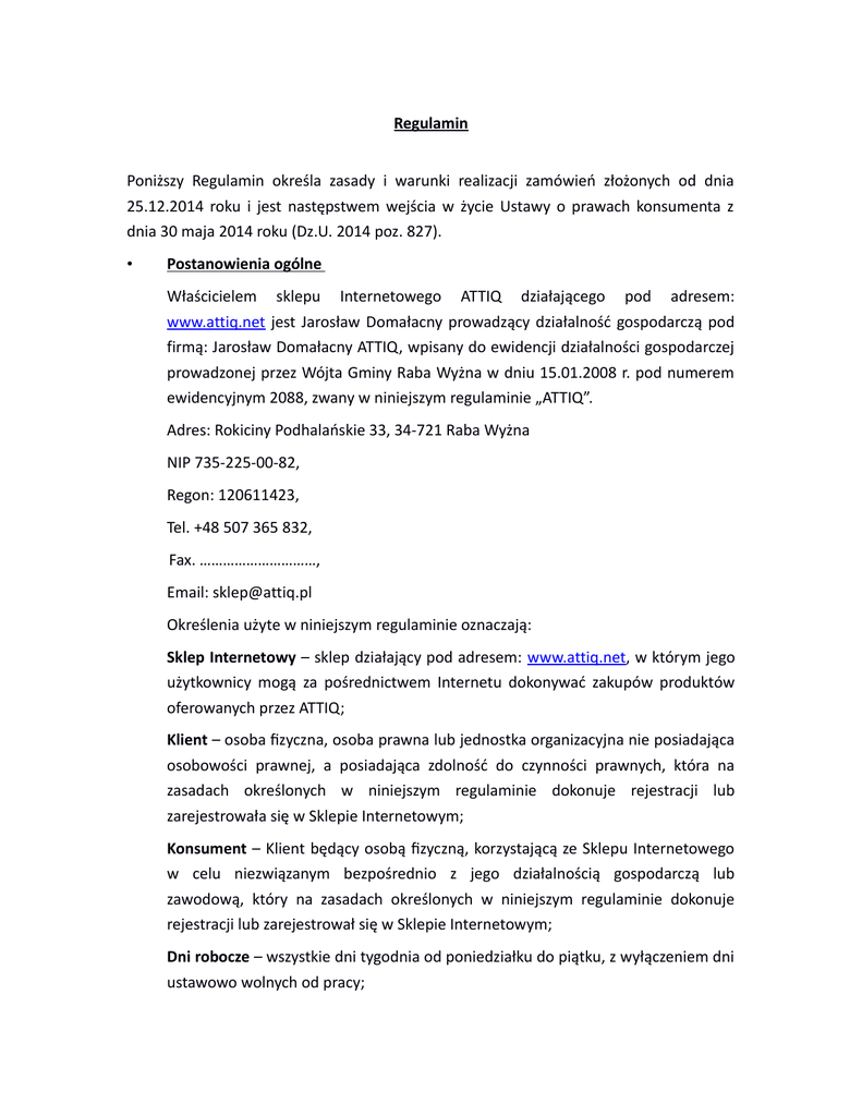 Regulamin Poniższy Regulamin określa zasady i warunki realizacji zamówień złożonych od dnia 25.12.2014 roku i jest następstwem wejścia w życie Ustawy o prawach konsumenta z dnia 30 maja 2014 roku (Dz.U. 2014 poz. 827). • Postanowienia ogolne Właścicielem sklepu Internetowego ATTIQ działającego pod adresem: www.attiq.net jest Jarosław Domałacny prowadzący działalność gospodarczą pod firmą: Jarosław Domałacny ATTIQ, wpisany do ewidencji działalności gospodarczej prowadzonej przez Wójta Gminy Raba Wyżna w dniu 15.01.2008 r. pod numerem ewidencyjnym 2088, zwany w niniejszym regulaminie „ATTIQ”. Adres: Rokiciny Podhalańskie 33, 34-721 Raba Wyżna NIP 735-225-00-82, Regon: 120611423, Tel. +48 507 365 832, Fax. …………………………, Email: [email protected] Okreslenia uzyte w niniejszym regulaminie oznaczaja: Sklep Internetowy – sklep działajacy pod adresem: www.attiq.net, w ktorym jego uzytkownicy moga za posrednictwem Internetu dokonywać zakupow produktow oferowanych przez ATTIQ; Klient – osoba fizyczna, osoba prawna lub jednostka organizacyjna nie posiadajaca osobowosci prawnej, a posiadajaca zdolnosć do czynnosci prawnych, ktora na zasadach okreslonych w niniejszym regulaminie dokonuje rejestracji lub zarejestrowała się w Sklepie Internetowym; Konsument – Klient będacy osoba fizyczna, korzystajaca ze Sklepu Internetowego w celu niezwiazanym bezposrednio z jego działalnoscia gospodarcza lub zawodowa, ktory na zasadach okreslonych w niniejszym regulaminie dokonuje rejestracji lub zarejestrował się w Sklepie Internetowym; Dni robocze – wszystkie dni tygodnia od poniedziałku do piatku, z wyłaczeniem dni ustawowo wolnych od pracy; Czas realizacji zamowienia – czas, w jakim ATTIQ skompletuje zamowienie i przekaze do wysłania za posrednictwem poczty lub kuriera, na adres wskazany przez Klienta; Koszyk – element Sklepu Internetowego, za pomoca ktorego Klient precyzuje szczegoły zamowienia takie jak: ilosć produktow, adres dostawy, dane do faktury, sposob dostawy, sposob płatnosci, itp.; Strona produktowa – strona w Sklepie Internetowym, na ktorej przedstawione sa informacje na temat produktu; Dane bilingowe – dane Klienta, w tym jego dane osobowe, pozwalające poprawnie wystawić przez ATTIQ fakturę za wykupione produkty objęte zamowieniem. • Rejestracja i logowanie • Warunkiem dokonywania zakupow w Sklepie Internetowym jest dokonanie rejestracji. • W celu dokonania rejestracji nalezy na stronie internetowej www.attiq.net wybrać w zakładce „moje konto” opcję „zarejestruj się”, a następnie wypełnić formularz rejestracyjny podajac następujace dane: imię i nazwisko (lub firma), adres e-mail (login), nr telefonu oraz hasło. • Warunkiem rejestracji jest zapoznanie się i zaakceptowanie niniejszego regulaminu, a takze wyrazenie zgody na przetwarzanie przez ATTIQ danych osobowych niezbędnych dla realizacji zamowień składanych w Sklepie Internetowym. • Po dokonaniu czynnosci, o ktorej mowa w ust. 2 ATTIQ przesle na adres e-mail Klienta podany w formularzu rejestracyjnym wiadomosć zawierajaca link, ktorego uruchomienie stanowi potwierdzenie rejestracji i kończy procedurę rejestracyjna. • Po dokonaniu rejestracji, Klient moze zalogować się do Sklepu Internetowego przy pomocy podanych w trakcie rejestracji adresu e-mail jako loginu oraz hasła. • Po zalogowaniu Klient w zakładce „Moje konto” moze, wypełniajac formularz, uzupełnić swoje dane lub dokonać zmiany podanych danych oraz zmiany hasła. • Podanie danych adresowych jest konieczne dla realizacji zamowień składanych przez Klienta w Sklepie internetowym. • Składanie zamowień • Klient moze składać zamowienia przez 24 godziny na dobę za posrednictwem strony internetowej www.attiq.net. Klient po zarejestrowaniu się i zalogowaniu składa zamowienie, wskazujac na Stronie Produkt, ktorym jest zainteresowany, poprzez uruchomienie linku ukrytego pod polem „Dodaj do koszyka”, a następnie w Koszyku wskazujac sposob odbioru i płatnosci za zamowienie. • W zamowieniu (w Koszyku), Klient wskazuje: • zamawiany towar i rozmiar produktu, jezeli produkt oferowany jest w roznych rozmiarach; • adres, na jaki ma być dostarczony towar; • Dane bilingowe; • sposob dostawy; • sposob płatnosci. • Procedura składania zamowienia kończy się w momencie uruchomienia przez Klienta linku ukrytego pod polem „Zamawiam z obowiazkiem zapłaty”. Dokonanie tej czynnosci oznacza złozenie zamowienia i zawarcie z ATTIQ umowy kupnasprzedazy produktow objętych zamowieniem. • Do momentu uruchomienia przez Klienta linku ukrytego pod polem „Zamawiam z obowiazkiem zapłaty” Klient ma mozliwosć modyfikacji wprowadzonych danych oraz zawartosci koszyka. W tym celu nalezy kierować się wyswietlanymi Klientowi komunikatami oraz informacjami dostępnymi na stronie. • Na adres e-mail wskazany podczas rejestracji ATTIQ wysyła wiadomosć potwierdzajaca przyjęcie zamowienia do realizacji, zawierajaca wszystkie istotne elementy zamowienia. • Klient dokonujac wyboru sposobu płatnosci ma zawsze mozliwosć wyboru płatnosci przy odbiorze zamowionych produktow (za pobraniem). • Klienci moga uzyskać dostęp do niniejszego Regulaminu w kazdym czasie za posrednictwem odsyłacza zamieszczonego na stronie www.attiq.net. • Utrwalenie, zabezpieczenie oraz udostępnienie danych zamowienia oraz Regulaminu sprzedazy następuje za posrednictwem poczty elektronicznej. Tutaj w kazdej chwili mozna zapoznać się z regulaminem sprzedazy, pobrać go oraz sporzadzić jego wydruk. Wczesniejsze zamowienia dostępne sa w ramach konta po zalogowaniu. Sklep Internetowy ATTIQ nie przechowuje tresci zawartych umow. • Umowa sprzedazy zawierana jest w języku polskim. • Ceny towarow • Sklep Internetowy zamieszcza informacje na temat swojej oferty na stronie www.attiq.net i oferuje towary znajdujace się w bazie Sklepu Internetowego za posrednictwem 