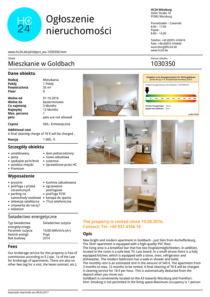 Ogłoszenie nieruchomości HC24 Würzburg Zeller Straße 16 97082 Würzburg Poniedziałek – Czwartek: 8.00 – 17.00 Piątek : 8.00 – 14.00 Telefon: +49 (0)931-416616 Faks: +49 (0)931-416644 [email protected] www.hc24.de www.hc24.de/pl/object_wu-1030350.htm Obiekt Numer obiektu Mieszkanie w Goldbach 1030350 Dane obiektu Rodzaj Pokój Powierzchnia Floor Mieszkania 1 Pokój 35 m² 0 Wolne od Wolne do Co najmniej Najwyżej Max. persons pets 01.10.2016 bezterminowo 3 Months 12 Months 1 pets are not allowed Czynsz 560,- €/miesięcznie Additional cost A final cleaning charge of 70 € will be charged . Kaucja 1 000,- € Szczegóły obiektu umeblowany jasny spokojne po?o?enie autobus miejski Premium dom jednorodzinny nowa zabudowa suterena Sprawdzone przez HC Wyposażenie prysznic pod?oga z p?ytek ceramicznych parking na samochody osobowe telewizja satelitarna zmywarka do naczy? telewizor kuchnia zabudowana ogrzewanie pod?ogowe pod?oga PCW kanapa do spania ??cze telefoniczne Świadectwo energetyczne Typ świadectwa energetycznego Parametr zużycia Nośnik energii Rok budowy Świadectwo zużycia 19,00 kWh/m²a (A+) Prąd 2014 Fees Our brokerage service for this property is free of commission according to § 2 par. 1a of the Law for brokerage of apartments. There are also no other fees (eg for a visit, the lease contract, etc.). Exposição imprimida aos 08.03.2017 Powered by TCPDF (www.tcpdf.org) The property is rented since 19.08.2016. Contact: Tel. +49 931 4166 16 Opis New bright and modern apartment in Goldbach - just 5km from Aschaffenburg. The 35m² apartment is equipped with a high-quality PVC floor. The living area is a breakfast bar that has two Essplatzmöglichkeiten. In addition, located in the room is a sofa bed, TV, Low board. In a small alcove there is a fully equipped kitchen, which is equipped with a stove, oven, refrigerator and dishwasher. The modern bathroom has a walk-in shower and toilet. The monthly rent is an estimated rent in the amount of 540 €. The apartment from 3 months to max. 12 months to be rented. A final cleaning of 70 € will be charged. A cleaning service for 18 € per hour. This is automatically deducted from the deposit when you move out. Goldbach is conveniently located on the A3 towards Würzburg and Frankfurt. Hint: Smoking is not permitted in the living space.Maximum occupancy is 1 person