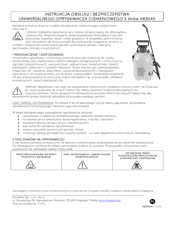 INSTRUKCJA OBSŁUGI I BEZPIECZEŃSTWA UNIWERSALNEGO OPRYSKIWACZA CIŚNIENIOWEGO 5 litrów AB3045 Niniejsza instrukcja dotyczy modelu opryskiwaczy ciśnieniowego o pojemności roboczej 5l. UWAGA! Dokładne zapoznanie się z treścią instrukcji należy do obowiązków użytkownika. Nieprzestrzeganie zasad prawidłowej eksploatacji może być przyczyną: wypadku, awarii, utraty gwarancji. W przypadku, jeśli instrukcja jest nieczytelna lub niezrozumiała dla użytkownika urządzenia, prosimy o kontakt z importerem przed rozpoczęciem użytkowania sprzętu. Zalecamy zachowanie instrukcji na przyszłość! I PRZEZNACZENIE I ZASTOSOWANIE Uniwersalny opryskiwacz ciśnieniowy przeznaczony jest wyłącznie do użytku amatorskiego przy wykonywaniu lekkich zabiegów pielęgnacyjnych i ochronnych w ogrodach przydomowych, warzywnictwie, sadownictwie i kwiaciarstwie, małych plantacjach, szklarniach i tunelach foliowych. Może również być wykorzystywany miejscowo do: zraszania, dezynfekcji, czyszczenia powierzchni i impregnacji. Opryskiwacz ten przystosowany jest do pracy z pestycydami. Konstrukcja urządzenia nie jest przystosowana do pracy przy dużym obciążeniu np. w przemyśle, zakładach produkcyjnych, dużych plantacjach itp. UWAGA! Opryskiwacz raz użyty do opryskiwania chemicznymi środkami ochrony roślin nie może być już wykorzystywany do innych celów! Nie należy stosować środków łatwopalnych ani rozpuszczalników, cieczy gorących (o temperaturze powyżej 30stC) lub żrących! Zaleca się, aby sprawdzenia sprzętu dokonał specjalista na początku każdego sezonu. LIMIT OKRESU UŻYTKOWANIA: Po okresie 5 lat od pierwszego użycia należy zaprzestać użytkowania opryskiwacza kompresyjnego i dokonać jego złomowania. W skład standardowego wyposażenia opryskiwacza wchodzi: opryskiwacz z osadzoną centralnie pompą i zaworem bezpieczeństwa, kompletna lanca zakończona dyszą regulowaną, z rączką i zaworem, przewód roboczy łączący lancę z opryskiwaczem, pas nośny do transportu opryskiwacza, zestaw uszczelek zamiennych (pompy i tłoka), instrukcja obsługi sporządzona w języku polskim – w razie zagubienia zwrócić się do sprzedawcy II OPIS ZNAKÓW NA OPRYSKIWACZU Znaki bezpieczeństwa umieszczono na tabliczce znamionowej, przytwierdzonej do zbiornika opryskiwacza. Do obowiązków użytkownika należy zachowanie znaków w czystości. W przypadku zniszczenia znaku użytkownik ma obowiązek nakleić nowy znak. PRZED PRZYSTĄPIENIEM DO PRACY PRZECZYTAJ INSTRUKCJĘ ZNAK OSTRZEGAWCZY- UWAGA! RYZYKO NIEBEZPIECZEŃSTA! OSTRZEŻENIE PRZED NIEBEZPIECZEŃSTWEM ZATRUCIA SUBSTANCJAMI TOKSYCZNYMI Zastrzegamy możliwość zmian konstrukcyjnych w stosunku do niniejszej instrukcji, służących doskonaleniu urządzenia. Floraland Sp. z o.o. Sp. k. ul. Strużańska 28, Stanisławów Pierwszy, 05-126 Nieporęt, Polska www.floraland.pl Kraj pochodzenia: Ch.R.L. AB3045A v.1 2015 2. 3. 4. 5. 6. 7. 8. 9. III PRZEPISY DOTYCZĄCE BEZPIECZEŃSTWA PRACY 1. Wykorzystując opryskiwacz do ochrony roślin należy stosować się do instrukcji obsługi, ogólnych zasad BHP oraz przestrzegać instrukcji środków chemicznych, zawartych w aktualnych Zaleceniach agrotechnicznych oraz Programach Ochrony Roślin. Nie stosować środków ochrony w małych pomieszczeniach. Preparaty chemiczne przechowywać w oryginalnych opakowaniach z dala od środków spożywczych, w miejscach przewiewnych, zamkniętych i niedostępnych dla dzieci i zwierząt. Należy stosować wyłącznie preparaty z aktualną datą ważności i bez widocznych oznak rozkładu! Ciecz roboczą należy przygotować zgodnie z instrukcją danego środka chemicznego. Wykorzystywać wyłącznie naczynia specjalnie do tego przeznaczone! Podczas pracy z preparatami chemicznymi używać ochronnych: butów, rękawic, ubioru i masek twarz! W trakcie pracy: nie jeść, nie pić i nie palić! Nie przedmuchiwać ustami dyszy ani innych części opryskiwacza. Po pracy umyć ręce. Zabiegów ochrony roślin nie powinny wykonywać: kobiety w ciąży, nieletni, osoby nietrzeźwe i o ograniczonej sprawności. Nigdy nie opryskiwać ludzi ani zwierząt- stosować odstęp co najmniej 15m od osoby pracującej opryskiwaczem. W przypadku złego samopoczucia, podejrzenia zatrucia lub poparzenia środkami ochrony natychmiast przerwać pracę i zgłosić się do lekarza! Nie przechylać opryskiwacza podczas pracy, dopuszcza się użytkowanie w pozycji pionowej! Nie dołączać dodatkowych pomp zwiększających ciśnienie pracy, gdyż może to doprowadzić do rozsadzenia zbiornika! Nie pracować podczas silnego wiatru! Podczas pracy ustawiać się zawsze tyłem do kierunku wiatru! Nie napełniać opryskiwacza ponad objętość znamionową! Nie nachylać twarzy nad zawór bezpieczeństwa i pompę opryskiwacza. Po skończonej pracy nie pozostawiać urządzenia pod ciśnieniem lub z cieczą roboczą w zbiorniku! Opryskiwacza nie można składować ani użytkować w pobliżu źródeł ciepła i ognia oraz nie można wystawiać na bezpośrednią ekspozycję silnych promieni słonecznych. Użytkowanie opryskiwacza jest dopuszczalne wyłącznie w temperaturze 5-30st C. Stosowanie środków ochrony jest niedopuszczalne w gorące dni! Po pracy resztki cieczy roboczej rozcieńczyć i rozprowadzić na opryskiwanej powierzchni. Opryskiwacz przepłukać kilkukrotnie czystą wodą (lub z dodatkiem detergentu) i oczyścić filtr a następnie przedmuchać za pomocą pompki. Nie wylewać pozostałości do zbiorników wodnych, rowów melioracyjnych itp. Umyć twarz i dłonie, przepłukać usta czystą wodą i zmienić odzież. Puste opakowania po środkach zutylizować zgodnie z obowiązującymi normami. IV UŻYTKOWANIE Przed przystąpieniem do pracy należy zmontować opryskiwacz zgodnie z rysunkiem. W tym celu należy zamocować pasek transportowy poprzez klamry do otworów mocujących zbiornika opryskiwacza i wyregulować go na żądaną długość. Przewód roboczy z PCV powi