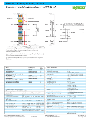 750-552, 750-554 / 753-552, 753-554 1 2-kanałowy moduł wyjść analogowych 0/4-20 mA 254 13 14 funkcja AO 1 A funkcja AO 2 C D B A1 A2 magistrala systemowa 5 1 AO 1 AO 1 AO 2 + AO AO 2 D U logika + 6 2 funkcja 24 V 24 V 24 V 0V 0V 270 pF 2 x 10nF 7 3 0V 0V S A I 0V 10nF S 8 4 ekran ekran ekran ekran 750-552 750-552 magistrala obiektowa wymiary i dane ogólne patrz str. 24 / dostawa bez oznaczników Mini-WSB / oznaczenia i obsługa modułów z serii 750 (753) patrz str. 10 ... 11 / 12 ... 13 Moduł wyjść analogowych generuje sygnały o znormalizowanej wielkości 0-20 mA i 4-20 mA. Sygnał wyjściowy jest galwanicznie odseparowany od magistrali systemowej i transmitowany z rozdzielczością 12 bitów. Do zasilania modułu prądowego wykorzystywane jest zasilanie magistrali obiektowej. Opis 2AO 0-20mA 2AO 0-20mA/S5 2) 2AO 0-20mA/T (temperatura pracy -20 °C ... +60 °C) 2AO 4-20mA 2AO 4-20mA/S5 2) 2AO 4-20mA/T (temperatura pracy -20 °C ... +60 °C) 2AO 0-20mA (bez wtyczki) 2AO 4-20mA (bez wtyczki) 1) 2) szt./ opak. nr katalogowy 1) 750-552 750-552/000-200 750-552/025-000 10 10 1 750-554 750-554/000-200 750-554/025-000 101) 10 753-552 753-554 1 1 liczba wyjść wewnętrzny pobór prądu napięcie magistrali obiektowej prąd sygnałowy impedancja obciążenia liniowość rozdzielczość czas przetwarzania błąd pomiaru 25 °C współczynnik temperaturowy izolacja reprezentacja w obrazie procesu możliwa dostawa pojedynczych sztuk format danych zgodny z FB 250 / Simatic S5 Aprobaty patrz również przegląd aprobat rozdział 1 znak zgodności przemysł morski (warianty na zapytanie) r UL 508 r ANSI/ISA 12.12.01 1 ABS, BV, DNV, GL, KR, LR*, NKK*, PRS*, RINA* *seria 753 w przygotowaniu 4 EN 60079-0, -15 EN 61241-0, -1 4 EN 60079-0, -11, -15 EN 61241-0, -1, -11 I M2 / II 3 GD Ex nA IIC T4 75x-552, 753-554 I M2 / II 3 GD Ex nA IIC T4 750-55x/000-200 I M2 Ex d I 750-554* II 3 G Ex nA IIC T4 750-554* II 3 D Ex tD A22 IP6X T135°C 750-554* * dopuszczalna temperatura pracy 0 °C ... +60°C Class I Div2 ABCD T4 Dane techniczne 75x-552, -554 750-55x/000-200 technika podłączania przewodu przekrój przewodu dł. odizolowania przewodu seria 750 / 753 szerokość modułu ciężar EMC: 1 - odporność na zakłócenia EMC: 1 - emisja zakłóceń EMC przemysł morski - odporność na zakłócenia EMC przemysł morski - emisja zakłóceń Akcesoria :$*2.RQWDNWWHFKQLN*PE+&R.* :$*2(/:$*VS]RR =DVWU]HJDVLĊSUDZRGR]PLDQWHFKQLF]Q\FK XO3LĊNQDD:URFáDZ 2 70 mA 24 V DC (-25 % ... +30 %) 0 mA ... 20 mA (750-552, 753-552) 4 mA ... 20 mA (750-554, 753-554) < 600 Ω ±10 μA 12 bitów ok. 2 ms < ± 0,1 % zakresu < ± 0,01 % /K zakresu (750-552, 753-552) < ± 0,015 % /K zakresu (750-554, 753-554) 500 V system / zasilanie 2 x 16 bitów dane 2 x 8 bitów sterowanie/status (opcja) CAGE CLAMP® 0,08 mm² ... 2,5 mm² / AWG 28 ... 14 8 ... 9 mm / 0.33 in 9 ... 10 mm / 0.37 in 12 mm 53,5 g zgodnie z EN 61000-6-2 (2005) zgodnie z EN 61000-6-4 (2007) zgodnie z Germanischer Lloyd (2003) zgodnie z Germanischer Lloyd (2003) wtyczka seria 753, elementy kodujące oznaczniki Mini-WSB WHO ZZZZDJRFRP