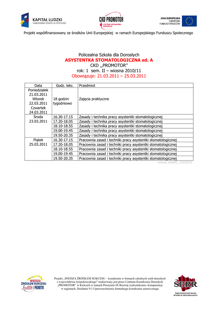 Projekt współfinansowany ze środków Unii Europejskiej w ramach Europejskiego Funduszu Społecznego Policealna Szkoła dla Dorosłych ASYSTENTKA STOMATOLOGICZNA ed. A CKD ,,PROMOTOR’’ rok: 1 sem. II – wiosna 2010/11 Obowiązuje: 21.03.2011 – 25.03.2011 Data Poniedziałek 21.03.2011 Wtorek 22.03.2011 Czwartek 24.03.2011 Środa 23.03.2011 Piątek 25.03.2011 Godz. lekc. Przedmiot 18 godzin tygodniowo Zajęcia praktyczne 16.30-17.15 17.20-18.05 18.10-18.55 19.00-19.45 19.50-20.35 16.30-17.15 17.20-18.05 18.10-18.55 19.00-19.45 19.50-20.35 Zasady i technika pracy asystentki stomatologicznej Zasady i technika pracy asystentki stomatologicznej Zasady i technika pracy asystentki stomatologicznej Zasady i technika pracy asystentki stomatologicznej Zasady i technika pracy asystentki stomatologicznej Pracownia zasad i techniki pracy asystentki stomatologicznej Pracownia zasad i techniki pracy asystentki stomatologicznej Pracownia zasad i techniki pracy asystentki stomatologicznej Pracownia zasad i techniki pracy asystentki stomatologicznej Pracownia zasad i techniki pracy asystentki stomatologicznej wiedza_dok002_19102010 Projekt „WIEDZA ŹRÓDŁEM SUKCESU – kształcenie w formach szkolnych osób dorosłych z województwa świętokrzyskiego” realizowany jest przez Centrum Kształcenia Dorosłych „PROMOTOR” w Kielcach w ramach Priorytetu IX Rozwój wykształcenia i kompetencji w regionach, Działanie 9.3 Upowszechnienie formalnego kształcenia ustawicznego Projekt współfinansowany ze środków Unii Europejskiej w ramach Europejskiego Funduszu Społecznego Policealna Szkoła dla Dorosłych ASYSTENTKA STOMATOLOGICZNA ed. A CKD ,,PROMOTOR’’ rok: 1 sem. II – wiosna 2010/11 Obowiązuje: 28.03.2011 – 01.04.2011 Data Poniedziałek 28.03.2011 Wtorek 29.03.2011 Czwartek 31.03.2011 Godz. lekc. Przedmiot 18 godzin tygodniowo Zajęcia praktyczne Środa 30.03.2011 16.30-17.15 17.20-18.05 18.10-18.55 19.00-19.45 19.50-20.35 16.30-17.15 17.20-18.05 18.10-18.55 19.00-19.45 19.50-20.35 Anatomia, fizjologia i patologia narządu żucia Anatomia, fizjologia i patologia narządu żucia Anatomia, fizjologia i patologia narządu żucia Anatomia, fizjologia i patologia narządu żucia Anatomia, fizjologia i patologia narządu żucia Pracownia zasad i techniki pracy asystentki stomatologicznej Pracownia zasad i techniki pracy asystentki stomatologicznej Pracownia zasad i techniki pracy asystentki stomatologicznej Pracownia zasad i techniki pracy asystentki stomatologicznej Pracownia zasad i techniki pracy asystentki stomatologicznej Piątek 01.04.2011 wiedza_dok003_19102010 Projekt „WIEDZA ŹRÓDŁEM SUKCESU – kształcenie w formach szkolnych osób dorosłych z województwa świętokrzyskiego” realizowany jest przez Centrum Kształcenia Dorosłych „PROMOTOR” w Kielcach w ramach Priorytetu IX Rozwój wykształcenia i kompetencji w regionach, Działanie 9.3 Upowszechnienie formalnego kształcenia ustawicznego Projekt współfinansowany ze środków Unii Europejskiej w ramach Europejskiego Funduszu Społecznego Policealna Szkoła dla Dorosłych ASYSTENTKA STOMATOLOGICZNA ed. A CKD ,,PROMOTOR’’ rok: 1 sem. II – wiosna 2010/11 Obowiązuje: 04.04.2011 – 15.04.2011 Data Poniedziałek 04.04.2011 11.04.2011 Wtorek 05.04.2011 12.04.2011 Środa 06.04.2011 13.04.2011 Czwartek 07.04.2011 14.04.2011 Piątek 08.04.2011 15.04.2011 Godz. lekc. 7 godzin dziennie 7 godzin dziennie Przedmiot PRAKTYKA ZAWODOWA PRAKTYKA ZAWODOWA 7 godzin dziennie PRAKTYKA ZAWODOWA 7 godzin dziennie PRAKTYKA ZAWODOWA 7 godzin dziennie PRAKTYKA ZAWODOWA Projekt „WIEDZA ŹRÓDŁEM SUKCESU – kształcenie w formach szkolnych osób dorosłych z województwa świętokrzyskiego” realizowany jest przez Centrum Kształcenia Dorosłych „PROMOTOR” w Kielcach w ramach Priorytetu IX Rozwój wykształcenia i kompetencji w regionach, Działanie 9.3 Upowszechnienie formalnego kształcenia ustawicznego Projekt współfinansowany ze środków Unii Europejskiej w ramach Europejskiego Funduszu Społecznego Policealna Szkoła dla Dorosłych ASYSTENTKA STOMATOLOGICZNA ed. A CKD ,,PROMOTOR’’ rok: 1 sem. II – wiosna 2010/11 Obowiązuje: 18.04.2011 – 20.04.2011 Data Poniedziałek 18.04.2011 Wtorek 19.04.2011 Czwartek Środa 20.04.2011 Piątek - Godz. lekc. Przedmiot 18 godzin tygodniowo Zajęcia praktyczne 16.30-17.15 17.20-18.05 18.10-18.55 19.00-19.45 19.50-20.35 16.30-17.15 17.20-18.05 18.10-18.55 19.00-19.45 19.50-20.35 Anatomia, Anatomia, Anatomia, Anatomia, Anatomia, fizjologia fizjologia fizjologia fizjologia fizjologia i i i i i patologia patologia patologia patologia patologia narządu narządu narządu narządu narządu żucia żucia żucia żucia żucia wiedza_dok005_19102010 Projekt „WIEDZA ŹRÓDŁEM SUKCESU – kształcenie w formach szkolnych osób dorosłych z województwa świętokrzyskiego” realizowany jest przez Centrum Kształcenia Dorosłych „PROMOTOR” w Kielcach w ramach Priorytetu IX Rozwój wykształcenia i kompetencji w regionach, Działanie 9.3 Upowszechnienie formalnego kształcenia ustawicznego Projekt współfinansowany ze środków Unii Europejskiej w ramach Europejskiego Funduszu Społecznego Policealna Szkoła dla Dorosłych ASYSTENTKA STOMATOLOGICZNA ed. A CKD ,,PROMOTOR’’ rok: 1 sem. II – wiosna 2010/11 Obowiązuje: 27.04.2011 – 29.04.2011 Data Poniedziałek Wtorek Czwartek 28.04.2011 Środa 27.04.2011 Piątek 29.04.2011 Godz. lekc. Przedmiot 18 godzin tygodniowo Zajęcia praktyczne 16.30-17.15 17.20-18.05 18.10-18.55 19.00-19.45 19.50-20.35 16.30-17.15 17.20-18.05 18.10-18.55 19.00-19.45 19.50-20.35 Zasady i technika pracy asystentki stomatologicznej Zasady i technika pracy asystentki stomatologicznej Zasady i technika pracy asystentki stomatologicznej Zasady i technika pracy asystentki stomatologicznej Zasady i technika pracy asystentki stomatologicznej Pracownia zasad i techniki pracy asystentki stomatologicznej Pracownia zasad i techniki pracy asystentki stomatologiczn