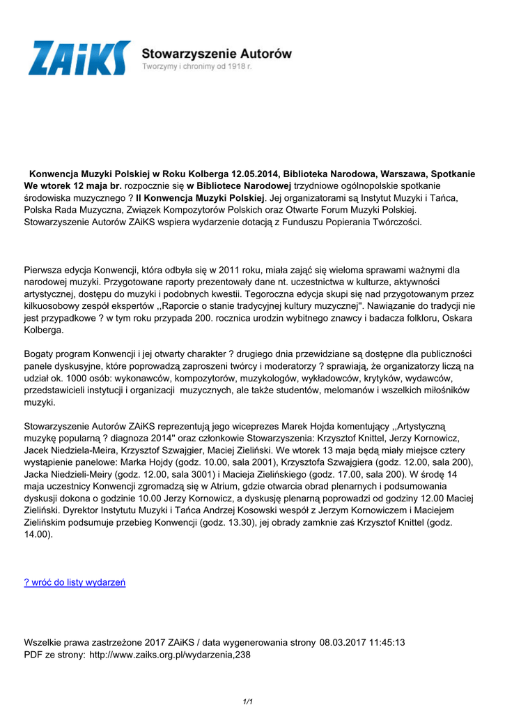 Konwencja Muzyki Polskiej w Roku Kolberga 12.05.2014, Biblioteka Narodowa, Warszawa, Spotkanie We wtorek 12 maja br. rozpocznie się w Bibliotece Narodowej trzydniowe ogólnopolskie spotkanie środowiska muzycznego ? II Konwencja Muzyki Polskiej. Jej organizatorami są Instytut Muzyki i Tańca, Polska Rada Muzyczna, Związek Kompozytorów Polskich oraz Otwarte Forum Muzyki Polskiej. Stowarzyszenie Autorów ZAiKS wspiera wydarzenie dotacją z Funduszu Popierania Twórczości. Pierwsza edycja Konwencji, która odbyła się w 2011 roku, miała zająć się wieloma sprawami ważnymi dla narodowej muzyki. Przygotowane raporty prezentowały dane nt. uczestnictwa w kulturze, aktywności artystycznej, dostępu do muzyki i podobnych kwestii. Tegoroczna edycja skupi się nad przygotowanym przez kilkuosobowy zespół ekspertów ,,Raporcie o stanie tradycyjnej kultury muzycznej''. Nawiązanie do tradycji nie jest przypadkowe ? w tym roku przypada 200. rocznica urodzin wybitnego znawcy i badacza folkloru, Oskara Kolberga. Bogaty program Konwencji i jej otwarty charakter ? drugiego dnia przewidziane są dostępne dla publiczności panele dyskusyjne, które poprowadzą zaproszeni twórcy i moderatorzy ? sprawiają, że organizatorzy liczą na udział ok. 1000 osób: wykonawców, kompozytorów, muzykologów, wykładowców, krytyków, wydawców, przedstawicieli instytucji i organizacji muzycznych, ale także studentów, melomanów i wszelkich miłośników muzyki. Stowarzyszenie Autorów ZAiKS reprezentują jego wiceprezes Marek Hojda komentujący ,,Artystyczną muzykę popularną ? diagnoza 2014'' oraz członkowie Stowarzyszenia: Krzysztof Knittel, Jerzy Kornowicz, Jacek Niedziela-Meira, Krzysztof Szwajgier, Maciej Zieliński. We wtorek 13 maja będą miały miejsce cztery wystąpienie panelowe: Marka Hojdy (godz. 10.00, sala 2001), Krzysztofa Szwajgiera (godz. 12.00, sala 200), Jacka Niedzieli-Meiry (godz. 12.00, sala 3001) i Macieja Zielińskiego (godz. 17.00, sala 200). W środę 14 maja uczestnicy Konwencji zgromadzą się w Atrium, gdzie otwarcia obrad plenarnych i podsumowania dyskusji dokona o godzinie 10.00 Jerzy Kornowicz, a dyskusję plenarną poprowadzi od godziny 12.00 Maciej Zieliński. Dyrektor Instytutu Muzyki i Tańca Andrzej Kosowski wespół z Jerzym Kornowiczem i Maciejem Zielińskim podsumuje przebieg Konwencji (godz. 13.30), jej obrady zamknie zaś Krzysztof Knittel (godz. 14.00). ? wróć do listy wydarzeń Wszelkie prawa zastrzeżone 2017 ZAiKS / data wygenerowania strony 08.03.2017 11:45:13 PDF ze strony: http://www.zaiks.org.pl/wydarzenia,238 1/1