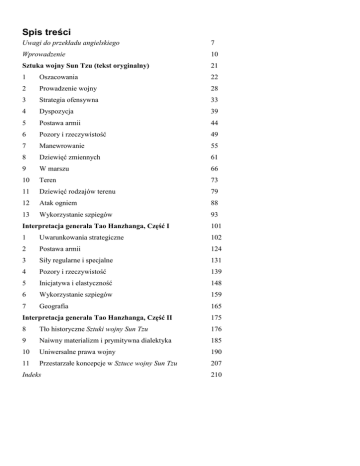 Spis treści Uwagi do przekładu angielskiego 7 Wprowadzenie 10 Sztuka wojny Sun Tzu (tekst oryginalny) 21 1 Oszacowania 22 2 Prowadzenie wojny 28 3 Strategia ofensywna 33 4 Dyspozycja 39 5 Postawa armii 44 6 Pozory i rzeczywistość 49 7 Manewrowanie 55 8 Dziewięć zmiennych 61 9 W marszu 66 10 Teren 73 11 Dziewięć rodzajów terenu 79 12 Atak ogniem 88 13 Wykorzystanie szpiegów 93 Interpretacja generała Tao Hanzhanga, Część I 101 1 Uwarunkowania strategiczne 102 2 Postawa armii 124 3 Siły regularne i specjalne 131 4 Pozory i rzeczywistość 139 5 Inicjatywa i elastyczność 148 6 Wykorzystanie szpiegów 159 7 Geografia 165 Interpretacja generała Tao Hanzhanga, Część II 175 8 Tło historyczne Sztuki wojny Sun Tzu 176 9 Naiwny materializm i prymitywna dialektyka 185 10 Uniwersalne prawa wojny 190 11 Przestarzałe koncepcje w Sztuce wojny Sun Tzu 207 Indeks 210