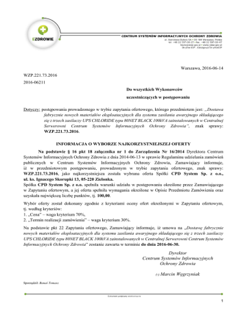 Warszawa, 2016-06-14 WZP.221.73.2016 2016-06211 Do wszystkich Wykonawców uczestniczących w postępowaniu Dotyczy: postępowania prowadzonego w trybie zapytania ofertowego, którego przedmiotem jest: „Dostawa fabrycznie nowych materiałów eksploatacyjnych dla systemu zasilania awaryjnego składającego się z trzech zasilaczy UPS CHLORIDE typu 80NET BLACK 100kVA zainstalowanych w Centralnej Serwerowni Centrum Systemów Informacyjnych Ochrony Zdrowia”, znak sprawy: WZP.221.73.2016. INFORMACJA O WYBORZE NAJKORZYSTNIEJSZEJ OFERTY Na podstawie § 16 pkt 18 załącznika nr 1 do Zarządzenia Nr 16/2014 Dyrektora Centrum Systemów Informacyjnych Ochrony Zdrowia z dnia 2014-06-13 w sprawie Regulaminu udzielania zamówień publicznych w Centrum Systemów Informacyjnych Ochrony Zdrowia, Zamawiający informuje, iż w przedmiotowym postępowaniu, prowadzonym w trybie zapytania ofertowego, znak sprawy: WZP.221.73.2016, jako najkorzystniejsza została wybrana oferta Spółki CPD System Sp. z o.o., ul. ks. Ignacego Skorupki 13, 05-220 Zielonka. Spółka CPD System Sp. z o.o. spełniła warunki udziału w postępowaniu określone przez Zamawiającego w Zapytaniu ofertowym, a jej oferta spełniła wymagania określone w Opisie Przedmiotu Zamówienia oraz uzyskała największą liczbę punktów, tj. 100,00. Wybór oferty został dokonany zgodnie z kryteriami oceny ofert określonymi w Zapytaniu ofertowym, tj. według kryteriów: 1. „Cena” – waga kryterium 70%, 2. „Termin realizacji zamówienia” – waga kryterium 30%. Na podstawie pkt 22 Zapytania ofertowego, Zamawiający informuje, iż umowa na „Dostawę fabrycznie nowych materiałów eksploatacyjnych dla systemu zasilania awaryjnego składającego się z trzech zasilaczy UPS CHLORIDE typu 80NET BLACK 100kVA zainstalowanych w Centralnej Serwerowni Centrum Systemów Informacyjnych Ochrony Zdrowia” zostanie zawarta w terminie do dnia 2016-06-30. Dyrektor Centrum Systemów Informacyjnych Ochrony Zdrowia (-) Marcin Węgrzyniak Sporządził: Banaś Tomasz 1