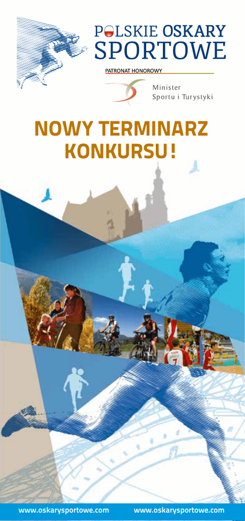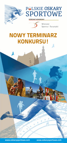 POLSKIE NOWY terminarz KONKURSU! www.oskarysportowe.com www.oskarysportowe.com UWAGA NOWY terminarz KONKURSU! czekamy na twoje zgłoszenie DO 9 MAJa! ETAPY KONKURSU termin 11.02.2013 - 09.05.2013 Przyjmowanie zgłoszeń do Konkursu Prace Kapituły kwalifikujące zgłoszone projekty do II etapu Konkursu 10.05.2013 - 30.05.2013 Ogłoszenie listy projektów zakwalifikowanych do II etapu Konkursu 31.05.2013 Głosowanie internautów on-line na wybrane projekty 1.06 - 6.09.2013 Ogłoszenie listy projektów nominowanych do nagrody Gala wręczenia nagród zwycięzcom 9.09.2013 wrzesień 2013 Pytania oraz zgłoszenia do Konkursu prosimy kierować: • na adres mailowy: [email protected], • na adres pocztowy: Urząd Pocztowy Poznań 29, • Skrytka Pocztowa nr 7, 60-995 Poznań lub pod numerem telefonu: 511 193 898 www.oskarysportowe.com www.oskarysportowe.com Zgłoszenia do konkursu Jeżeli: yy organizujecie Państwo wyjątkowe imprezy sportowe i rekreacyjne dla mieszkańców, yy posiadacie obiekty turystyczne z niespotykaną ofertą aktywnego wypoczynku, yy macie sukcesy w sporcie indywidualnym i zespołowym, yy organizujecie zajęcia sportowe i rekreacyjne dla dzieci, młodzieży, seniorów, osób niepełnosprawnych, yy z sukcesem prowadzicie działania w zakresie marketingu sportowego i promocji, yy współpracujecie z podmiotami, które aktywnie wspierają sport poprzez sponsoring Już teraz zgłoście się do Konkursu. Wypełnijcie formularz zgłoszeniowy na stronie www.oskarysportowe.com. Pobierzcie ze strony Konkursu materiały promocyjne. Rozdajcie je w miejscu pracy, wypoczynku i zamieszkania. Zainteresujcie innych swoim projektem. Pamiętajcie! To głosowanie internautów, fanów Waszego projektu zdecyduje o Waszym zwycięstwie! O konkursie Ogólnopolski konkurs Polskie Oskary Sportowe skierowany jest do społeczności lokalnych zaangażowanych w aktywności sportowe, a jego celem jest wyłonienie i nagrodzenie najciekawszych projektów oraz sylwetek osób promujących sport, turystykę i rekreację w Polsce. Konkurs objęty jest honorowym patronatem Ministra Sportu i Turystyki oraz Związku Miast Polskich. Nagrodą w Konkursie jest prestiżowa statuetka Polskich Oskarów Sportowych, która zostanie wręczona podczas uroczystej Gali we wrześniu 2013 roku. Ponadto, zwycięzcy każdej z ośmiu kategorii otrzymają profesjonalne wsparcie specjalistów z dziedziny Public Relations, sponsoringu sportowego, promocji i reklamy, w formie pakietu usług. Regulamin oraz więcej informacji o Konkursie na www.oskarysportowe.com www.oskarysportowe.com www.oskarysportowe.com Organizator Organizatorem Konkursu jest Fundacja Sportowe Marzenia – Forum Ludzi Aktywnych, założona przez ludzi, których pasją jest sport. Głównym celem Fundacji jest działalność charytatywna na rzecz rozwoju i popularyzacji sportu, aktywnego i zdrowego stylu życia, zwłaszcza wśród dzieci i młodzieży oraz osób niepełnosprawnych. Fundacja organizuje wydarzenia sportowe, konferencje, spotkania, prelekcje i plebiscyty mające na celu rozpowszechnianie wiedzy o kulturze fizycznej. Działania Fundacji wspierają Wolontariusze, Ambasadorzy i Przyjaciele. SPORTOWE MARZENIA forum ludzi aktywnych Fundacja Sportowe Marzenia Forum Ludzi Aktywnych [email protected] www.sportowemarzenia.pl FUNDACJA Sportowe Marzenia FORUM Ludzi Aktywnych; 60-681 Poznań, ul. Władysława Syrokomli 20; tel. 511 193 898; Sąd Rejonowy Poznań – Nowe Miasto Wilda w Poznaniu VIII Wydział Gospodarczy KRS 0000428783; REGON: 302177176; NIP: 972-12-40-302 e-mail: [email protected] www.sportowemarzenia.pl PATRONI MEDIALNI: www.oskarysportowe.com www.oskarysportowe.com