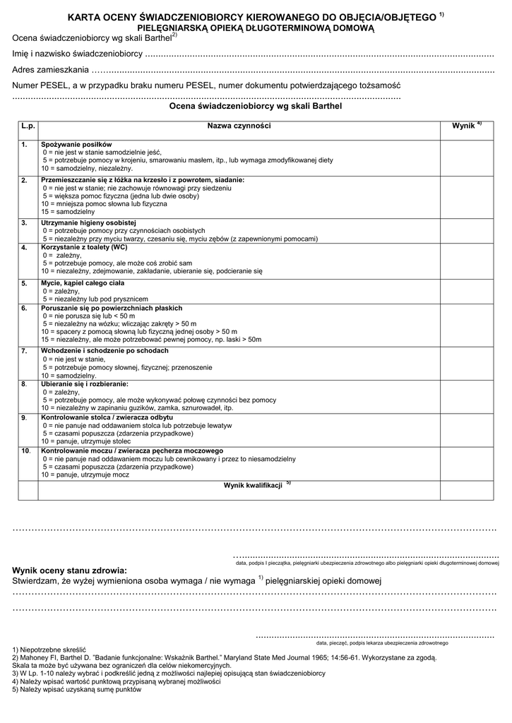 KARTA OCENY ŚWIADCZENIOBIORCY KIEROWANEGO DO OBJĘCIA/OBJĘTEGO 1) PIELĘGNIARSKĄ OPIEKĄ DŁUGOTERMINOWĄ DOMOWĄ 2) Ocena świadczeniobiorcy wg skali Barthel Imię i nazwisko świadczeniobiorcy ..................................................................................................................................... Adres zamieszkania ……................................................................................................................................................... Numer PESEL, a w przypadku braku numeru PESEL, numer dokumentu potwierdzającego tożsamość .................................................................................................................................................... Ocena świadczeniobiorcy wg skali Barthel L.p. Nazwa czynności Wynik 1. Spożywanie posiłków 0 = nie jest w stanie samodzielnie jeść, 5 = potrzebuje pomocy w krojeniu, smarowaniu masłem, itp., lub wymaga zmodyfikowanej diety 10 = samodzielny, niezależny. 2. Przemieszczanie się z łóżka na krzesło i z powrotem, siadanie: 0 = nie jest w stanie; nie zachowuje równowagi przy siedzeniu 5 = większa pomoc fizyczna (jedna lub dwie osoby) 10 = mniejsza pomoc słowna lub fizyczna 15 = samodzielny 3. Utrzymanie higieny osobistej 0 = potrzebuje pomocy przy czynnościach osobistych 5 = niezależny przy myciu twarzy, czesaniu się, myciu zębów (z zapewnionymi pomocami) Korzystanie z toalety (WC) 0 = zależny, 5 = potrzebuje pomocy, ale może coś zrobić sam 10 = niezależny, zdejmowanie, zakładanie, ubieranie się, podcieranie się 4. 5. 6. 7. 8. 9. 10. 4) Mycie, kąpiel całego ciała 0 = zależny, 5 = niezależny lub pod prysznicem Poruszanie się po powierzchniach płaskich 0 = nie porusza się lub < 50 m 5 = niezależny na wózku; wliczając zakręty > 50 m 10 = spacery z pomocą słowną lub fizyczną jednej osoby > 50 m 15 = niezależny, ale może potrzebować pewnej pomocy, np. laski > 50m Wchodzenie i schodzenie po schodach 0 = nie jest w stanie, 5 = potrzebuje pomocy słownej, fizycznej; przenoszenie 10 = samodzielny. Ubieranie się i rozbieranie: 0 = zależny, 5 = potrzebuje pomocy, ale może wykonywać połowę czynności bez pomocy 10 = niezależny w zapinaniu guzików, zamka, sznurowadeł, itp. Kontrolowanie stolca / zwieracza odbytu 0 = nie panuje nad oddawaniem stolca lub potrzebuje lewatyw 5 = czasami popuszcza (zdarzenia przypadkowe) 10 = panuje, utrzymuje stolec Kontrolowanie moczu / zwieracza pęcherza moczowego 0 = nie panuje nad oddawaniem moczu lub cewnikowany i przez to niesamodzielny 5 = czasami popuszcza (zdarzenia przypadkowe) 10 = panuje, utrzymuje mocz Wynik kwalifikacji 5) ………………………………………………………………………………………………………………………………………. ….................................................................................................. data, podpis I pieczątka, pielęgniarki ubezpieczenia zdrowotnego albo pielęgniarki opieki długoterminowej domowej Wynik oceny stanu zdrowia: Stwierdzam, że wyżej wymieniona osoba wymaga / nie wymaga 1) pielęgniarskiej opieki domowej ………………………………………………………………………………………………………………………………………. ………………………………………………………………………………………………………………………………………. ........................................................................................... data, pieczęć, podpis lekarza ubezpieczenia zdrowotnego 1) Niepotrzebne skreślić 2) Mahoney FI, Barthel D. ”Badanie funkcjonalne: Wskaźnik Barthel.” Maryland State Med Journal 1965; 14:56-61. Wykorzystane za zgodą. Skala ta może być używana bez ograniczeń dla celów niekomercyjnych. 3) W Lp. 1-10 należy wybrać i podkreślić jedną z możliwości najlepiej opisującą stan świadczeniobiorcy 4) Należy wpisać wartość punktową przypisaną wybranej możliwości 5) Należy wpisać uzyskaną sumę punktów