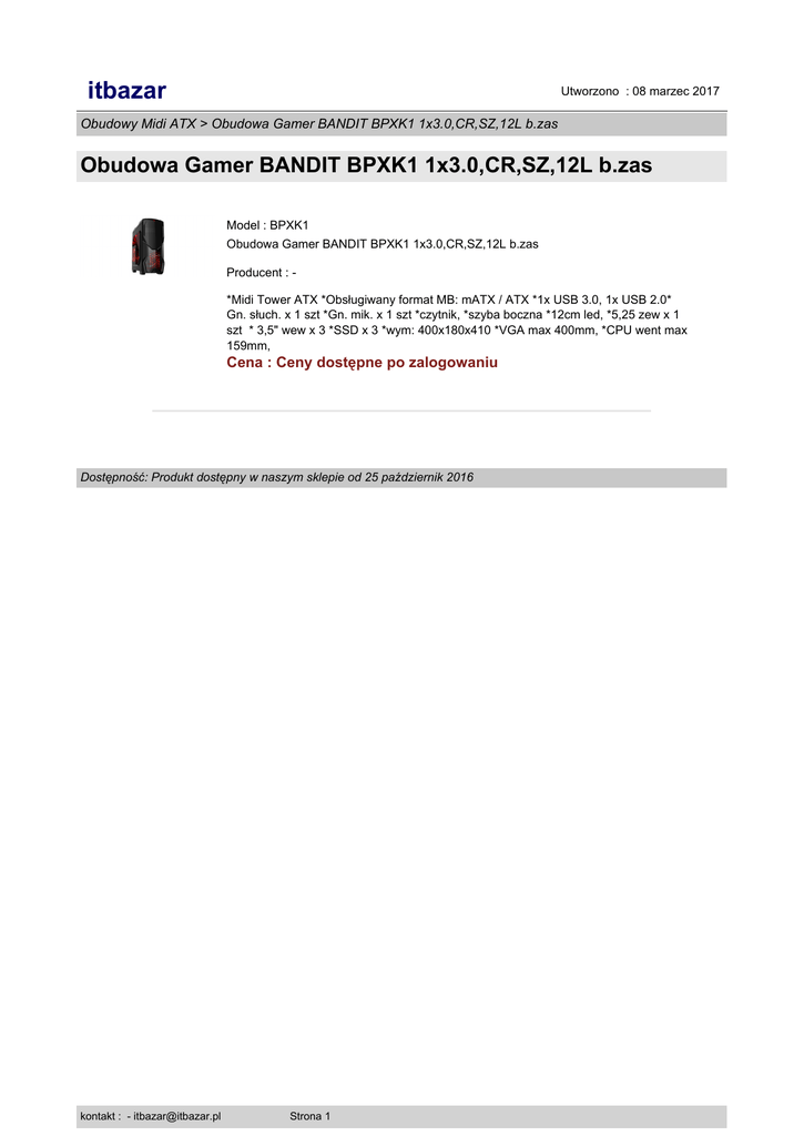 itbazar Utworzono : 08 marzec 2017 Obudowy Midi ATX > Obudowa Gamer BANDIT BPXK1 1x3.0,CR,SZ,12L b.zas Obudowa Gamer BANDIT BPXK1 1x3.0,CR,SZ,12L b.zas Model : BPXK1 Obudowa Gamer BANDIT BPXK1 1x3.0,CR,SZ,12L b.zas Producent : *Midi Tower ATX *Obsługiwany format MB: mATX / ATX *1x USB 3.0, 1x USB 2.0* Gn. słuch. x 1 szt *Gn. mik. x 1 szt *czytnik, *szyba boczna *12cm led, *5,25 zew x 1 szt * 3,5" wew x 3 *SSD x 3 *wym: 400x180x410 *VGA max 400mm, *CPU went max 159mm, Cena : Ceny dostępne po zalogowaniu Dostępność: Produkt dostępny w naszym sklepie od 25 październik 2016 kontakt : - [email protected] Strona 1