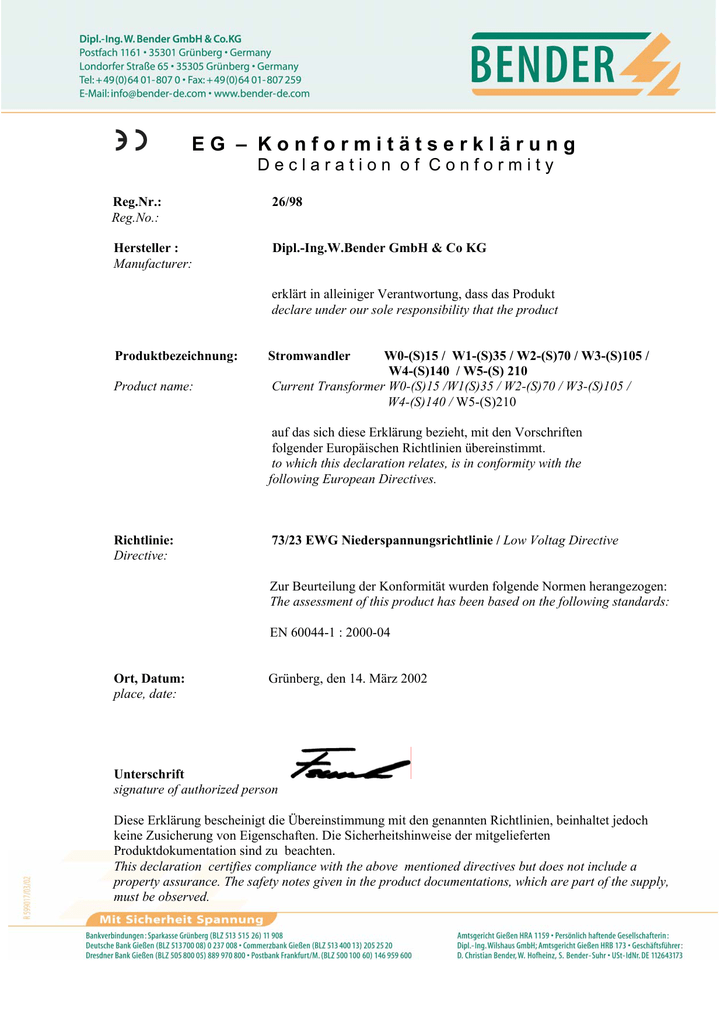 EG – Konformitätserklärung Declaration of Conformity Reg.Nr.: Reg.No.: 26/98 Hersteller : Manufacturer: Dipl.-Ing.W.Bender GmbH & Co KG erklärt in alleiniger Verantwortung, dass das Produkt declare under our sole responsibility that the product Produktbezeichnung: Product name: Stromwandler W0-(S)15 / W1-(S)35 / W2-(S)70 / W3-(S)105 / W4-(S)140 / W5-(S) 210 Current Transformer W0-(S)15 /W1(S)35 / W2-(S)70 / W3-(S)105 / W4-(S)140 / W5-(S)210 auf das sich diese Erklärung bezieht, mit den Vorschriften folgender Europäischen Richtlinien übereinstimmt. to which this declaration relates, is in conformity with the following European Directives. Richtlinie: Directive: 73/23 EWG Niederspannungsrichtlinie / Low Voltag Directive Zur Beurteilung der Konformität wurden folgende Normen herangezogen: The assessment of this product has been based on the following standards: EN 60044-1 : 2000-04 Ort, Datum: place, date: Grünberg, den 14. März 2002 Unterschrift signature of authorized person Diese Erklärung bescheinigt die Übereinstimmung mit den genannten Richtlinien, beinhaltet jedoch keine Zusicherung von Eigenschaften. Die Sicherheitshinweise der mitgelieferten Produktdokumentation sind zu beachten. This declaration certifies compliance with the above mentioned directives but does not include a property assurance. The safety notes given in the product documentations, which are part of the supply, must be observed. Dipl.-Ing. W.Bender GmbH + Co. KG Carl Benz Str. 8 D-35305 Grünberg tel.:(0-49) 6401 8070 fax:(0-49) 6401 807279 Przedstawiciel na Polskę: BIURO PROJEKTÓW I USŁUG INWESTORSKICH 91-492 Łódź, ul. Bema 50; tel.: (0-42) 6594261; tel./faks: (0-42) 6594262 E-mail: [email protected] Deklaracja zgodności z dyrektywami Unii Europejskiej Deklaracja Nr 26/98 Wytwórca: Dipl.-Ing. W.Bender GmbH&Co KG Adres: Londorfer Str. 65, 35305 Grünberg deklaruje na własną odpowiedzialność, że urządzenie Nazwa urządzenia: Przekładniki pomiarowe W0-(S)15 / W1-(S)35 / W2-(S)70 / W3-(S)105 / W5-(S)210 do których odnosi się niniejsza deklaracja, są wykonane zgodnie z przepisami następujących dyrektyw europejskich Dyrektywa: 73/23 EWG Niederspannungsrichtlinie Low Voltage Directive Zgodność ta zostaje zapewniona przez spełnienie wymagań następujących norm: EN 60044-1: Miejscowość, data: 2000-04 Grünberg, 14 marca 2002 Podpis osoby odpowiedzialnej: Za zgodność z oryginałem Jarosław Mielczarek Niniejsza deklaracja poświadcza zgodność wykonania urządzenia z wymienionymi dyrektywami, nie oznacza jednak zapewnienia jego bezbłędnego działania. Należy przestrzegać wskazówek bezpieczeństwa zawartych w dostarczanej z urządzeniem dokumentacji technicznej.