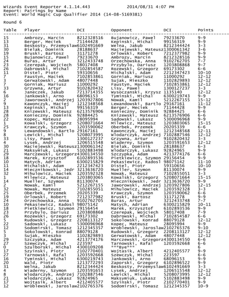 Wizards Event Reporter 4.1.14.443 2014/08/31 4:07 PM Report: Pairings by Name Event: World Magic Cup Qualifier 2014 (14-08-5169381) Round 6 Table Player DCI Opponent DCI Points -------------------------------------------------------------------------------------15 Ambrozy, Marcin 8212328516 Bujanowicz, Pawel 79233670 9-9 13 Berger, Meciek 71144428 Kepinski, Michal 99156319 9-9 31 Beskosty, Przemyslaw6102491669 Welna, Jakub 8212344424 3-3 30 Bielak, Dominik 28188637 Maciejewski, Mateusz1300061342 3-6 19 Bruski, Bartosz 31171278 Orlowski, Robert 7212377982 9-9 15 Bujanowicz, Pawel 79233670 Ambrozy, Marcin 8212328516 9-9 24 Buras, Artur 3212433748 Orzechowska, Anna 9102762705 7-7 23 Czerepak, Wojciech 58017408 Przybylo, Dariusz 1203808868 9-7 26 Dabrowski, Michal 7102854587 Rozewski, Grzegorz 69173302 6-6 11 Distel, Piotr 59310656 Michalski, Adam 2212347423 10-10 7 Faustyn, Maciek 7102853861 Gorniak, Mariusz 11000292 12-12 3 Gerwatowski, Adam 48077448 Sujak, Mieszko 1102829893 12-12 7 Gorniak, Mariusz 11000292 Faustyn, Maciek 7102853861 12-12 33 Grzywna, Artur 9102820432 Lisy, Pawel 1300127237 3-3 6 Janeczek, Jakub 7213714355 Wysoczanski, Krzysz 1135140 12-12 16 Jankowski, Arno 68096153 Tyminski, Michal 6300219743 9-9 2 Jaworowski, Andrzej 1203927806 Nowak, Kamil 5212267155 15-12 9 Kawonczyk, Maciej 1212348568 Lewandowski, Bartlo 29167161 11-12 13 Kepinski, Michal 99156319 Berger, Meciek 71144428 9-9 28 Knizewski, Mateusz 6213576906 Konieczny, Dominik 92884425 6-6 28 Konieczny, Dominik 92884425 Knizewski, Mateusz 6213576906 6-6 22 Kopec, Mateusz 28095994 Sadowski, Lukasz 5300096968 9-9 1 Kowalski, Grzegorz 5208071664 Milewicz, Mateusz 1203803065 15-15 25 Krawczyk, Szymon 1203590062 Oberbek, Przemek 20205339 6-6 9 Lewandowski, Bartlo 29167161 Kawonczyk, Maciej 1212348568 12-11 8 Lewicki, Michal 5208073995 Wlodarczyk, Andrzej 7102887546 12-12 33 Lisy, Pawel 1300127237 Grzywna, Artur 9102820432 3-3 4 Lysek, Andrzej 1206515548 Wiaderny, Szymon 1203591653 12-12 30 Maciejewski, Mateusz1300061342 Bielak, Dominik 28188637 6-3 21 Maksymiuk, Lukasz 5102883498 Wlodarczyk, Lukasz 92824965 9-9 29 Marczewski, Grzegorz4300134550 Szczypka, Adam 4213774176 6-6 18 Marek, Krzysztof 6102893536 Pietkiewicz, Szymon 29156454 9-9 10 Matych, Adrian 6300215829 Pekasiewicz, Radosl 98075142 11-10 11 Michalski, Adam 2212347423 Distel, Piotr 59310656 10-10 14 Miecznikowski, Jedr 3213636720 Mueller, Szymon 81130074 9-9 32 Mihulowicz, Maciek 1203592328 Nowak, Mateusz 7102855051 3-3 1 Milewicz, Mateusz 1203803065 Kowalski, Grzegorz 5208071664 15-15 14 Mueller, Szymon 81130074 Miecznikowski, Jedr 3213636720 9-9 2 Nowak, Kamil 5212267155 Jaworowski, Andrzej 1203927806 12-15 32 Nowak, Mateusz 7102855051 Mihulowicz, Maciek 1203592328 3-3 25 Oberbek, Przemek 20205339 Krawczyk, Szymon 1203590062 6-6 19 Orlowski, Robert 7212377982 Bruski, Bartosz 31171278 9-9 24 Orzechowska, Anna 9102762705 Buras, Artur 3212433748 7-7 10 Pekasiewicz, Radosl 98075142 Matych, Adrian 6300215829 10-11 18 Pietkiewicz, Szymon 29156454 Marek, Krzysztof 6102893536 9-9 23 Przybylo, Dariusz 1203808868 Czerepak, Wojciech 58017408 7-9 26 Rozewski, Grzegorz 69173302 Dabrowski, Michal 7102854587 6-6 5 Rudowski, Grzegorz 2208113127 Sokolowski, Konrad 88079128 12-12 22 Sadowski, Lukasz 5300096968 Kopec, Mateusz 28095994 9-9 12 Sodomirski, Tomasz 1212345357 Wroblewski, Jaroslaw2102765376 9-10 5 Sokolowski, Konrad 88079128 Rudowski, Grzegorz 2208113127 12-12 3 Sujak, Mieszko 1102829893 Gerwatowski, Adam 48077448 12-12 29 Szczypka, Adam 4213774176 Marczewski, Grzegorz4300134550 6-6 27 Szewczyk, Michal 223597 Tarnowski, Rafal 1203592668 6-6 0 Szulborski, Michal 4300109208 ***Bye*** 6 17 Szyinski, Piotr 2102770401 Wojtasik, Albert 4212405577 9-9 27 Tarnowski, Rafal 1203592668 Szewczyk, Michal 223597 6-6 16 Tyminski, Michal 6300219743 Jankowski, Arno 68096153 9-9 20 Wald, Piotr 1213772293 Zaporski, Grzegorz 6102896522 9-9 31 Welna, Jakub 8212344424 Beskosty, Przemyslaw6102491669 3-3 4 Wiaderny, Szymon 1203591653 Lysek, Andrzej 1206515548 12-12 8 Wlodarczyk, Andrzej 7102887546 Lewicki, Michal 5208073995 12-12 21 Wlodarczyk, Lukasz 92824965 Maksymiuk, Lukasz 5102883498 9-9 17 Wojtasik, Albert 4212405577 Szyinski, Piotr 2102770401 9-9 12 Wroblewski, Jaroslaw2102765376 Sodomirski, Tomasz 1212345357 10-9 6 20 Wysoczanski, Krzysz 1135140 Zaporski, Grzegorz 6102896522 Janeczek, Jakub Wald, Piotr 7213714355 1213772293 Wizards Event Reporter v4.0 - Copyright © 2014 - Wizards of the Coast LLC 12-12 9-9