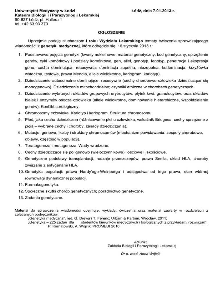 Uniwersytet Medyczny w Łodzi Katedra Biologii i i Parazytologii Lekarskiej 90-627 Łódź, pl. Hallera 1 tel. +42 63 93 370 Łódź, dnia 7.01.2013 r. OGŁOSZENIE Uprzejmie podaję słuchaczom I roku Wydziału Lekarskiego tematy ćwiczenia sprawdzającego wiadomości z genetyki medycznej, które odbędzie się 16 stycznia 2013 r.: 1. Podstawowe pojęcia genetyki (kwasy nukleinowe, materiał genetyczny, kod genetyczny, sprzężenie genów, cykl komórkowy i podziały komórkowe, gen, allel, genotyp, fenotyp, penetracja i ekspresja genu, cecha dominująca, recesywna, dominacja zupełna, niezupełna, kodominacja, krzyżówka wsteczna, testowa, prawa Mendla, allele wielokrotne, kariogram, kariotyp). 2. Dziedziczenie autosomalne dominujące, recesywne (cechy chorobowe człowieka dziedziczące się monogenowo). Dziedziczenie mitochondrialne; czynniki etniczne w chorobach genetycznych. 3. Dziedziczenie wybranych układów grupowych erytrocytów, płytek krwi, granulocytów, oraz układów białek i enzymów osocza człowieka (allele wielokrotne, dominowanie hierarchiczne, współdziałanie genów). Konflikt serologiczny. 4. Chromosomy człowieka. Kariotyp i kariogram. Struktura chromosomu. 5. Płeć, jako cecha dziedziczna (różnicowanie płci u człowieka, wskaźnik Bridgesa, cechy sprzężone z płcią – wybrane cechy i choroby, zasady dziedziczenia). 6. Mutacje: genowe, liczby i struktury chromosomów (mechanizm powstawania, zespoły chorobowe, objawy, częstość w populacji). 7. Teratogeneza i mutageneza. Wady wrodzone. 8. Cechy dziedziczące się poligenowo (wieloczynnikowe) ilościowe i jakościowe. 9. Genetyczne podstawy transplantacji, rodzaje przeszczepów, prawa Snella, układ HLA, choroby związane z antygenami HLA. 10. Genetyka populacji: prawo Hardy’ego-Weinberga i odstępstwa od tego prawa, stan wtórnej równowagi dynamicznej populacji. 11. Farmakogenetyka. 12. Społeczne skutki chorób genetycznych; poradnictwo genetyczne. 13. Zadania genetyczne. Materiał do sprawdzenia wiadomości obejmuje: wykłady, ćwiczenia oraz materiał zawarty w rozdziałach z zalecanych podręczników; „Genetyka medyczna”, red. G. Drewa i T. Ferenc; Urbam & Partner, Wrocław, 2011; „Genetyka – 225 zadań dla studentów kierunków medycznych i biologicznych z przykładami rozwiązań”, P. Kurnatowski, A. Wójcik, PROMEDI 2010. Adiunkt Zakładu Biologii i Parazytologii Lekarskiej Dr n. med. Anna Wójcik