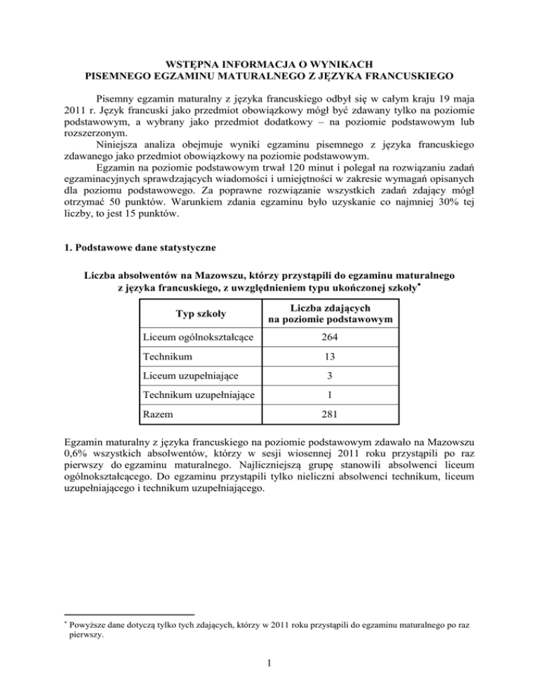 WSTĘPNA INFORMACJA O WYNIKACH PISEMNEGO EGZAMINU MATURALNEGO Z JĘZYKA FRANCUSKIEGO Pisemny egzamin maturalny z języka francuskiego odbył się w całym kraju 19 maja 2011 r. Język francuski jako przedmiot obowiązkowy mógł być zdawany tylko na poziomie podstawowym, a wybrany jako przedmiot dodatkowy – na poziomie podstawowym lub rozszerzonym. Niniejsza analiza obejmuje wyniki egzaminu pisemnego z języka francuskiego zdawanego jako przedmiot obowiązkowy na poziomie podstawowym. Egzamin na poziomie podstawowym trwał 120 minut i polegał na rozwiązaniu zadań egzaminacyjnych sprawdzających wiadomości i umiejętności w zakresie wymagań opisanych dla poziomu podstawowego. Za poprawne rozwiązanie wszystkich zadań zdający mógł otrzymać 50 punktów. Warunkiem zdania egzaminu było uzyskanie co najmniej 30% tej liczby, to jest 15 punktów. 1. Podstawowe dane statystyczne Liczba absolwentów na Mazowszu, którzy przystąpili do egzaminu maturalnego z języka francuskiego, z uwzględnieniem typu ukończonej szkoły Typ szkoły Liczba zdających na poziomie podstawowym Liceum ogólnokształcące 264 Technikum 13 Liceum uzupełniające 3 Technikum uzupełniające 1 Razem 281 Egzamin maturalny z języka francuskiego na poziomie podstawowym zdawało na Mazowszu 0,6% wszystkich absolwentów, którzy w sesji wiosennej 2011 roku przystąpili po raz pierwszy do egzaminu maturalnego. Najliczniejszą grupę stanowili absolwenci liceum ogólnokształcącego. Do egzaminu przystąpili tylko nieliczni absolwenci technikum, liceum uzupełniającego i technikum uzupełniającego. Powyższe dane dotyczą tylko tych zdających, którzy w 2011 roku przystąpili do egzaminu maturalnego po raz pierwszy. 1 Liczba absolwentów na Mazowszu, którzy z egzaminu maturalnego z języka francuskiego, zdawanego jako przedmiot wybrany obowiązkowo, uzyskali co najmniej 30% punktów Liczba zdających, którzy uzyskali co najmniej 30% pkt. Liczba zdających, którzy nie uzyskali co najmniej 30% pkt. Procent zdających, którzy uzyskali co najmniej 30% pkt. Zdający na poziomie podstawowym 258 255 3 98,84% 12 11 1 91,67% Liceum uzupełniające 3 3 0 100,00% Technikum uzupełniające 1 1 0 100,00% 274 270 4 98,54% Liczba zdających Typ szkoły Liceum ogólnokształcące Technikum Razem Ogółem 98,54% absolwentów zdających egzamin maturalny z języka francuskiego jako przedmiot obowiązkowy uzyskało co najmniej 30% punktów możliwych do otrzymania za rozwiązanie zadań na poziomie podstawowym. Procent absolwentów, którzy przekroczyli ten próg jest największy w przypadku absolwentów liceów uzupełniających i techników uzupełniających i wynosi 100%. Należy jednak pamiętać, że w tych typach szkół do egzaminu z języka francuskiego przystąpiły pojedyncze osoby. Najniższą zdawalność mieli absolwenci techników (91,67%). Zdawalność w najliczniejszej grupie abiturientów absolwentów liceów ogólnokształcących - wynosi ogółem 98,84%. 2. Analiza wyników egzaminu ze względu na miary tendencji centralnej Poziom podstawowy Dane statystyczne (w ujęciu procentowym) dotyczące wyników egzaminu maturalnego z języka francuskiego na poziomie podstawowym zamieszczone są w poniższej tabeli. Średni wynik Środkowy wynik (mediana) Wynik najczęściej się powtarzający (modalna) Odchylenie standardowe Wynik najniższy Wynik najwyższy Rozstęp 81,89 88,00 100,00 17,54 25,00 100,00 75,00 Średni wynik dla całego województwa wynosi 81,89% (40,95 pkt) i sytuuje się dużo powyżej progu zaliczenia egzaminu na poziomie podstawowym (30%). Najwyższy uzyskany wynik to 100% i jest on równy maksymalnej liczbie punktów za zadania (50,00 pkt). Wynik najniższy to 25% (12,50 pkt), czyli rozstęp wyników wyniósł 75% (37,50 pkt). Wynik Powyższe dane dotyczą tylko tych zdających, którzy w 2011 roku przystąpili po raz pierwszy do 5 egzaminów obowiązkowych. 2 środkowy (44,00 pkt) stanowi 88% maksymalnej liczby punktów i jest wyższy od średniego wyniku za zadania na poziomie podstawowym. Wynik najczęściej się powtarzający jest równy maksymalnej liczbie punktów możliwych do uzyskania (50,00 pkt). Odchylenie standardowe wynosi 17,54% (8,77 pkt), co oznacza, że większość zdających uzyskała wyniki w granicach od 32,00 do 50,00 punktów. Średnie wyniki (w ujęciu procentowym) egzaminu maturalnego z języka francuskiego dla województwa mazowieckiego z podziałem na typy szkół Typ szkoły Średni wynik dla zdających język francuski na poziomie podstawowym Liceum ogólnokształcące 83,30 Technikum 54,50 Liceum uzupełniające 72,66 Technikum uzupełniające 78,00 Razem 81,89 Najlepszy wynik egzaminu maturalnego z języka francuskiego na poziomie podstawowym uzyskali absolwenci liceów ogólnokształcących i jest on wyższy od średniego wyniku obliczonego dla województwa. Najsłabszy wynik uzyskali absolwenci technikum. Wynik oznaczony gwiazdką nie jest wynikiem średnim, ale wynikiem jednej osoby. 3