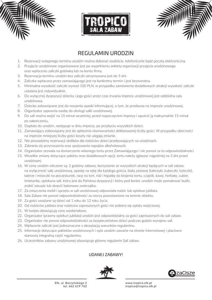regulamin urodzin - Sala Zabaw Tropico w Ełku