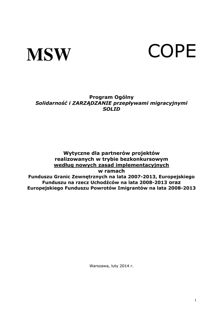 COPE MSW Program Ogólny Solidarność i ZARZĄDZANIE przepływami migracyjnymi SOLID Wytyczne dla partnerów projektów realizowanych w trybie bezkonkursowym według nowych zasad implementacyjnych w ramach Funduszu Granic Zewnętrznych na lata 2007-2013, Europejskiego Funduszu na rzecz Uchodźców na lata 2008-2013 oraz Europejskiego Funduszu Powrotów Imigrantów na lata 2008-2013 Warszawa, luty 2014 r. 1 SPIS TREŚCI ROZDZIAŁ 1. WPROWADZENIE ....................................................................................................... 3 1.1. INFORMACJE OGÓLNE................................................................................................................................ 3 1.1.1 Fundusz Granic Zewnętrznych 1.1.2 Europejski Fundusz na rzecz Uchodźców ..................................................... 6 1.1.3 Europejski Fundusz Powrotów Imigrantów .................................................. 6 1.2. SŁOWNICZEK ............................................................................................................................................. 7 ROZDZIAŁ 2. KWALIFIKOWALNOŚĆ WYDATKÓW .................................................................. 8 2.1 POSTAWY PRAWNE...................................................................................................................................... 8 2.2 OGÓLNE ZASADY KWALIFIKOWALNOŚCI ................................................................................................. 11 2.3 OKRES KWALIFIKOWALNOŚCI .................................................................................................................. 16 2.4 ZASIĘG TERYTORIALNY ............................................................................................................................ 16 2.5 KATEGORIE WYDATKÓW ........................................................................................................................... 17 2.6 WYDATKI NIEKWALIFIKOWALNE .............................................................................................................. 32 2.7 DOKUMENTOWANIE KOSZTÓW I WYDATKÓW ......................................................................................... 33 2.8 WKŁADY RZECZOWE ................................................................................................................................. 34 2.9 PRZYCHÓD WYGENEROWANY PRZEZ PROJEKT ........................................................................................ 34 2.10 ZMIANA BUDŻETU PROJEKTU ................................................................................................................. 35 2.11 KSIĘGOWANIE KOSZTÓW I WYDATKÓW PROJEKTU.............................................................................. 35 ROZDZIAŁ 3. POZOSTAŁE WYMAGANIA PROGRAMOWE ................................................... 36 3.1 ARCHIWIZACJA DOKUMENTÓW ................................................................................................................ 36 3.2 INFORMACJA I PROMOCJA ........................................................................................................................ 36 ROZDZIAŁ 4. POŚWIADCZANIE WYDATKÓW ......................................................................... 42 4.1 SYSTEM RAPORTOWANIA.......................................................................................................................... 42 4.1.1 Projekty o charakterze inwestycyjnym .......................................................43 4.2 KOMPLETOWANIE NIEZBĘDNEJ DOKUMENTACJI ..................................................................................... 47 4.3 POTWIERDZANIE DOKUMENTÓW.............................................................................................................. 48 4.4 ZADANIA INSTYTUCJI DELEGOWANEJ ..................................................................................................... 48 4.5 INNE INSTYTUCJE UPOWAŻNIONE DO KONTROLI I AUDYTU ................................................................... 49 ROZDZIAŁ 5. ZAŁĄCZNIKI ............................................................................................................... 51 5.1 WZÓR OŚWIADCZENIA W ZAKRESIE WIĄŻĄCEJ INTERPRETACJI PRAWA PODATKOWEGO.................... 51 5.2 WZÓR OŚWIADCZENIA W ZAKRESIE WYNAGRODZEŃ I POCHODNYCH OD WYNAGRODZEŃ................. 52 5.3 WZÓR KARTY CZASU PRACY..................................................................................................................... 53 5.4 WZÓR OŚWIADCZENIA O KOSZTACH POŚREDNICH ................................................................................ 54 2 Rozdział 1. WPROWADZENIE 1.1. Informacje ogólne Zadaniem niniejszych wytycznych jest przedstawienie Partnerom projektów realizowanych w ramach Funduszu Granic Zewnętrznych na lata 2007-2013 (dalej FGZ), Europejskiego Funduszu na rzecz Uchodźców na lata 2008-2013 (dalej EFU) oraz Europejskiego Funduszu Powrotów Imigrantów na lata 2008-2013 (dalej EFPI) ram prawnych kwalifikowalności wydatków oraz procedur poświadczania wydatków przez krajowe instytucje do tego uprawnione zgodnie z zatwierdzonym Systemem Zarządzania i Kontroli. Wytyczne zawierają szereg informacji pomocnych w określeniu rodzajów kosztów i wydatków kwalifikujących się do współfinansowania ze środków FGZ/EFU/EFPI oraz sposobów ich dokumentowania w celu prawidłowego rozliczenia projektu. Uwaga! Niniejsze wytyczne dotyczą projektów realizowanych według nowych zasad implementacyjnych, tj. projektów alokacji 2011 - 2013 oraz tych projektów alokacji 2009-2010, które podjęły decyzję o realizacji projektów według nowych zasad i zawarły w tym celu stosowny aneks do Porozumienia Finansowego. Uwaga! Dokument będzie podlegał aktualizacjom w wyniku modyfikacji dotychczas istniejących lub opracowania nowych wytycznych Unii Europejskiej lub wytycznych krajowych. Fun