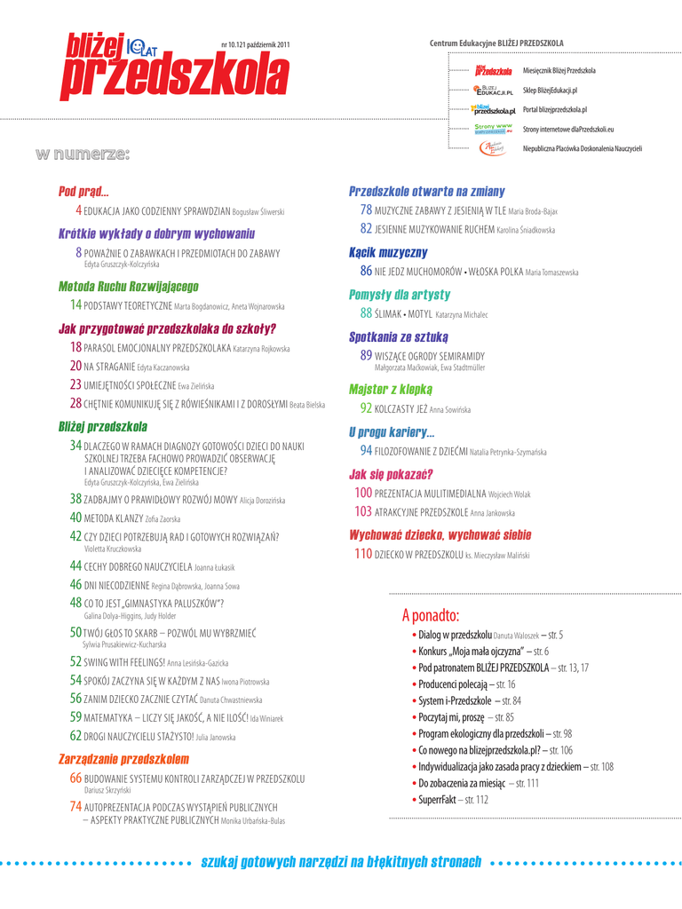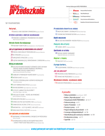Centrum Edukacyjne BLIŻEJ PRZEDSZKOLA nr 10.121 październik 2011 Miesięcznik Bliżej Przedszkola Sklep BliżejEdukacji.pl Portal blizejprzedszkola.pl Strony internetowe dlaPrzedszkoli.eu w numerze: Niepubliczna Placówka Doskonalenia Nauczycieli Pod prąd... 4 Edukacja jako codzienny sprawdzian Bogusław Śliwerski Krótkie wykłady o dobrym wychowaniu 8 Poważnie o zabawkach i przedmiotach do zabawy Edyta Gruszczyk-Kolczyńska Przedszkole otwarte na zmiany 78 Muzyczne zabawy z jesienią w tle Maria Broda-Bajak 82 Jesienne muzykowanie ruchem Karolina Śniadkowska Kącik muzyczny 86 Nie jedz muchomorów • Włoska polka Maria Tomaszewska Metoda Ruchu Rozwijającego 14 Podstawy teoretyczne Marta Bogdanowicz, Aneta Wojnarowska Jak przygotować przedszkolaka do szkoły? 18 Parasol emocjonalny przedszkolaka Katarzyna Rojkowska 20 Na straganie Edyta Kaczanowska 23 Umiejętności społeczne Ewa Zielińska 28 Chętnie komunikuję się z rówieśnikami i z dorosłymi Beata Bielska Bliżej przedszkola 34 Dlaczego w ramach diagnozy gotowości dzieci do nauki szkolnej trzeba fachowo prowadzić obserwację i analizować dziecięce kompetencje? Edyta Gruszczyk-Kolczyńska, Ewa Zielińska 38 Zadbajmy o prawidłowy rozwój mowy Alicja Dorozińska 40 Metoda KLANZY Zofia Zaorska 42 Czy dzieci potrzebują rad i gotowych rozwiązań? Violetta Kruczkowska 44 cechy dobrego nauczyciela Joanna Łukasik 46 Dni niecodzienne Regina Dąbrowska, Joanna Sowa 48 Co to jest „Gimnastyka paluszków”? Galina Dolya-Higgins, Judy Holder 50 Twój głos to skarb – pozwól mu wybrzmieć Sylwia Prusakiewicz-Kucharska 52 Swing with feelings! Anna Lesińska-Gazicka 54 Spokój zaczyna się w każdym z nas Iwona Piotrowska 56 Zanim dziecko zacznie czytać Danuta Chwastniewska 59 Matematyka – liczy się jakość, a nie ilość! Ida Winiarek 62 Drogi Nauczycielu Stażysto! Julia Janowska Zarządzanie przedszkolem 66 Budowanie systemu kontroli zarządczej w przedszkolu Dariusz Skrzyński 74 Autoprezentacja podczas wystąpień publicznych Pomysły dla artysty 88 Ślimak • Motyl Katarzyna Michalec Spotkania ze sztuką 89 Wiszące ogrody Semiramidy Małgorzata Maćkowiak, Ewa Stadtmüller Majster z klepką 92 Kolczasty jeż Anna Sowińska U progu kariery... 94 Filozofowanie z dziećmi Natalia Petrynka-Szymańska Jak się pokazać? 100 Prezentacja mulitimedialna Wojciech Wolak 103 Atrakcyjne przedszkole Anna Jankowska Wychować dziecko, wychować siebie 110 Dziecko w przedszkolu ks. Mieczysław Maliński A ponadto: Dialog w przedszkolu Danuta Waloszek – str. 5 Konkurs „Moja mała ojczyzna” – str. 6 Pod patronatem BLIŻEJ PRZEDSZKOLA – str. 13, 17 Producenci polecają – str. 16 System i-Przedszkole – str. 84 Poczytaj mi, proszę – str. 85 Program ekologiczny dla przedszkoli – str. 98 Co nowego na blizejprzedszkola.pl? – str. 106 Indywidualizacja jako zasada pracy z dzieckiem – str. 108 Do zobaczenia za miesiąc – str. 111 SuperrFakt – str. 112 – aspekty praktyczne publicznych Monika Urbańska-Bulas szukaj gotowych narzędzi na błękitnych stronach bliżej przedszkola 10.121 październik 2011