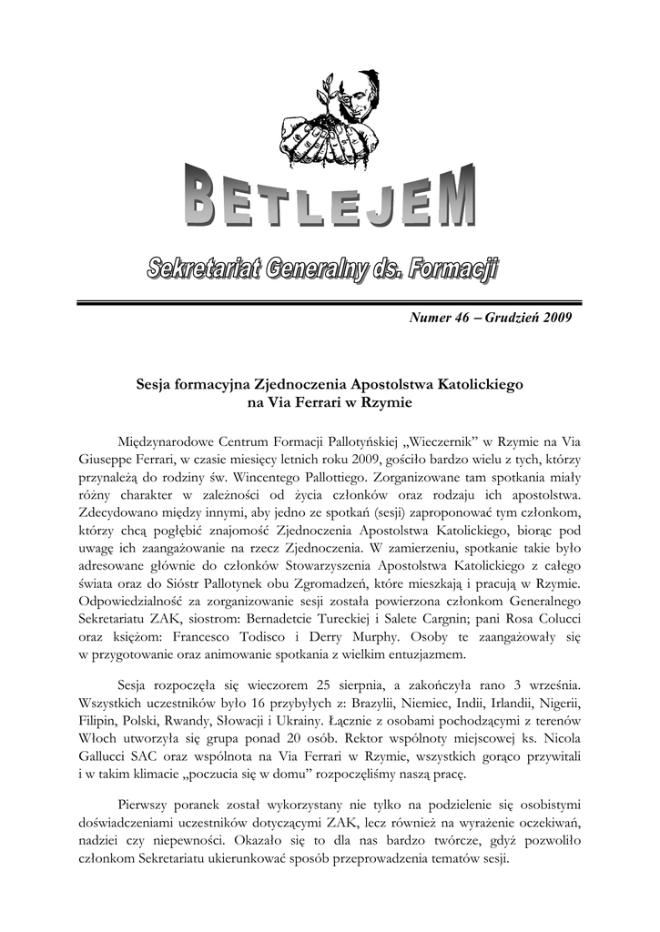 Numer 46 Grudzień 2009 Sesja formacyjna Zjednoczenia Apostolstwa Katolickiego na Via Ferrari w Rzymie Międzynarodowe Centrum Formacji Pallotyńskiej „Wieczernik” w Rzymie na Via Giuseppe Ferrari, w czasie miesięcy letnich roku 2009, gościło bardzo wielu z tych, którzy przynależą do rodziny św. Wincentego Pallottiego. Zorganizowane tam spotkania miały różny charakter w zależności od życia członków oraz rodzaju ich apostolstwa. Zdecydowano między innymi, aby jedno ze spotkań (sesji) zaproponować tym członkom, którzy chcą pogłębić znajomość Zjednoczenia Apostolstwa Katolickiego, biorąc pod uwagę ich zaangażowanie na rzecz Zjednoczenia. W zamierzeniu, spotkanie takie było adresowane głównie do członków Stowarzyszenia Apostolstwa Katolickiego z całego świata oraz do Sióstr Pallotynek obu Zgromadzeń, które mieszkają i pracują w Rzymie. Odpowiedzialność za zorganizowanie sesji została powierzona członkom Generalnego Sekretariatu ZAK, siostrom: Bernadetcie Tureckiej i Salete Cargnin; pani Rosa Colucci oraz księżom: Francesco Todisco i Derry Murphy. Osoby te zaangażowały się w przygotowanie oraz animowanie spotkania z wielkim entuzjazmem. Sesja rozpoczęła się wieczorem 25 sierpnia, a zakończyła rano 3 września. Wszystkich uczestników było 16 przybyłych z: Brazylii, Niemiec, Indii, Irlandii, Nigerii, Filipin, Polski, Rwandy, Słowacji i Ukrainy. Łącznie z osobami pochodzącymi z terenów Włoch utworzyła się grupa ponad 20 osób. Rektor wspólnoty miejscowej ks. Nicola Gallucci SAC oraz wspólnota na Via Ferrari w Rzymie, wszystkich gorąco przywitali i w takim klimacie „poczucia się w domu” rozpoczęliśmy naszą pracę. Pierwszy poranek został wykorzystany nie tylko na podzielenie się osobistymi doświadczeniami uczestników dotyczącymi ZAK, lecz również na wyrażenie oczekiwań, nadziei czy niepewności. Okazało się to dla nas bardzo twórcze, gdyż pozwoliło członkom Sekretariatu ukierunkować sposób przeprowadzenia tematów sesji. Wystąpienia dotyczące ZAK były różnorodne. Niektóre o charakterze informacyjnym, jak choćby wystąpienie dotyczące charyzmatu, który św. Wincenty Pallotti otrzymał 9 stycznia 1835 roku; inne podejmowało temat historii ZAK obejmującej okres do października 2003; ks. Hubert Socha podzielił się swoją wiedzą na temat „międzynarodowego publicznego zrzeszenia wiernych” w Kościele. Kolejne wystąpienia podejmowały inne aspekty życia Zjednoczenia, jak: Statut Generalny, jego rola i ważność w życiu członków oraz samego Zjednoczenia; formacja duchowa ukierunkowana na życie, zadania i współpracę w Zjednoczeniu. Niektóre wystąpienia, bardzo „praktyczne” dotyczyły natury oraz rzeczywistości lokalnych i krajowych Rad Koordynacyjnych; włoska Krajowa Rada Koordynacyjna podzieliła się doświadczeniem realizacji programu formacyjnego we Włoszech. Jeszcze inne wystąpienia odnosiły się do głównych aspektów duchowych i apostolskich życia Zjednoczenia, jak: „Apel Majowy” oraz konkretne działania w Kościele i świecie współczesnym, które wyrażają żywotność posłannictwa „ożywiania wiary i rozpalania miłości”. Ponadto, niektórzy uczestnicy podzielili się doświadczeniem realizacji tego posłannictwa w rodzinie, w apostolstwie młodzieży, w pogłębianiu wiary, w animowaniu i wspieraniu misji ad gentes. Sesja ZAK pozostałaby niekompletna bez szczególnego nawiązania do centralnej roli Maryi oraz Wieczernika, jaki odgrywają w rozwoju naszego ducha i wspieraniu naszych apostolskich wysiłków. Dnia 1 września było obecnych troje Przełożonych Generalnych: ks. Friedrich Kretz, s. Serena Cambiaghi oraz s. Stella Holisz, którzy podjęli wspólną refleksję nad rolą oraz misją trzech Wspólnot centralnych ZAK. Ich rozważania zostały ubogacone wystąpieniem na temat roli osoby konsekrowanej w Zjednoczeniu. Nieocenionej wartości w czasie trwania całej sesji była obecność ks. Huberta Sochy, doradcy prawnego Zjednoczenia, który dzielił się swą wiedzą i doświadczeniem, znajomością i wyczuciem tematu oraz zachęcał wszystkich do postępowania na drodze urzeczywistniania głównych elementów charyzmatu. Ponadto, w popołudniowy piątek 28 sierpnia mieliśmy szczęście gościć wśród nas Mons. Miguel Angel Delgado, wysokiego rangą urzędnika Papieskiej Rady ds. Świeckich. To on towarzyszył rodzinie pallotyńskiej na drodze rozeznawania oraz dialogu z Papieską Radą ds. Świeckich i wyrażał wielki osobisty podziw dla św. Wincentego Pallottiego oraz dla jego kapłańskiego – bardzo rzetelnego – dziedzictwa duchowego. W czasie naszej sesji Mons. Delgado, dialogując żywo z uczestnikami, mówił o roli Statutu Generalnego w życiu ZAK oraz o wyzwaniach, wynikających ze Statutu, które jawią się w dzisiejszym Kościele. Szczególnym dla nas błogosławieństwem była możliwość dwukrotnego uczestnictwa w środowej Eucharystii w Centrum Duchowym ZAK, mieszczącym się w kościele SS. Salvatore in Onda. Zarówno pierwszy jak i drugi raz, były wraz z nami wspólnoty Domów Generalnych rodziny pallotyńskiej oraz innych – rzymskich. W piątek 28 sierpnia celebrowaliśmy Eucharystię w Kaplicy irlandzkiej bazyliki św. Piotra, mieszczącej się w kryptach watykańskich. Po Mszy św. udaliśmy się na modlitwę do grobu Jana Pawła II. W niedzielę 30 sierpnia byliśmy z wizytą u Sióstr Pallotynek z Pia Casa di Carità (Pobożny Dom Miłosierdzia), który w 1838 został założony przez św. Wincentego. Razem z siostrami celebrowaliśmy Eucharystię, po której mieliśmy okazję zwiedzić ten szczególny dom. Wykorzystując bliskość Pia Casa z niektórymi miejscami działalności apostolskiej naszego Założyciela, wyruszyliśmy „śladami św. Wincentego”, co okazała się pomysłem nie małej odwagi, zważywszy na południowy upał sierpniowego Rzymu. W podsumowaniu: uczestnicy ocenili bardzo pozy