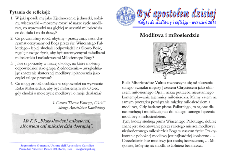 Pytania do refleksji: 1. W jaki sposób my jako Zjednoczenie: jednostki, rodziny, wieczerniki – możemy rozwijać nasze życie modlitwy, co wprowadzi nas głębiej w uczynki miłosierdzia co do ciała i co do duszy? 2. Co powinniśmy robić, abyśmy - przeżywając nasz charyzmat otrzymany od Boga przez św. Wincentego Pallottiego - lepiej słuchali i odpowiadali na Słowo Boże, regułę naszego życia, aby być autentycznymi świadkami miłosierdzia i naśladowcami Miłosiernego Boga? 3. Jakie są potrzeby w naszej okolicy, na które możemy odpowiedzieć jako grupa Zjednoczenia – uwzględniając znaczenie skutecznej modlitwy i planowania jako części całego procesu? 4. Co mogę zrobić osobiście w odpowiedzi na wyzwanie Roku Miłosierdzia, aby być miłosiernym jak Ojciec, gdy chodzi o moje życie modlitwy i o moje działania? S. Carmel Therese Favazzo, CSAC Siostry Apostolstwa Katolickiego Mt 5,7: „Błogosławieni miłosierni, albowiem oni miłosierdzia dostąpią”. ----------------------------------------------------------------------------------------Segretariato Generale, Unione dell’Apostolato Cattolico Piazza San Vincenzo Pallotti 204, Roma, Italia [email protected] e Modlitwa i miłosierdzie Bulla Misericordiae Vultus rozpoczyna się od ukazania silnego związku między Jezusem Chrystusem jako obliczem miłosiernego Ojca i naszą potrzebą nieustannego kontemplowania tajemnicy miłosierdzia. Mamy zatem na samym początku powiązanie między miłosierdziem a modlitwą. Gdy badamy pisma Pallottiego, to są one dla nas zachętą i mobilizują nas do takiego samego łączenia modlitwy z miłosierdziem. Tym, którzy studiują pisma Wincentego Pallottiego, dobrze znane jest akcentowanie przez świętego miejsca modlitwy i nieskończonego miłosierdzia Boga w naszym życiu: Praktykowanie pobożnej modlitwy jest najbardziej konieczne …. Chrześcijanin bez modlitwy jest osobą bezrozumną … Misjonarz, który się nie modli, to żołnierz bez miecza. Wzorem życia modlitwy i miłosierdzia jest nasz Pan Jezus Chrystus, prawdziwy obraz miłosierdzia Boga. Jezus w sobie samym odbija Boże miłosierdzie. I dlatego Pallotti staje przed Bogiem na modlitwie, prosząc Go o łaskę “bycia Jezusem” na tej ziemi. Niech we wszystkich moich czynnościach Jezus Chrystus będzie tym, który żyje i działa we mnie. Z Nim zjednoczony ofiaruję Ci podobieństwo Jego najświętszego człowieczeństwa. To “życie w Jezusie” w podwójnej obecności modlitwy kontemplacyjnej i uczynków miłosierdzia nadaje kierunek i kształtuje nas do szczególnych aspektów chrześcijańskiego życia, jak mówi o tym Misericordiae Vultus, którymi są: ~ relacja z Bogiem i z człowiekiem ~ źródło radości, łagodności i pokoju ~ spotkania i pomost pomiędzy osobą i Bogiem – pomiędzy mną i innymi ~ skuteczniejszy znak działania Boga w naszym życiu ~ znak obecności Ducha Świętego, prowadzącego wierzących do współpracy w dziele Chrystusa Oba te elementy znane są wszystkim zaangażowanym w Zjednoczeniu Apostolstwa Katolickiego. Życie Jezusa – obrazu miłosierdzia – stanowi “Regułę” członków Rodziny Pallotyńskiej. Modlitwa jest podstawą naszej pogłębiającej się relacji z Bogiem i ze sobą nawzajem, relacji, która w istocie rodzi pokój i radość nie tylko w nas samych, ale w całym świecie. Wincenty Pallotti podkreślał znaczenie ufności w naszej modlitwie, oczekiwania, aby Bóg hojnie odpowiedział na nasze prośby: Gdy prosisz Pana o jakąś łaskę dla ducha, staraj się gorliwie, z ufnością, pokorą i wdzięcznością wyobrazić sobie, żeś jej już w tej chwili dostąpił. Wzbudzaj owe wewnętrzne akty, jakie byś spełniał, gdybyś takiej łaski dostąpił rzeczywiście. I nie wahaj się, ponieważ tak postępując dostąpisz pociechy (W.P. III str. 57). O ile bardziej możemy zastosować to do siebie w Zjednoczeniu, gdy modlimy się, byśmy z Bożą łaską byli ludźmi miłosierdzia i apostołami naszego Pana Jezusa Chrystusa. Św. Wincenty często nawiązuje do tego, że jesteśmy “zdobyczą Bożego miłosierdzia”… poprzez założenie tego świętego Stowarzyszenia, które szanuje, czci, sprzyja i pomaga Katolickiemu Apostolstwu. Na mocy samego naszego założenia jesteśmy wezwani, by być apostołami miłosierdzia i naśladowcami Boga czujnymi na potrzeby dzieci Bożych. Dalej Pallotti przypomina nam, że dzięki łasce Bożej nasze życie, słowa i uczynki będą dziełami Bożego miłosierdzia. Możemy też dodać, że będą one świadectwem Bożej Miłości działającej w nas i przez nas poprzez uczynki miłosierdzia co do duszy i co do ciała. Ponadto nasz Założyciel wzywa nas, abyśmy w tym Roku Miłosierdzia szli naprzód z całkowitym zaufaniem: Dołóżmy wszelkich starań, aby dokonać wielkich rzeczy dla chwały naszego Stwórcy i pamiętajmy, że to łaska Boża czyni nas świętymi i że ten sam Bóg może dać nam tak wielką łaskę, że uczyni nas ona większymi świętymi niż wszyscy inni święci, którzy już byli w Kościele Jezusa Chrystusa. I wierzmy niezachwianie, że Bóg udzieli nam takiej łaski.