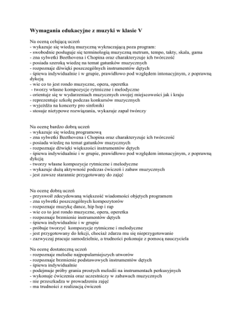 Wymagania edukacyjne z muzyki w klasie V Na oceną celującą uczeń - wykazuje się wiedzą muzyczną wykraczającą poza program: - swobodnie posługuje się terminologią muzyczną metrum, tempo, takty, skala, gama - zna sylwetki Beethovena i Chopina oraz charakteryzuje ich twórczość - posiada szeroką wiedzę na temat gatunków muzycznych - rozpoznaje dźwięki poszczególnych instrumentów dętych - śpiewa indywidualnie i w grupie, prawidłowo pod względem intonacyjnym, z poprawną dykcją - wie co to jest rondo muzyczne, opera, operetka - tworzy własne kompozycje rytmiczne i melodyczne - orientuje się w wydarzeniach muzycznych swojej miejscowości jak i kraju - reprezentuje szkołę podczas konkursów muzycznych - wyjeżdża na koncerty pro sinfoniki - stosuje nietypowe rozwiązania, wykazuje zapał twórczy Na ocenę bardzo dobrą uczeń - wykazuje się wiedzą programową - zna sylwetki Beethovena i Chopina oraz charakteryzuje ich twórczość - posiada wiedzę na temat gatunków muzycznych - rozpoznaje dźwięki większości instrumentów dętych - śpiewa indywidualnie i w grupie, prawidłowo pod względem intonacyjnym, z poprawną dykcją - tworzy własne kompozycje rytmiczne i melodyczne - wykazuje dużą aktywność podczas ćwiczeń i zabaw muzycznych - jest zawsze starannie przygotowany do zajęć Na ocenę dobrą uczeń - przyswoił zdecydowaną większość wiadomości objętych programem - zna sylwetki poszczególnych kompozytorów - rozpoznaje muzykę dance, hip hop i rap - wie co to jest rondo muzyczne, opera, operetka - rozpoznaje brzmienie instrumentów dętych - śpiewa indywidualnie i w grupie - próbuje tworzyć kompozycje rytmiczne i melodyczne - jest przygotowany do lekcji, chociaż zdarza mu się nieprzygotowanie - zazwyczaj pracuje samodzielnie, a trudności pokonuje z pomocą nauczyciela Na ocenę dostateczną uczeń - rozpoznaje melodie najpopularniejszych utworów - rozpoznaje brzmienie podstawowych instrumentów dętych - śpiewa indywidualnie - podejmuje próby grania prostych melodii na instrumentach perkusyjnych - wykonuje ćwiczenia oraz uczestniczy w zabawach muzycznych - nie przeszkadza w prowadzeniu zajęć - ma trudności z realizacją ćwiczeń Na ocenę dopuszczającą uczeń - w niewielkim stopniu przyswoił wiadomości objęte programem - wymienia instrumenty dęte - śpiewa w grupie - nie jest przygotowany do lekcji - lekceważy przedmiot - wykazuje niewielkie zainteresowanie przedmiotem Na ocenę niedostateczną uczeń - nie opanował podstawowych wiadomości objętych programem - nie bierze czynnego udziału w zajęciach - nie jest przygotowany do lekcji - lekceważy przedmiot - spóźnia się na zajęcia - przeszkadza w prowadzeniu zajęć - opuszcza bez usprawiedliwienia godziny lekcyjne