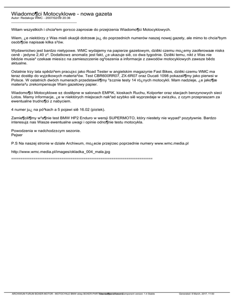 Wiadomo¶ci Motocyklowe - nowa gazeta Autor: Redakcja WMC - 2007/02/09 20:36 _____________________________________ Witam wszystkich i chcia³em gor±co zaprosiæ do przejrzenia Wiadomo¶ci Motocyklowych. Wiem, ¿e niektórzy z Was mieli okazjê dotrzeæ ju¿ do poprzednich numerów naszej nowej gazety, ale mimo to chcia³bym osobi¶cie napisaæ kilka s³ów. Wydawnictwo jest bardzo nietypowe. WMC wydajemy na papierze gazetowym, dziêki czemu mo¿emy zaoferowaæ nisk± cenê - jedyne 2,40 z³. Dodatkow± anomali± jest fakt, ¿e ukazuje siê, co dwa tygodnie. Dziêki temu, nikt z Was nie bêdzie musia³ czekaæ miesi±c na zamieszczenie og³oszenia a informacje z zawodów motocyklowych zawsze bêd± aktualne. Ostatnie trzy lata spêdzi³em pracuj±c jako Road Tester w angielskim magazynie Fast Bikes, dziêki czemu WMC ma teraz dostêp do wyj±tkowych materia³ów. Test CBR600RR07, ZX-6R07 oraz Ducati 1098 pokazali¶my jako pierwsi w Polsce. W ostatnich dwóch numerach przedstawili¶my ³±cznie testy 14 ró¿nych motocykli. Mam nadzieje, ¿e jako¶æ materia³u zrekompensuje Wam gazetowy papier. Wiadomo¶ci Motocyklowe s± dostêpne w salonach EMPiK, kioskach Ruchu, Kolporter oraz stacjach benzynowych sieci Lotos. Mamy informacje, ¿e w niektórych miejscach nak³ad szybko siê wyprzedaje w zwi±zku, z czym przepraszam za ewentualne trudno¶ci z nabyciem. 4 numer ju¿ na pó³kach a 5 pojawi siê 16.02 (pi±tek). Zamie¶cili¶my w³a¶nie test BMW HP2 Enduro w wersji SUPERMOTO, który niestety nie wypad³ pozytywnie. Bardzo interesuj± nas Wasze ewentualne uwagi i opinie odno¶nie testu motocykla. Powodzenia w nadchodz±cym sezonie. Pejser P.S Na naszej stronie w dziale Archiwum, mo¿ecie przejrzec poprzednie numery www.wmc.media.pl http://www.wmc.media.pl/images/okladka_004_mala.jpg ============================================================================ ARCHIWUM FoRUM BOXER-MOTOR - MOTOCYKLE BMW sklep BOXER-PARTS.eu MamboBoard czê¶ci i akcesoria Forum Component version: 1.4 Stable Generated: 8 March, 2017, 11:50