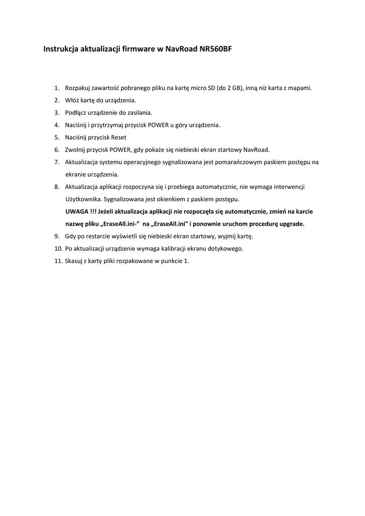 Instrukcja aktualizacji firmware w NavRoad NR560BF 1. Rozpakuj zawartośd pobranego pliku na kartę micro SD (do 2 GB), inną niż karta z mapami. 2. Włóż kartę do urządzenia. 3. Podłącz urządzenie do zasilania. 4. Naciśnij i przytrzymaj przycisk POWER u góry urządzenia. 5. Naciśnij przycisk Reset 6. Zwolnij przycisk POWER, gdy pokaże się niebieski ekran startowy NavRoad. 7. Aktualizacja systemu operacyjnego sygnalizowana jest pomaraoczowym paskiem postępu na ekranie urządzenia. 8. Aktualizacja aplikacji rozpoczyna się i przebiega automatycznie, nie wymaga interwencji Użytkownika. Sygnalizowana jest okienkiem z paskiem postępu. UWAGA !!! Jeżeli aktualizacja aplikacji nie rozpoczęła się automatycznie, zmieo na karcie nazwę pliku „EraseAll.ini-” na „EraseAll.ini” i ponownie uruchom procedurę upgrade. 9. Gdy po restarcie wyświetli się niebieski ekran startowy, wyjmij kartę. 10. Po aktualizacji urządzenie wymaga kalibracji ekranu dotykowego. 11. Skasuj z karty pliki rozpakowane w punkcie 1.
