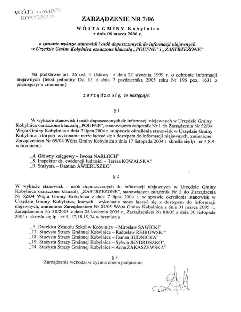 Na podsawi€ rt 26 usl I Unavy z dnia 22 stycai! 1999r. o @hronieinfomacji