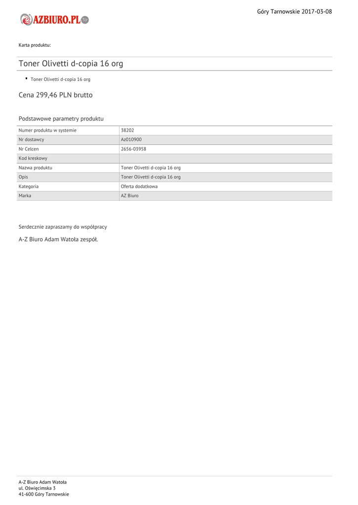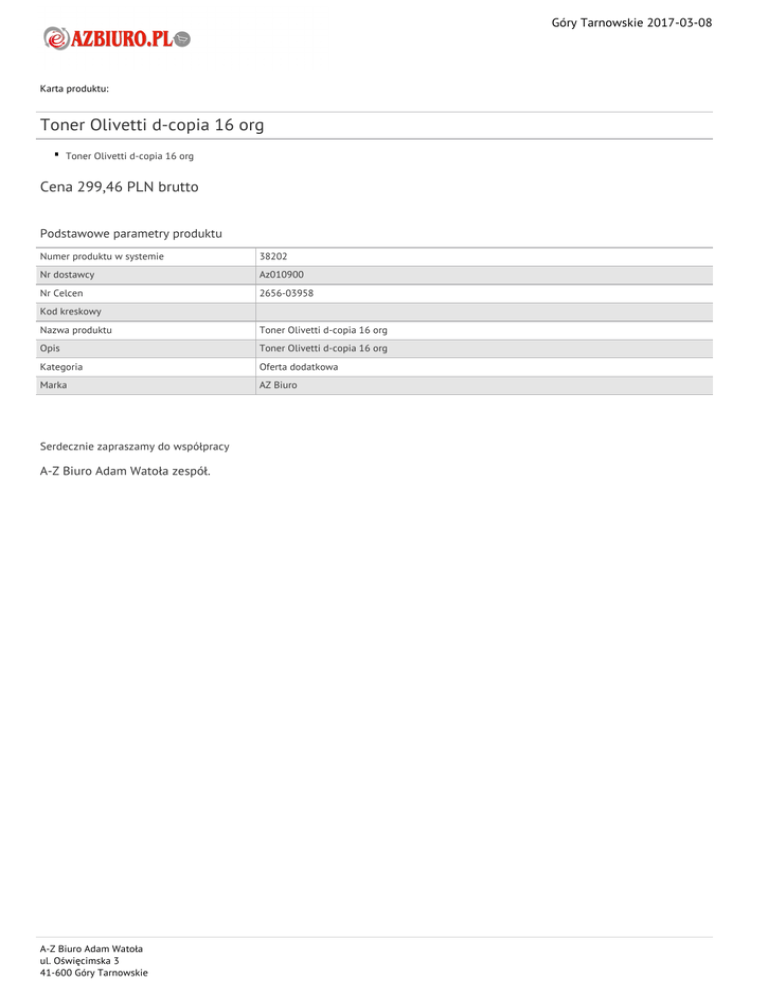 Góry Tarnowskie 2017-03-08 Karta produktu: Toner Olivetti d-copia 16 org Toner Olivetti d-copia 16 org Cena 299,46 PLN brutto Podstawowe parametry produktu Numer produktu w systemie 38202 Nr dostawcy Az010900 Nr Celcen 2656-03958 Kod kreskowy Nazwa produktu Toner Olivetti d-copia 16 org Opis Toner Olivetti d-copia 16 org Kategoria Oferta dodatkowa Marka AZ Biuro Serdecznie zapraszamy do współpracy A-Z Biuro Adam Watoła zespół. A-Z Biuro Adam Watoła ul. Oświęcimska 3 41-600 Góry Tarnowskie