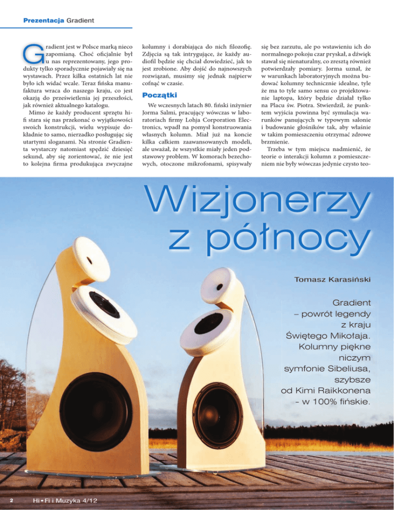 Prezentacja Gradient radient jest w Polsce marką nieco zapomianą. Choć oficjalnie był u nas reprezentowany, jego produkty tylko sporadycznie pojawiały się na wystawach. Przez kilka ostatnich lat nie było ich widać wcale. Teraz fińska manufaktura wraca do naszego kraju, co jest okazją do prześwietlenia jej przeszłości, jak również aktualnego katalogu. Mimo że każdy producent sprzętu hifi stara się nas przekonać o wyjątkowości swoich konstrukcji, wielu wypisuje dokładnie to samo, nierzadko posługując się utartymi sloganami. Na stronie Gradienta wystarczy natomiast spędzić dziesięć sekund, aby się zorientować, że nie jest to kolejna firma produkująca zwyczajne kolumny i dorabiająca do nich filozofię. Zdjęcia są tak intrygujące, że każdy audiofil będzie się chciał dowiedzieć, jak to jest zrobione. Aby dojść do najnowszych rozwiązań, musimy się jednak najpierw cofnąć w czasie. Początki We wczesnych latach 80. fiński inżynier Jorma Salmi, pracujący wówczas w laboratoriach firmy Lohja Corporation Electronics, wpadł na pomysł konstruowania własnych kolumn. Miał już na koncie kilka całkiem zaawansowanych modeli, ale uważał, że wszystkie miały jeden podstawowy problem. W komorach bezechowych, otoczone mikrofonami, spisywały się bez zarzutu, ale po wstawieniu ich do normalnego pokoju czar pryskał, a dźwięk stawał się nienaturalny, co zresztą również potwierdzały pomiary. Jorma uznał, że w warunkach laboratoryjnych można budować kolumny technicznie idealne, tyle że ma to tyle samo sensu co projektowanie laptopa, który będzie działał tylko na Placu św. Piotra. Stwierdził, że punktem wyjścia powinna być symulacja warunków panujących w typowym salonie i budowanie głośników tak, aby właśnie w takim pomieszczeniu otrzymać zdrowe brzmienie. Trzeba w tym miejscu nadmienić, że teorie o interakcji kolumn z pomieszczeniem nie były wówczas jedynie czysto teo- Wizjonerzy z północy Tomasz Karasiński Gradient – powrót legendy z kraju Świętego Mikołaja. Kolumny piękne niczym symfonie Sibeliusa, szybsze od Kimi Raikkonena - w 100% fińskie. 2 Hi•Fi i Muzyka 4/12 Prezentacja Gradient retycznym wymysłem Salmiego. W roku 1982 wygłosił on na ten temat wykład na konwencji Audio Engineering Society. W swojej prezentacji skupił się nie tylko na fizycznych aspektach zjawiska, ale też omówił metody redukcji wpływu pomieszczenia na jakość dźwięku systemu hi-fi. Jego poglądy najwyraźniej podzielał Jouko Alanko, recenzent specjalizujący się w testowaniu urządzeń z najwyższej półki. To właśnie on pomógł Salmiemu w założeniu firmy, która miała się zająć opracowaniem kolumn grających poprawnie nie tylko w wygłuszonych studiach. Jak to w życiu bywa, powiedzieć jest łatwo, znacznie trudniej zrobić. Salmi postanowił zerwać z tradycyjnymi technikami i zastąpić je pomysłami, które nawet dziś wyglądają oryginalnie. Razem z Andersem Wecktströmem – przyjacielem, którego zatrudnił w laboratorium – opublikował nawet tekst o tym, że konwencjonalne metody konstruowania kolumn ani znacząco nie zmieniły się od lat 50., ani też nie nastąpił wielki postęp w jakości dźwięku. Panowie uznali, że trzeba się wyrwać ze stereotypowego myślenia i poszukać rozwiązań, które wyprowadzą dobry dźwięk z wyłożonych gąbkami komór pomiarowych do prawdziwego świata. Decyzja o założeniu firmy zapadła w 1984 roku i tak narodził się Gradient. Początki działalności były wyjątkowo skromne. Finowie nie wystartowali z katalogiem podzielonym na kilka serii ani nawet kilkoma modelami przeznaczonymi do różnych pomieszczeń. Zbudowali tylko jeden zestaw o nazwie 1.0. Jeżeli chcieli stworzyć kolumny, które nie przypomina- Tak wyglądała produkcja w roku 1990. ły żadnych innych – z pewnością im się to udało. Pierwsze Gradienty wyglądały jak małe stoliki z dmuchającymi w dół 20-cm wooferami, na których ułożono luzem 30-cm głośniki średniotonowe, a szczyt ozdobiono panelami wyposażonymi w cztery kopułki wysokotonowe. Głośniki, częściowo pozbawione klasycznych obudów, zachowywały się trochę jak panele elektrostatyczne – grały zaGradient 1.0 – pierwszy model w historii firmy. równo do przodu, jak i do tyłu. Okazało się jednak, że po wstawieniu ich do kilku typowych pokoi dźwięk był bardziej naturalny niż w przypadku klasycznych skrzynek. Kiedy pierwszy zestaw był jeszcze na etapie ostatnich poprawek i dopiero nieśmiało myślano o wprowadzeniu go do produkcji, założyciele firmy postanowili rzucić się na głęboką wodę i wysłać go do recenzji w fińskim magazynie specjalistycznym. Gradienty 1.0 zostały wystawione przeciwko tak uznanym konstrukcjom, jak B&W 801 czy Quad ESL 63. Test wypadł pozytywnie, jednak nawet nie to było największym sukcesem młodziutkiej firmy. Otóż autor był blisko związany z fińskim uniwersytetem muzycznym – Akademią Sibeliusa. Wiedział więc, że uczelnia poszukuje sprzętu do nagłośnienia sal wykładowych. Wieść o nietypowych zestawach z miasteczka Porvoo rozniosła się szybko i kolumny trafiły tam, gdzie trzeba. Akademia wyraziła zainteresowanie nie tylko modelem 1.0, ale także zestawami, które mogłyby nagłośnić większe aule. Prace nabrały tempa, a na uczelni wylądowało w końcu kilka par Gradientów 1.0 i 1.1 oraz większych 2.0 i 2.1. Zamówienie było tak duże, że świeżo upieczeni przedsiębiorcy mieli co robić przez rok i zyskali fundusze na kolejne projekty. Naprzód Trzy lata później uznano, że niecodzienne pomysły mogą nie wystarczyć, aby Gradient dotarł do szerszego grona klientów indywidualnych. Kolumny muszą nie tylko dobrze grać, ale też wyglądać. Dlatego wzornictwo kolejnego modelu opracowano we współpracy ze znanym fińskim projektantem – Jukką Vaajakallio. Tak narodziły się monitory Avanti. Ich obudowy nie miały już ta