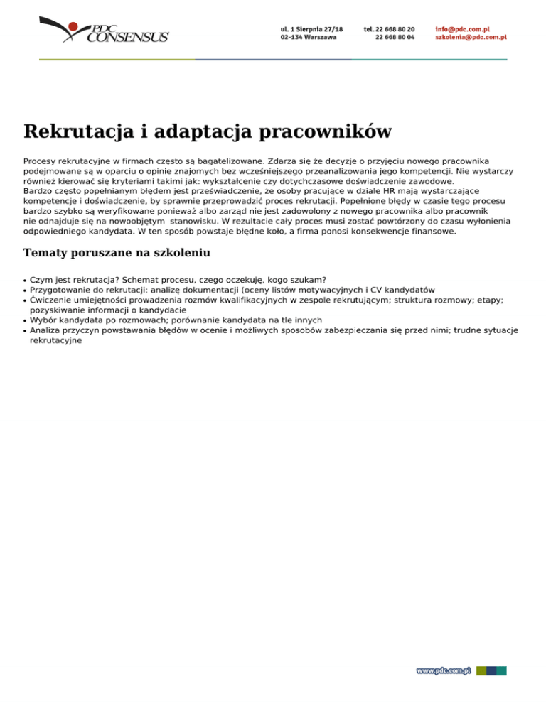 Rekrutacja i adaptacja pracowników Procesy rekrutacyjne w firmach często są bagatelizowane. Zdarza się że decyzje o przyjęciu nowego pracownika podejmowane są w oparciu o opinie znajomych bez wcześniejszego przeanalizowania jego kompetencji. Nie wystarczy również kierować się kryteriami takimi jak: wykształcenie czy dotychczasowe doświadczenie zawodowe. Bardzo często popełnianym błędem jest przeświadczenie, że osoby pracujące w dziale HR mają wystarczające kompetencje i doświadczenie, by sprawnie przeprowadzić proces rekrutacji. Popełnione błędy w czasie tego procesu bardzo szybko są weryfikowane ponieważ albo zarząd nie jest zadowolony z nowego pracownika albo pracownik nie odnajduje się na nowoobjętym stanowisku. W rezultacie cały proces musi zostać powtórzony do czasu wyłonienia odpowiedniego kandydata. W ten sposób powstaje błędne koło, a firma ponosi konsekwencje finansowe. Tematy poruszane na szkoleniu ● ● ● ● ● Czym jest rekrutacja? Schemat procesu, czego oczekuję, kogo szukam? Przygotowanie do rekrutacji: analizę dokumentacji (oceny listów motywacyjnych i CV kandydatów Ćwiczenie umiejętności prowadzenia rozmów kwalifikacyjnych w zespole rekrutującym; struktura rozmowy; etapy; pozyskiwanie informacji o kandydacie Wybór kandydata po rozmowach; porównanie kandydata na tle innych Analiza przyczyn powstawania błędów w ocenie i możliwych sposobów zabezpieczania się przed nimi; trudne sytuacje rekrutacyjne
