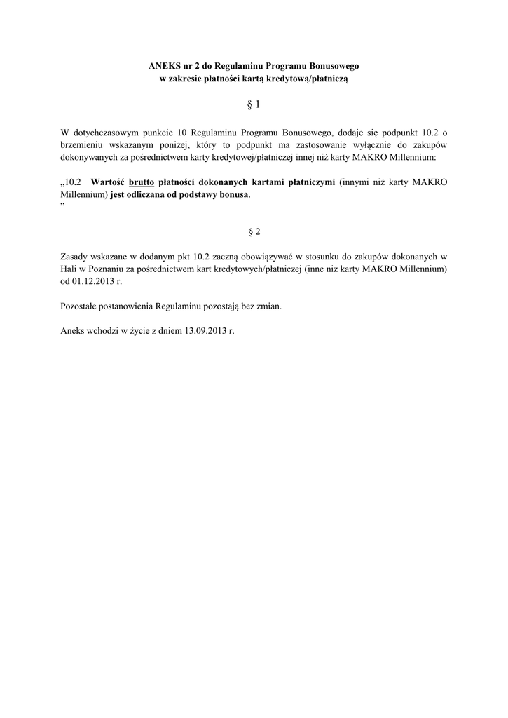 ANEKS nr 2 do Regulaminu Programu Bonusowego w zakresie płatności kartą kredytową/płatniczą §1 W dotychczasowym punkcie 10 Regulaminu Programu Bonusowego, dodaje się podpunkt 10.2 o brzemieniu wskazanym poniżej, który to podpunkt ma zastosowanie wyłącznie do zakupów dokonywanych za pośrednictwem karty kredytowej/płatniczej innej niż karty MAKRO Millennium: „10.2 Wartość brutto płatności dokonanych kartami płatniczymi (innymi niż karty MAKRO Millennium) jest odliczana od podstawy bonusa. ” §2 Zasady wskazane w dodanym pkt 10.2 zaczną obowiązywać w stosunku do zakupów dokonanych w Hali w Poznaniu za pośrednictwem kart kredytowych/płatniczej (inne niż karty MAKRO Millennium) od 01.12.2013 r. Pozostałe postanowienia Regulaminu pozostają bez zmian. Aneks wchodzi w życie z dniem 13.09.2013 r.