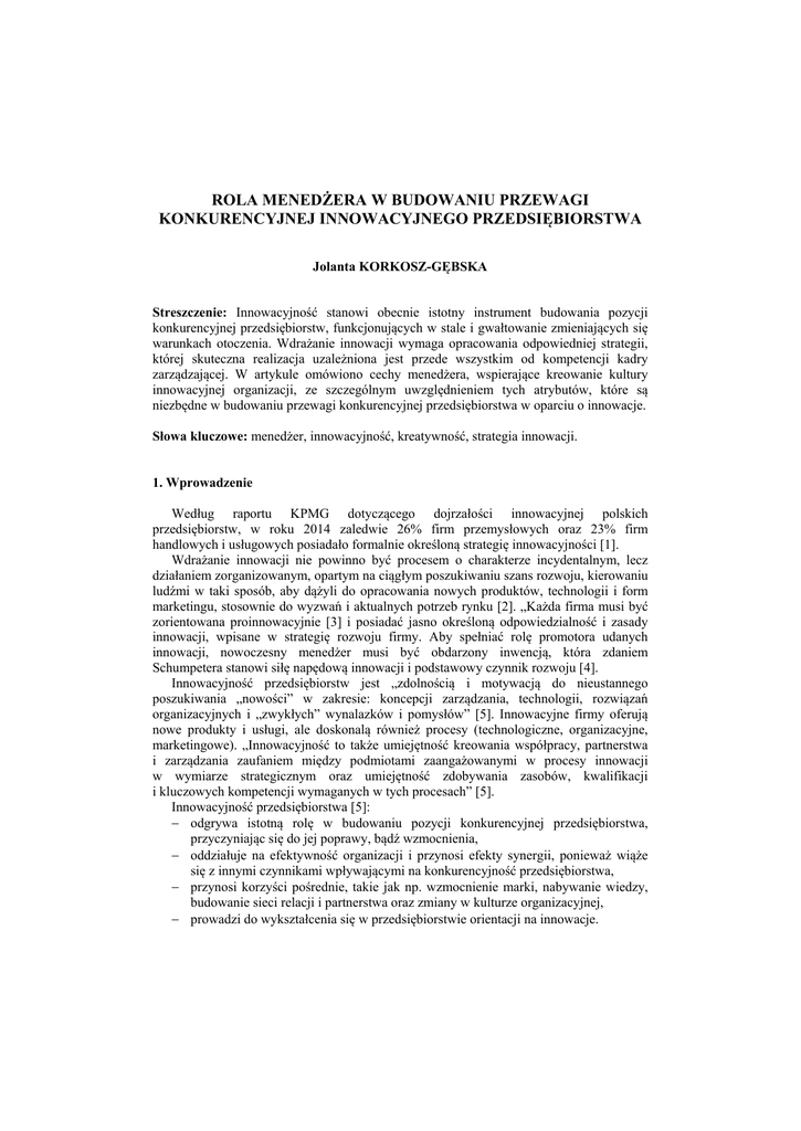 ROLA MENEDŻERA W BUDOWANIU PRZEWAGI KONKURENCYJNEJ INNOWACYJNEGO PRZEDSIĘBIORSTWA Jolanta KORKOSZ-GĘBSKA Streszczenie: Innowacyjność stanowi obecnie istotny instrument budowania pozycji konkurencyjnej przedsiębiorstw, funkcjonujących w stale i gwałtowanie zmieniających się warunkach otoczenia. Wdrażanie innowacji wymaga opracowania odpowiedniej strategii, której skuteczna realizacja uzależniona jest przede wszystkim od kompetencji kadry zarządzającej. W artykule omówiono cechy menedżera, wspierające kreowanie kultury innowacyjnej organizacji, ze szczególnym uwzględnieniem tych atrybutów, które są niezbędne w budowaniu przewagi konkurencyjnej przedsiębiorstwa w oparciu o innowacje. Słowa kluczowe: menedżer, innowacyjność, kreatywność, strategia innowacji. 1. Wprowadzenie Według raportu KPMG dotyczącego dojrzałości innowacyjnej polskich przedsiębiorstw, w roku 2014 zaledwie 26% firm przemysłowych oraz 23% firm handlowych i usługowych posiadało formalnie określoną strategię innowacyjności [1]. Wdrażanie innowacji nie powinno być procesem o charakterze incydentalnym, lecz działaniem zorganizowanym, opartym na ciągłym poszukiwaniu szans rozwoju, kierowaniu ludźmi w taki sposób, aby dążyli do opracowania nowych produktów, technologii i form marketingu, stosownie do wyzwań i aktualnych potrzeb rynku [2]. „Każda firma musi być zorientowana proinnowacyjnie [3] i posiadać jasno określoną odpowiedzialność i zasady innowacji, wpisane w strategię rozwoju firmy. Aby spełniać rolę promotora udanych innowacji, nowoczesny menedżer musi być obdarzony inwencją, która zdaniem Schumpetera stanowi siłę napędową innowacji i podstawowy czynnik rozwoju [4]. Innowacyjność przedsiębiorstw jest „zdolnością i motywacją do nieustannego poszukiwania „nowości” w zakresie: koncepcji zarządzania, technologii, rozwiązań organizacyjnych i „zwykłych” wynalazków i pomysłów” [5]. Innowacyjne firmy oferują nowe produkty i usługi, ale doskonalą również procesy (technologiczne, organizacyjne, marketingowe). „Innowacyjność to także umiejętność kreowania współpracy, partnerstwa i zarządzania zaufaniem między podmiotami zaangażowanymi w procesy innowacji w wymiarze strategicznym oraz umiejętność zdobywania zasobów, kwalifikacji i kluczowych kompetencji wymaganych w tych procesach” [5]. Innowacyjność przedsiębiorstwa [5]: − odgrywa istotną rolę w budowaniu pozycji konkurencyjnej przedsiębiorstwa, przyczyniając się do jej poprawy, bądź wzmocnienia, − oddziałuje na efektywność organizacji i przynosi efekty synergii, ponieważ wiąże się z innymi czynnikami wpływającymi na konkurencyjność przedsiębiorstwa, − przynosi korzyści pośrednie, takie jak np. wzmocnienie marki, nabywanie wiedzy, budowanie sieci relacji i partnerstwa oraz zmiany w kulturze organizacyjnej, − prowadzi do wykształcenia się w przedsiębiorstwie orientacji na innowacje. Innowacje wymagają właściwego zarządzania i przywództwa na wszystkich szczeblach organizacji [6]. Do najważniejszych cech innowacyjnej firmy należą [6]: − oparcie zarządzania na kontaktach osobistych i nieformalnych, − zapewnienie pracownikom swobody myśli i komunikacji, − prawie płaska struktura hierarchiczna, przystępność i otwartość liderów, − minimalna liczba sztywno sformułowanych procedur, − duży nacisk na specjalizację funkcjonalną, − zachęcanie pracowników do kreatywności, elastyczności i rozwoju osobistego. Wg B. Twissa można zidentyfikować następujące strategie innowacyjne związane z rozwojem produktu [2]: − strategia ofensywna (polega na tworzeniu warunków sprzyjających i zachęcających do poszukiwania nowych rozwiązań oraz szybkiego wprowadzania ich na rynek), − strategia defensywna (stanowi przeciwieństwo strategii ofensywnej i jest realizowana przez firmy, które poprzez wprowadzanie substytutów, nie ponoszą ryzyka strat, jakie niesie ze sobą opracowanie i promocja nowego produktu), − strategia zakupu licencji (nabywanie licencji technologicznych innych firm umożliwia osiąganie zysków bez konieczności inwestowania we własny dział badawczo – rozwojowy), − strategia wchodzenia w nisze (strategia unikania konfrontacji stosowana głównie przez firmy analizujące liderów rynków w celu identyfikacji ich mocnych i słabych stron, co umożliwia ustalenie luki rynkowej), − strategia kreowania rynku (dzięki postępowi technologicznemu firma ma możliwość tworzenia nowego rynku poprzez oferowanie zupełnie nowych produktów), − strategia niezależna (polega na unowocześnieniu produktu i zwiększeniu jego udziału w rynku), − strategia pozyskiwania specjalistów (pozyskanie specjalistów od konkurencji może być zyskowne, jednak jest nieetyczne), − strategia pozyskiwania firm (stosowana z reguły przez duże firmy, dysponujące większymi możliwościami w zakresie badań i rozwoju niż małe firmy, które są zazwyczaj ofensywne i innowacyjne). Podstawą opracowania skutecznej strategii innowacyjnej jest ocena strategiczna przyszłej sytuacji na rynku, jak również przyszłych uwarunkowań ekologicznych i kierunków rozwoju nauki i techniki, co zapobiega powstawaniu barier, uniemożliwiających wdrożenie innowacji [2]. Realizacja strategii innowacyjnej zależy od następujących czynników [2]: − kultury organizacji, − systematycznego planowania prac rozwojowych, − koncentracji na nowych i udoskonalonych wyrobach, − sprawnego zarządzania przedsięwzięciami, − przepływu umiejętności. Wszystkie powyższe czynniki uzależnione są w głównej mierze od decyzji menedżerów, które powinny optymalizować odpowiednią aktywność pracowników oraz ukierunkować ich na realizację właściwych celów. Wiąże się to także z podnoszeniem poziomu kwalifikacji pracowników, którzy jak wynika z Raportu Adecco „Global Talent Competitiveness Index” (G