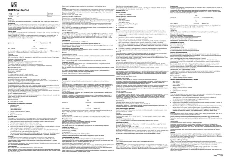Deben cumplirse las regulaciones gubernamentales y las normas locales de control de calidad vigentes. Cálculo La concentración de glucemia se calcula automáticamente a partir de las mediciones efectuadas y los factores de función y conversión transmitidos al analizador a través de la banda magnética en el dorso de la tira reactiva. La concentración de glucemia se indica en mg/dL o mmol/L según como el instrumento haya sido programado para indicar los resultados en unidades convencionales o SI. Factor de conversión: mg/dL x 0.0555 = mmol/L. Reflotron Glucose 10744948 2 x 15 Reflotron Español Uso previsto Prueba diseñada para la determinación cuantitativa de la glucosa en sangre, suero o plasma en los sistemas Reflotron. Características El organismo obtiene la glucosa de carbohidratos suministradores de glucosa. La glucosa es el principal monosacárido en la sangre con una concentración postprandial de 5 mmol/L. Constituye una fuente de energía imprescindible para diversas funciones celulares. La glucosa se desdobla por la glucólisis. Se determina para el diagnóstico y el seguimiento de trastornos del metabolismo de los carbohidratos como la diabetes mellitus, la hipoglucemia idiopática y el tumor neuroendocrino del páncreas. Principio del test Una vez aplicada a la tira reactiva, la muestra fluye al interior de la zona reactiva donde, en caso de aplicación de sangre, los eritrocitos se separan del plasma. Debido al oxígeno del aire, la D‑glucosa se oxida a δ‑D‑gluconolactona en presencia de la glucosaoxidasa (GOD). El peróxido de hidrógeno formado oxida un indicador en presencia de peroxidasa (POD). El color así generado es proporcional a la concentración de glucosa en la muestra:1 GOD glucosa + O2 δ-D-gluconolactona + H2O2 POD H2O2 + indicador colorante + H2O La concentración de glucosa es proporcional a la intensidad cromática y se mide cinéticamente a 37 °C a una longitud de onda de 642 nm. El resultado se indica al cabo de unos 125 segundos en mg/dL o mmol/L. Reactivos Componentes por test: GOD (Aspergillus niger) ≥ 3.2 U; POD (rábano picante) ≥ 3.2 U; 3,3‘,5,5‘-tetrametilbencidina (indicador) 72.6 μg; tampón. Medidas de precaución y advertencias Sólo para el uso diagnóstico in vitro. Observe las medidas de precaución usuales para la manipulación de reactivos. Elimine los residuos según las normas locales vigentes. Ficha de datos de seguridad a la disposición del usuario profesional que la solicite. Evite el contacto con la zona de aplicación de la tira reactiva (p. ej. durante la aplicación de la muestra). Preparación de los reactivos Las tiras reactivas están listas para el uso. Conservación y estabilidad Guardar a 2‑30 °C. No emplear la tira reactiva expirada la fecha de caducidad. Cerrar bien el tubo inmediatamente después de sacar una tira reactiva. Obtención y preparación de las muestras Emplear únicamente tubos o recipientes adecuados para recoger y preparar las muestras. Sangre capilar; sangre total recogida en tubos de extracción de muestras estándar así como el suero obtenido de ella; sangre con heparina o EDTA o plasma con heparina o EDTA. Emplear la sangre capilar o venosa inmediatamente después de recogerla. Emplear la sangre con EDTA o heparina dentro de los 10 minutos de obtenida. Al utilizar pipetas capilares o recipientes recubiertos desechables se deben observar las indicaciones de estabilidad del fabricante. Dentro de media hora después de la extracción de sangre, separar el suero de los componentes celulares inmediatamente después de la sedimentación. Realizar la determinación de la glucosa en el plazo de 2 horas. Separar el plasma tratado con EDTA o heparina de los componentes celulares inmediatamente después de la extracción de sangre. Realizar la determinación de la glucosa en el plazo de 2 horas.2 No utilizar otros anticoagulantes o aditivos. Dado que la glucólisis se produce en todos los materiales de muestra, el valor de glucosa medido puede desviar del valor real del paciente aún cuando se respetan todas las reglas descritas. Volumen de muestra: 30 μL Limitaciones del análisis - interferencias El presente test no sirve para diagnosticar o excluir la diabetes mellitus gestacional. En concentraciones elevadas o tóxicas, la metildopa, el metamizol y el ácido ascórbico pueden llevar a valores de glucosa disminuidos. No se pueden utilizar anticoagulantes que contienen fluoruro. En muestras de pacientes con una gammapatía monoclonal pueden obtenerse valores de medición demasiado altos.3,4,2 Los resultados de test no se ven afectados por las sustancias siguientes en las concentraciones analizadas (criterio: recuperación ± 10 % de los valores basales): valores del hematocrito hasta el 55 %, hemólisis hasta el 1 %, sueros lipémicos, bilirrubina. Para el diagnóstico, los resultados del test siempre deben interpretarse teniendo en cuenta la anamnesis del paciente, el análisis clínico así como los resultados de otros exámenes. 1 tubo con 15 tiras de control Material requerido adicionalmente (no suministrado) ▪ Analizador Reflotron Pipeta Reflotron Puntas de pipeta Reflotron Tubos capilares Reflotron ▪ Reflotron Precinorm U y Reflotron Precipath U ▪ NaCl al 0.9 % ▪ Equipo usual de laboratorio Realización del test Para asegurar el funcionamiento óptimo del test, siga atentamente las instrucciones dadas en la presente metódica. Consulte el manual del operador apropiado para obtener las instrucciones de ensayo específicas del analizador. ▪ Saque una tira reactiva del tubo. Cierre bien el tubo inmediatamente después de sacar una tira reactiva. ▪ Retire la lámina de protección de aluminio sin doblar la tira reactiva. ▪ Todas las pruebas de Reflotron requieren un volumen de muestra de 30 µL. ▪ Aplique el volumen de muestra requerido con una pipeta (p.ej. Reflotron pipette) en el centro de la zona de aplicación roja sin tocar ésta con la punta de la pipeta