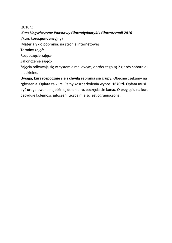 2016r.: Kurs Lingwistyczne Podstawy Glottodydaktyki I Glottoterapii 2016 (kurs korespondencyjny) Materiały do pobrania: na stronie internetowej Terminy zajęć: Rozpoczęcie zajęć:Zakończenie zajęć:Zajęcia odbywają się w systemie mailowym, oprócz tego są 2 zjazdy sobotnioniedzielne. Uwaga, kurs rozpocznie się z chwilą zebrania się grupy. Obecnie czekamy na zgłoszenia. Opłata za kurs: Pełny koszt szkolenia wynosi 1670 zł. Opłata musi być uregulowana najpóźniej do dnia rozpoczęcia sie kursu. O przyjęciu na kurs decyduje kolejność zgłoszeń. Liczba miejsc jest ogranioczona.