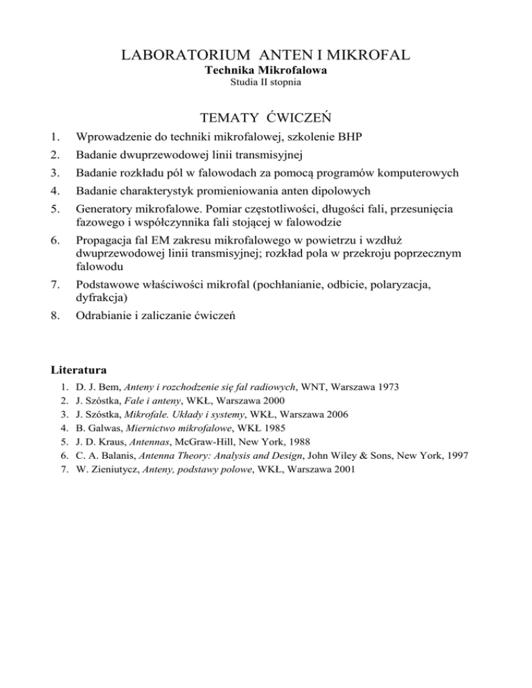 LABORATORIUM ANTEN I MIKROFAL Technika Mikrofalowa Studia II stopnia TEMATY ĆWICZEŃ 1. Wprowadzenie do techniki mikrofalowej, szkolenie BHP 2. Badanie dwuprzewodowej linii transmisyjnej 3. Badanie rozkładu pól w falowodach za pomocą programów komputerowych 4. Badanie charakterystyk promieniowania anten dipolowych 5. Generatory mikrofalowe. Pomiar częstotliwości, długości fali, przesunięcia fazowego i współczynnika fali stojącej w falowodzie 6. Propagacja fal EM zakresu mikrofalowego w powietrzu i wzdłuż dwuprzewodowej linii transmisyjnej; rozkład pola w przekroju poprzecznym falowodu 7. Podstawowe właściwości mikrofal (pochłanianie, odbicie, polaryzacja, dyfrakcja) 8. Odrabianie i zaliczanie ćwiczeń Literatura 1. 2. 3. 4. 5. 6. 7. D. J. Bem, Anteny i rozchodzenie się fal radiowych, WNT, Warszawa 1973 J. Szóstka, Fale i anteny, WKŁ, Warszawa 2000 J. Szóstka, Mikrofale. Układy i systemy, WKŁ, Warszawa 2006 B. Galwas, Miernictwo mikrofalowe, WKŁ 1985 J. D. Kraus, Antennas, McGraw-Hill, New York, 1988 C. A. Balanis, Antenna Theory: Analysis and Design, John Wiley & Sons, New York, 1997 W. Zieniutycz, Anteny, podstawy polowe, WKŁ, Warszawa 2001 Zagadnienia: 1. Wprowadzenie do techniki mikrofalowej, szkolenie BHP (brak wejściówki) a) b) c) d) e) f) g) h) i) j) k) podstawowe prawa i zasady elektromagnetyzmu miara decybelowa fala stojąca (pojęcie f.s., SWR, Γ) fala TEM fale TE i TM polaryzacja fal dyfrakcja i interferencja mikrofal fale na granicy dwóch ośrodków, warunki brzegowe głębokość wnikania prawo Snelliusa prawo Lamberta 2. Badanie dwuprzewodowej linii transmisyjnej a) b) c) d) e) podstawowe prawa i zasady elektromagnetyzmu linia długa fala stojąca (pojęcie f.s., SWR, Γ) fala TEM miara decybelowa 3. Badanie rozkładu pól w falowodach za pomocą programów komputerowych a) b) c) d) falowody – budowa, rodzaje, parametry elementy falowodowe bierne i ich zastosowanie fale TE i TM dyfrakcja i interferencja mikrofal 4. Badanie charakterystyk promieniowania anten dipolowych a) b) c) d) e) co to jest antena? rodzaje anten pomiary parametrów anten (warunki pomiaru, układy pomiarowe, strefa bliska i daleka) dipol półfalowy (budowa, charakterystyka promieniowania, rozkład prądu) wybrane parametry anten: charakterystyka promieniowania, kąt połowy mocy, kierunek maksymalnego promieniowania f) rozkład prądu na dipolu 0.5λ, 1λ, 1.5λ, 2λ g) wpływ pojemności wierzchołkowych na parametry anteny h) budowa i charakterystyka promieniowania anteny Uda-Yagi 5. Generatory mikrofalowe. Pomiar częstotliwości, długości fali, przesunięcia fazowego i współczynnika fali stojącej w falowodzie a) b) c) d) warunki brzegowe dla pól EM generatory mikrofalowe (rodzaje, budowa, zasada działania) metody pomiaru mocy w zakresie mikrofal częstotliwość graniczna falowodu 6. Propagacja fal EM zakresu mikrofalowego w powietrzu i wzdłuż dwuprzewodowej linii transmisyjnej; rozkład pola w przekroju poprzecznym falowodu a) b) c) d) e) f) linia długa fala stojąca (pojęcie f.s., SWR, Γ) fala TEM, TE, TM dopasowanie impedancyjne wykres Smitha miara decybelowa 7. Podstawowe właściwości mikrofal (pochłanianie, odbicie, polaryzacja, dyfrakcja) a) b) c) d) e) f) g) h) i) j) podstawowe prawa i zasady elektromagnetyzmu miara decybelowa fala stojąca (pojęcie f.s., SWR, Γ) fala TEM fale TE i TM dyfrakcja i interferencja mikrofal fale na granicy dwóch ośrodków, warunki brzegowe głębokość wnikania prawo Snelliusa prawo Lamberta Informacje organizacyjne: 1. Na zajęcia student powinien przychodzić przygotowany teoretycznie (obowiązuje wiedza z wykładu + zagadnienia dotyczące aktualnego i wcześniejszych ćwiczeń) oraz praktycznie (kalkulator oraz sprawozdanie z poprzedniego ćwiczenia). 2. Sprawdzenie przygotowania studenta do zajęć odbywa się w formie pisemnej (na początku każdych zajęć) oraz w formie ustnej (w trakcie wykonywania ćwiczenia). 3. Student, który oszukuje podczas „wejściówki” samodzielnie powiadamia o tym fakcie prowadzącego wykład (prof. Gratkowski, s. 21-5). 4. Na wszystkich zajęciach obowiązują przepisy BHP przedstawione przez prowadzącego na początku semestru. 5. Okrycia wierzchnie pozostawiamy w szatni. 6. Sprawozdania wykonywane powinny być przez 3-osobowe zespoły. Powinny zawierać wstęp teoretyczny (literatura), schemat układu pomiarowego (ćwiczenia pomiarowe) strukturę badanej anteny (rysunek + wymiary), odpowiednio przedstawione wyniki, wnioski, opracowanie zagadnień wskazanych przez prowadzącego. Sprawozdania powinny być oddawane na następnych zajęciach. Format sprawozdania: • tekst - czcionka Times New Roman 12, odstęp pojedynczy • akapity wyjustowane • tabela na stronie tytułowej zawierająca temat ćwiczenia, datę wykonywania ćwiczenia, skład zespołu (wyróżnione nazwisko wykonawcy sprawozdania) • tytuły rozdziałów - czcionka Times New Roman 14 pogrubione, wyrównane do lewej strony • wszystkie marginesy 2,5 cm • spis literatury (koniec), literatura z odnośnikami • numerowanie wzorów (po prawej stronie), tabel i rysunków • o ile możliwe rysunki własne (rysunki bardzo słabej jakości, np. z Internetu, nie będą akceptowane)