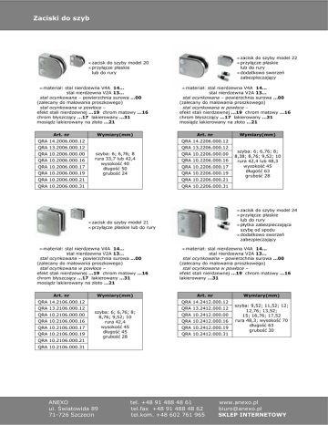 Zaciski do szyb • zacisk do szyby model 22 • przyłącze płaskie lub do rury • dodatkowo sworzeń zabezpieczający • zacisk do szyby model 20 • przyłącze płaskie lub do rury • materiał: stal nierdzewna V4A 14… stal nierdzewna V2A 13… stal ocynkowana – powierzchnia surowa …00 (zalecany do malowania proszkowego) stal ocynkowana w powłoce – efekt stali nierdzewnej …19 chrom matowy …16 chrom błyszczący …17 lakierowany …31 mosiądz lakierowany na złoto …21 Art. nr Wymiary(mm) QRA 14.2006.000.12 QRA 10.2006.000.16 QRA 10.2006.000.17 QRA 10.2006.000.19 Art. nr Wymiary(mm) QRA 14.2206.000.12 QRA 13.2006.000.12 QRA 10.2006.000.00 • materiał: stal nierdzewna V4A 14… stal nierdzewna V2A 13… stal ocynkowana – powierzchnia surowa …00 (zalecany do malowania proszkowego) stal ocynkowana w powłoce – efekt stali nierdzewnej …19 chrom matowy …16 chrom błyszczący …17 lakierowany …31 mosiądz lakierowany na złoto …21 QRA 13.2206.000.12 szyba: 6; 6,76; 8 rura 33,7 lub 42,4 wysokość 40 długość 50 grubość 24 QRA 10.2206.000.00 QRA 10.2206.000.16 QRA 10.2206.000.17 QRA 10.2206.000.19 QRA 10.2006.000.21 QRA 10.2206.000.21 QRA 10.2006.000.31 QRA 10.2206.000.31 • zacisk do szyby model 24 • przyłącze płaskie lub do rury • płytka zabezpieczająca szybę od spodu • dodatkowo sworzeń zabezpieczający • zacisk do szyby model 21 • przyłącze płaskie lub do rury • materiał: stal nierdzewna V4A 14… stal nierdzewna V2A 13… stal ocynkowana – powierzchnia surowa …00 (zalecany do malowania proszkowego) stal ocynkowana w powłoce – efekt stali nierdzewnej …19 chrom matowy …16 chrom błyszczący …17 lakierowany …31 mosiądz lakierowany na złoto …21 Art. nr Wymiary(mm) QRA 14.2106.000.12 QRA 13.2106.000.12 QRA 10.2106.000.00 QRA 10.2106.000.16 QRA 10.2106.000.17 QRA 10.2106.000.19 QRA 10.2106.000.21 • materiał: stal nierdzewna V4A 14… stal nierdzewna V2A 13… stal ocynkowana – powierzchnia surowa …00 (zalecany do malowania proszkowego) stal ocynkowana w powłoce – efekt stali nierdzewnej …19 chrom matowy …16 lakierowany …31 Art. nr Wymiary(mm) QRA 14.2412.000.12 szyba: 6; 6,76; 8; 8,76; 9,52; 10 rura 42,4 wysokość 45 długość 45 grubość 28 szyba: 6; 6,76; 8; 8,38; 8,76; 9,52; 10 rura 42,4 lub 48,3 wysokość 45 długość 63 grubość 28 QRA 13.2412.000.12 QRA 10.2412.000.00 QRA 10.2412.000.16 QRA 10.2412.000.19 QRA 10.2412.000.31 szyba: 9,52; 11,52; 12; 12,76; 13,52; 15; 16,76; 17,52 rura 48,3; wysokość 70 długość 63 grubość 30 QRA 10.2106.000.31 ANEXO ul. Światowida 89 71-726 Szczecin tel. +48 91 488 48 61 tel.fax +48 91 488 48 62 tel.kom. +48 602 761 965 www.anexo.pl [email protected] SKLEP INTERNETOWY Zaciski do szyb • zacisk do szyby model 25 • materiał: stal nierdzewna V4A 14… stal nierdzewna V2A 13… stal ocynkowana – powierzchnia surowa …00 (zalecany do malowania proszkowego) stal ocynkowana w powłoce – efekt stali nierdzewnej …19 chrom matowy …16 lakierowany …31 • przyłącze płaskie lub do rury • dodatkowo sworzeń zabezpieczający Art. nr QRA 14.2512.000.12 QRA 13.2512.000.12 QRA 10.2512.000.00 QRA 10.2512.000.16 QRA 10.2512.000.19 QRA 10.2512.000.31 Wymiary(mm) Art. nr Wymiary(mm) szyba: 10,76; 11,52; 12; 12,76 rura 42,4 lub 48,3 wysokość 45 długość 63 grubość 30 QRA 10.2710.000.00 szyba: 8,76; 9,76; 10; 10,76 rura 33,7 lub 42,4 wysokość 40 długość 50 grubość 28 • zacisk do szyby model 26 • materiał: stal nierdzewna V4A 14… stal nierdzewna V2A 13… stal ocynkowana – powierzchnia surowa …00 (zalecany do malowania proszkowego) stal ocynkowana w powłoce – efekt stali nierdzewnej …19 chrom matowy …16 lakierowany …31 • przyłącze płaskie lub do rury • płytka zabezpieczająca szybę od spodu • dodatkowo sworzeń zabezpieczający Art. nr QRA 14.2608.000.12 QRA 13.2608.000.12 QRA 10.2608.000.00 QRA 10.2608.000.16 QRA 10.2608.000.19 QRA 10.2608.000.31 • zacisk do szyby model 27 • materiał: stal ocynkowana – powierzchnia surowa …00 (zalecany do malowania proszkowego) stal ocynkowana w powłoce – efekt stali nierdzewnej …19 chrom błyszczący …17 • przyłącze płaskie lub do rury QRA 10.2710.000.17 QRA 10.2710.000.19 • zacisk do szyby model 40-41 • przyłącze płaskie lub do rury • 40 – szyba z jednej strony zacisku 41 – szyba z obu stron zacisku Art. nr QRA 14.4008.000.12 QRA 14.4108.000.12 Wymiary(mm) szyba: 8; 8,76;10 10,76; 12; 12,76 rura 42,4 lub 48,3 średnica 60 grubość 28 Wymiary(mm) szyba: 8; 8,76; 9,52; 10; 10,76; 11,52; 12; 12,76 rura 42,4 lub 48,3 wysokość 55 długość 55 grubość 35 ANEXO ul. Światowida 89 71-726 Szczecin tel. +48 91 488 48 61 tel.fax +48 91 488 48 62 tel.kom. +48 602 761 965 www.anexo.pl [email protected] SKLEP INTERNETOWY