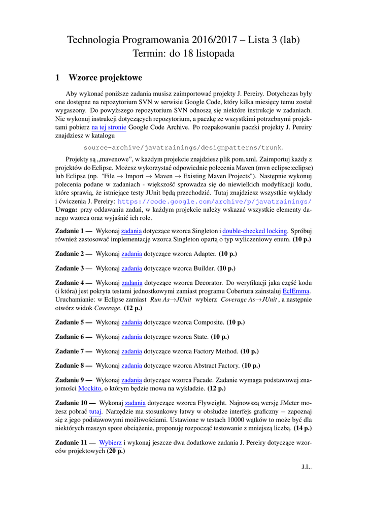 Technologia Programowania 2016/2017 – Lista 3 (lab) Termin: do 18 listopada 1 Wzorce projektowe Aby wykonać poniższe zadania musisz zaimportować projekty J. Pereiry. Dotychczas były one dost˛epne na repozytorium SVN w serwisie Google Code, który kilka miesi˛ecy temu został wygaszony. Do powyższego repozytorium SVN odnosza˛ si˛e niektóre instrukcje w zadaniach. Nie wykonuj instrukcji dotyczacych ˛ repozytorium, a paczk˛e ze wszystkimi potrzebnymi projektami pobierz na tej stronie Google Code Archive. Po rozpakowaniu paczki projekty J. Pereiry znajdziesz w katalogu source-archive/javatrainings/designpatterns/trunk. Projekty sa˛ „mavenowe”, w każdym projekcie znajdziesz plik pom.xml. Zaimportuj każdy z projektów do Eclipse. Możesz wykorzystać odpowiednie polecenia Maven (mvn eclipse:eclipse) lub Eclipse (np. "File → Import → Maven → Existing Maven Projects"). Nast˛epnie wykonuj polecenia podane w zadaniach - wi˛ekszość sprowadza si˛e do niewielkich modyfikacji kodu, które sprawia,˛ że istniejace ˛ testy JUnit b˛eda˛ przechodzić. Tutaj znajdziesz wszystkie wykłady i ćwiczenia J. Pereiry: https://code.google.com/archive/p/javatrainings/ Uwaga: przy oddawaniu zadań, w każdym projekcie należy wskazać wszystkie elementy danego wzorca oraz wyjaśnić ich role. Zadanie 1 — Wykonaj zadania dotyczace ˛ wzorca Singleton i double-checked locking. Spróbuj również zastosować implementacj˛e wzorca Singleton oparta˛ o typ wyliczeniowy enum. (10 p.) Zadanie 2 — Wykonaj zadania dotyczace ˛ wzorca Adapter. (10 p.) ˛ wzorca Builder. (10 p.) Zadanie 3 — Wykonaj zadania dotyczace Zadanie 4 — Wykonaj zadania dotyczace ˛ wzorca Decorator. Do weryfikacji jaka cz˛eść kodu (i która) jest pokryta testami jednostkowymi zamiast programu Cobertura zainstaluj EclEmma. Uruchamianie: w Eclipse zamiast Run As→JUnit wybierz Coverage As→JUnit , a nast˛epnie otwórz widok Coverage. (12 p.) Zadanie 5 — Wykonaj zadania dotyczace ˛ wzorca Composite. (10 p.) Zadanie 6 — Wykonaj zadania dotyczace ˛ wzorca State. (10 p.) Zadanie 7 — Wykonaj zadania dotyczace ˛ wzorca Factory Method. (10 p.) Zadanie 8 — Wykonaj zadania dotyczace ˛ wzorca Abstract Factory. (10 p.) Zadanie 9 — Wykonaj zadania dotyczace ˛ wzorca Facade. Zadanie wymaga podstawowej znajomości Mockito, o którym b˛edzie mowa na wykładzie. (12 p.) Zadanie 10 — Wykonaj zadania dotyczace ˛ wzorca Flyweight. Najnowsza˛ wersj˛e JMeter możesz pobrać tutaj. Narz˛edzie ma stosunkowy łatwy w obsłudze interfejs graficzny − zapoznaj si˛e z jego podstawowymi możliwościami. Ustawione w testach 10000 watków ˛ to może być dla niektórych maszyn spore obcia˛żenie, proponuj˛e rozpoczać ˛ testowanie z mniejsza˛ liczba.˛ (14 p.) Zadanie 11 — Wybierz i wykonaj jeszcze dwa dodatkowe zadania J. Pereiry dotyczace ˛ wzorców projektowych (20 p.) J.L.