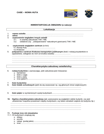CASE – NOWA HUTA INWENTARYZACJA OBSZARU (z natury): Lokalizacja 1. 2. 3. nazwa osiedla:……………………………………………………………………………… adres: ……………………………………………………………………………………….. usytuowanie względem innych osiedli 3.1. w zwartej zabudowie TAK / NIE 3.2. oddalone (np. „odseparowane” naturalnymi granicami) TAK / NIE 4. usytuowanie względem centrum (w km): 4.1.Nowej Huty …………………………………….. 4.2.Krakowa ………………………………………… połączenia z centrum Krakowa transportem publicznym (ilość i rodzaj przystanków w sąsiedztwie, odległość do nich od środka osiedla) ……………………. .…………………………………………………………………………………………………...…………… ……………………………………………………………………………………....………………………… ……………………………………………………………………….………............................................... .............................................................................. 5. Charakterystyka zabudowy osiedla/ulicy 6. rodzaj budynków ( zaznaczając, jeśli zabudowa jest mieszana): kamienice bloki z cegły bloki z płyty inne (jakie?) ................................................................................................................ 7. 8. ilość budynków......................................................................................................... ilość klatek schodowych (jeśli da się oszacować np. wg głównych drzwi wejściowych) .................................................................................................................................... .................................................................................................................................... 9. ilość pięter w wymienionych wyżej budynkach........................................................... .................................................................................................................................... 10. Ogólna charakterystyka zabudowy (jak usytuowane są względem siebie budynki, czy jest „dziedziniec”/wspólna przestrzeń między budynkami, czy łatwo odnaleźć wejście do budynku itp.) .................................................................................................................................... .................................................................................................................................... .................................................................................................................................... .................................................................................................................................... 11. Funkcje inne niż mieszkalne 11.1. W budynkach znajdują się: sklepy poczta usługi (podaj jakie)................................................................................................. inne......................................................................................................................... 11.2 W przestrzeni między blokami mieszkalnymi znajduje się: plac zabaw przedszkole szkoła (podaj jaka)................................................................................................. przychodnia poczta inne ................................................................................................................... 12. „Umeblowanie” osiedla/ulicy 12.1. Zaznaczyć elementy „wyposażenia” przestrzeni, uwzględniając: ławki oświetlenie budki telefoniczne jakiś „punkt” centralny (fontanna, pomnik, itp.) - podaj jaki.......................... ....................................................................................................................... inne ................................................................................................................. ....................................................................................................................... 12.2. opisać jakość przestrzeni (zwracając uwagę, czy „wyposażenie” jest zadbane vs zniszczone; czyste, odświeżone vs brudne, popisane; jakie kolory zwracają uwagę; ewentualne zapachy, stan zieleni) .................................................................................................................................... .................................................................................................................................... ................................................................................................................................... ................................................................................................................................... ................................................................................................................................... .................................................................................................................................... ................................................................................................................................... Charakterystyka budynku wybranego do badań: 13. 14. 15. 16. 17. 17.1. 17.2. 17.3. 17.4. 17.5. Zarządca budynku (jeśli jest informacja w budynku)................................................ ilość pięter ............................................................ ilość mieszkań na piętrze...................................................................... ilość mieszkań w budynku........................................................................ Charakterystyka klatki schodowej (Zaznaczyć odp.): Domofon tak /nie Winda tak / nie Lista mieszkańców tak / nie Tablica informacyjna t
