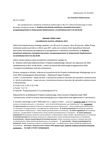 Budziszewice, 01.10.2014r. Do wszystkich Wykonawców RG.271-7/2014 dot. postępowania o udzielenie zamówienia publicznego nr RG.271-7/2014 prowadzonego w trybie przetargu nieograniczonego na Budowa kanalizacji sanitarnej z kanałami bocznymi i przepompowniami w miejscowości Budziszewice, ul.Letniskowa kol.S-12,18,19,20. ZMIANA TREŚCI SIWZ i przedłużenie terminu składania ofert Wójt Gminy Budziszewice działając zgodnie z art.38 ust.4 i 6 ustawy z dnia 29 stycznia 2004r.Prawo zamówień publicznych (Dz.U.z 2013r.,poz.907 z późn.zm.) zmienia treść Specyfikacji Istotnych Warunków Zamówienia sporządzonej w postępowaniu o udzielenie zamówienia na Budowa kanalizacji sanitarnej z kanałami bocznymi i przepompowniami w miejscowości Budziszewice, ul.Letniskowa kol.S-12,18,19,20. Zakres zmiany dotyczy opisu przedmiotu zamówienia i polega na: 1. Dodaniu informacji (dokumentów) z Projektu budowlanego, których nie załączono do SIWZ opublikowanej w dniu 19.09.2014r., a które są istotne dla właściwego przygotowania ofert i następnie prawidłowej realizacji zamówienia. Zmiana następuje w drodze załączenia (uzupełnienia) do Projektu budowlanego składającego się na treść SIWZ następujących dokumentów – składowych tegoż Projektu: 1/ Ark.7 ul.Letniskowa – mapa syt.wys. z naniesioną zmianą w stosunku do uprzednio zamieszczonej 2/ Ark.8 ul.Letniskowa – mapa syt.wys.z naniesioną zmianą w stosunku do uprzednio zamieszczonej 3/ Geotechnika 4/ Profile S-12, S-18, S-19, S-20, 5/ Profile T-3, T-4 6/ Rysunki: Przepompownia P-3, przepompownia P-4. Dokumenty te są składowymi Projektu budowlanego, który stanowi integralną część SIWZ i zamieszczony został na stronie internetowej gminy w załącznikach pod ogłoszeniem o zamówieniu. 2. Zmianie zawartego w pkt 3 SIWZ ppkt 3.2.1. zapisu o treści: „ Natomiast przedmiar robót pt.”Kanalizacja sanitarna z kanałami bocznymi ul. Letniskowa kol.S-12,18,19,20 Budziszewice gm. Budziszewice” oraz zestawienia : 1/ robót ziemnych dla kanalizacji sanitarnej z kanałami bocznymi m.Budziszewice i Nowy Józefów gmina Budziszewice ul. Letniskowa: rurociągi sanitarne, rurociągi tłoczne, kanały boczne, 2/ studni przelotowych dla kanalizacji sanitarnej z przykanalikami-m.Budziszewice i Nowy Józefów gm.Budziszewice ul.Letniskowa, 3/ studni rozgałęźnych dla kanalizacji sanitarnej z przykanalikami-m.Budziszewice i Nowy Józefów gm.Budziszewice ul.Letniskowa, 4/ studni spadowychkaskadowych dla kanalizacji sanitarnej z przykanalikami –m.Budziszewice i Nowy Józefów , gm.Budziszewice ul.Letniskowa 5/ kanałów bocznych dla kanalizacji sanitarnej w m.Budziszewice i Nowy Józefów gm.Budziszewice ul.Letniskowa, 6/ przewiertów i danych uzupełniających do kanałów bocznych Obiekt: kanalizacja sanitarna z kanałami bocznymi w m.Budziszewice i Nowy Józefów gm.Budziszewice ul.Letniskowa 7/ przewiertów i danych uzupełniających do kolektorów Obiekt: kanalizacja sanitarna z kanałami bocznymi w m.Budziszewice i Nowy Józefów gm.Budziszewice ul.Letniskowa , stanowiące integralną część niniejszej SIWZ opisem swym obejmują wyłącznie przedmiot niniejszego zamówienia. „ na zapis o treści następującej: „Natomiast przedmiar robót pt.”Kanalizacja sanitarna z kanałami bocznymi ul. Letniskowa kol.S12,18,19,20 Budziszewice gm. Budziszewice” oraz zestawienia : 1/ robót ziemnych dla kanalizacji sanitarnej z kanałami bocznymi m.Budziszewice i Nowy Józefów gmina Budziszewice ul. Letniskowa: rurociągi sanitarne, rurociągi tłoczne, kanały boczne, 2/ studni przelotowych dla kanalizacji sanitarnej z przykanalikamim.Budziszewice i Nowy Józefów gm.Budziszewice ul.Letniskowa, 3/ studni rozgałęźnych dla kanalizacji sanitarnej z przykanalikami-m.Budziszewice i Nowy Józefów gm.Budziszewice ul.Letniskowa, 4/ studni spadowych-kaskadowych dla kanalizacji sanitarnej z przykanalikami –m.Budziszewice i Nowy Józefów , gm.Budziszewice ul.Letniskowa 5/ kanałów bocznych dla kanalizacji sanitarnej w m.Budziszewice i Nowy Józefów gm.Budziszewice ul.Letniskowa, 6/ przewiertów i danych uzupełniających do kanałów bocznych Obiekt: kanalizacja sanitarna z kanałami bocznymi w m.Budziszewice i Nowy Józefów gm.Budziszewice ul.Letniskowa 7/ przewiertów i danych uzupełniających do kolektorów Obiekt: kanalizacja sanitarna z kanałami bocznymi w m.Budziszewice i Nowy Józefów gm.Budziszewice ul.Letniskowa , 8/ Ogólna charakterystyka obiektu, stanowiące integralną część niniejszej SIWZ opisem swym obejmują wyłącznie przedmiot niniejszego zamówienia. „ 3. Zamawiający w celu zapewnienia Wykonawcom czasu niezbędnego do wprowadzenia w przygotowywanych ofertach zmian wynikających ze zmiany treści siwz postanowił przedłużyć termin składania ofert. Nowe terminy są następujące: Termin składania ofert: 10 października 2014r. godz. 11:00. Termin otwarcia ofert: 10 października 2014r. godz. 11:30. Wójt Gminy Marian Holak