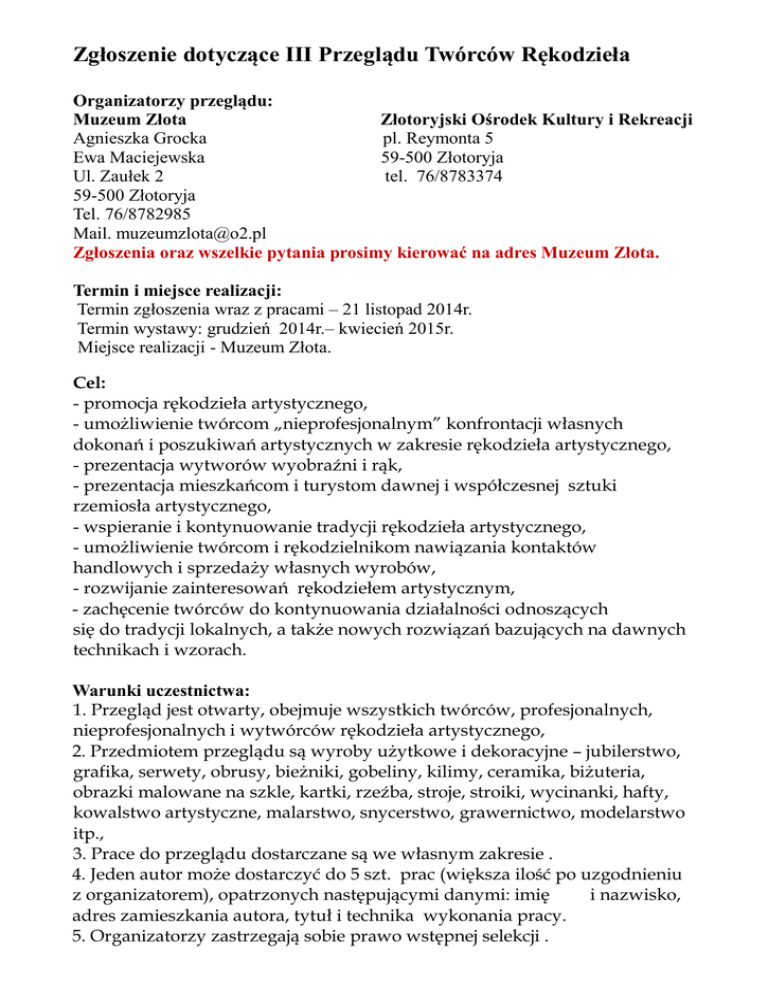 Zgłoszenie dotyczące III Przeglądu Twórców Rękodzieła Organizatorzy przeglądu: Muzeum Złota Złotoryjski Ośrodek Kultury i Rekreacji Agnieszka Grocka pl. Reymonta 5 Ewa Maciejewska 59-500 Złotoryja Ul. Zaułek 2 tel. 76/8783374 59-500 Złotoryja Tel. 76/8782985 Mail. [email protected] Zgłoszenia oraz wszelkie pytania prosimy kierować na adres Muzeum Złota. Termin i miejsce realizacji: Termin zgłoszenia wraz z pracami – 21 listopad 2014r. Termin wystawy: grudzień 2014r.– kwiecień 2015r. Miejsce realizacji - Muzeum Złota. Cel: - promocja rękodzieła artystycznego, - umożliwienie twórcom „nieprofesjonalnym” konfrontacji własnych dokonań i poszukiwań artystycznych w zakresie rękodzieła artystycznego, - prezentacja wytworów wyobraźni i rąk, - prezentacja mieszkańcom i turystom dawnej i współczesnej sztuki rzemiosła artystycznego, - wspieranie i kontynuowanie tradycji rękodzieła artystycznego, - umożliwienie twórcom i rękodzielnikom nawiązania kontaktów handlowych i sprzedaży własnych wyrobów, - rozwijanie zainteresowań rękodziełem artystycznym, - zachęcenie twórców do kontynuowania działalności odnoszących się do tradycji lokalnych, a także nowych rozwiązań bazujących na dawnych technikach i wzorach. Warunki uczestnictwa: 1. Przegląd jest otwarty, obejmuje wszystkich twórców, profesjonalnych, nieprofesjonalnych i wytwórców rękodzieła artystycznego, 2. Przedmiotem przeglądu są wyroby użytkowe i dekoracyjne – jubilerstwo, grafika, serwety, obrusy, bieżniki, gobeliny, kilimy, ceramika, biżuteria, obrazki malowane na szkle, kartki, rzeźba, stroje, stroiki, wycinanki, hafty, kowalstwo artystyczne, malarstwo, snycerstwo, grawernictwo, modelarstwo itp., 3. Prace do przeglądu dostarczane są we własnym zakresie . 4. Jeden autor może dostarczyć do 5 szt. prac (większa ilość po uzgodnieniu z organizatorem), opatrzonych następującymi danymi: imię i nazwisko, adres zamieszkania autora, tytuł i technika wykonania pracy. 5. Organizatorzy zastrzegają sobie prawo wstępnej selekcji . Karta zgłoszenia III 1. Imię i nazwisko ……………………………………………………………………………………………………… 2. Wiek ...................................................................................................... 3. Dokładny adres zamieszkania ……………………………………………………………………………………………………….......................... ……………………………………………………………………………………………………….......................... 4. Numer telefonu ………………………………………………………………………. .......................... 5. e-mail ..................................................................................................... 6. Dziedzina twórczości, krótki opis techniki wykonanej pracy ............................. ………………………………………………………………............................................................. ………………………………………………………………………………………………………........................... ………………………………………………………………………………………………………........................... ................................................................................................................... .................................................................................................................. 7. Inne uwagi: ................................................................................................................... ................................................................................................................... ................................................................................................................... ................................................................................................................... Wyrażam zgodę na przechowywanie i przetwarzanie moich danych osobowych w ramach organizacji przeglądu, zgodnie z ustawą z dn. 29.08.1997 r. o ochronie danych osobowych (Dz. U. z 2002 r. nr 101, poz. 926 z późn. zm.). ...................................................................... (Podpis uczestnika) Wykaz prac zgłoszonych 1. 2. 3. 4. 5. …………………………………………………………… …………………………………………………………… …………………………………………………………… …………………………………………………………. ……………………………………………………………