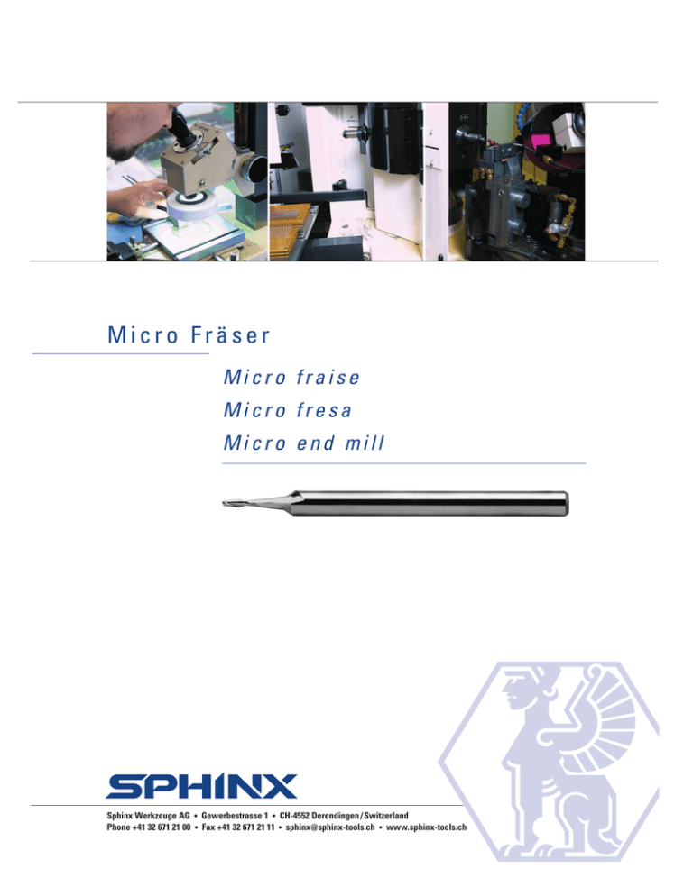 Micro Fräser Micro fraise Micro fresa Micro end mill Sphinx Werkzeuge AG • Gewerbestrasse 1 • CH-4552 Derendingen / Switzerland Phone +41 32 671 21 00 • Fax +41 32 671 21 11 • [email protected] • www.sphinx-tools.ch M i c r o F r ä s e r a u s Vo l l h a r t m e t a l l Micro fraise en métal dur Micro fresa in metallo duro 0 d1 - 0,03 d2 – h6 Micro end mill in solid carbide l2 l1 Abmessungen, Dimensions, Dimensioni, Dimensions 0 0 d 1 - 0,03 mm d 2 –h6 mm l1 mm l2 mm d 1 - 0,03 mm d 2 –h6 mm l1 mm l2 mm 0.30 0.40 0.50 0.60 0.70 0.80 0.90 1.00 1.10 1.20 1.30 3.00 3.00 3.00 3.00 3.00 3.00 3.00 3.00 3.00 3.00 3.00 38 38 38 38 38 38 38 38 38 38 38 0.70 1.10 1.50 1.70 2.20 2.40 2.50 3.00 3.40 3.80 3.80 1.40 1.50 1.60 1.70 1.80 1.90 2.00 2.50 3.00 3.00 3.00 3.00 3.00 3.00 3.00 3.00 38 38 38 38 38 38 38 38 4.20 4.50 4.80 5.00 5.40 5.70 6.00 7.00