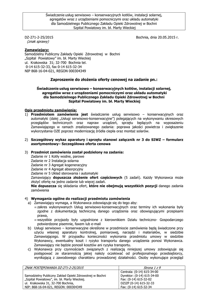 Świadczenie usług serwisowo – konserwacyjnych kotłów, instalacji solarnej, agregatów wraz z urządzeniami pomocniczymi oraz układu automatyki dla Samodzielnego Publicznego Zakładu Opieki Zdrowotnej w Bochni Szpital Powiatowy im. bł. Marty Wieckiej DZ-271-2-25/2015 Bochnia, dnia 20.05.2015 r. (znak sprawy) Zamawiający: Samodzielny Publiczny Zakłady Opieki Zdrowotnej w Bochni „Szpital Powiatowy” im. bł. Marty Wieckiej ul. Krakowska 31; 32-700 Bochnia tel. 0-14 615-32-33, fax 0-14 615-32-34 NIP 868-16-04-021, REGON 000304349 Zaproszenie do złoŜenia oferty cenowej na zadanie pn.: Świadczenie usług serwisowo – konserwacyjnych kotłów, instalacji solarnej, agregatów wraz z urządzeniami pomocniczymi oraz układu automatyki dla Samodzielnego Publicznego Zakładu Opieki Zdrowotnej w Bochni Szpital Powiatowy im. bł. Marty Wieckiej Opis przedmiotu zamówienia: 1) Przedmiotem zamówienia jest świadczenie usług serwisowo – konserwacyjnych oraz automatyki (dalej „Usługi serwisowo-konserwacyjne”) polegających na wykonywaniu okresowych przeglądów technicznych oraz napraw urządzeń, sprzętu będących na wyposaŜeniu Zamawiającego w ramach zrealizowanego zadania: poprawa jakości powietrza i zwiększenie wykorzystania OZE poprzez modernizację źródła ciepła oraz montaŜ solarów. 2) Szczegółowy wykaz aparatury i sprzętu stanowi załącznik nr 3 do SIWZ – formularz asortymentowy– Szczegółowa oferta cenowa 3) Przedmiot zamówienia został podzielony na zadania: Zadanie nr 1 Kotły wodne, parowe Zadanie nr 2 Instalacja solarna Zadanie nr 3 Agregat kogeneracyjny Zadanie nr 4 Agregat absorpcyjny Zadanie nr 5 Układ sterowania i automatyki Zamawiający dopuszcza złoŜenie ofert częściowych (5 zadań). KaŜdy Wykonawca moŜe złoŜyć ofertę na jedno zadanie lub więcej zadań. Nie dopuszcza się składania ofert, które nie obejmują wszystkich pozycji danego zadania zamówienia 4) Wymagania ogólne do realizacji przedmiotu zamówienia a) Zamawiający wymaga, a Wykonawca zobowiązuje się do tego aby: • zakres wykonywanych Usług serwisowo-konserwacyjnych oraz terminy ich wykonania były zgodne z dokumentacją techniczną danego urządzenia oraz obowiązującymi przepisami prawa, • wszystkie przyjazdy były uzgodnione z kierownikiem Działu techniczno- Gospodarczego potwierdzone pisemnie, faxem lub e-mail b) Usługi serwisowo – konserwacyjne określone w przedmiocie zamówienia będą świadczone przy uŜyciu własnej aparatury kontrolnej, pomiarowej, narzędzi i materiałów, w siedzibie Zamawiającego. W przypadku konieczności wykonania przedmiotu umowy w siedzibie Wykonawcy, ewentualny koszt i ryzyko transportu danego urządzenia ponosi Wykonawca. Zamawiający nie będzie ponosił kosztów ani ryzyka transportu. c) Wykonawca przy czynnościach związanych z realizacją niniejszej umowy zobowiązuje się postępować ze starannością jakiej naleŜy oczekiwać od profesjonalnego przedsiębiorcy, wynikającą z zawodowego charakteru prowadzonej działalności. Osoby wykonujące przegląd ZNAK POSTĘPOWANIA DZ-271-2-25/2015 Samodzielny Publiczny Zakład Opieki Zdrowotnej w Bochni „Szpital Powiatowy”, im. bł. Marty Wieckiej. ul. Krakowska 31, 32-700 Bochnia, NIP: 868-16-04-021, REGON: 000304349 Strona 1 z 9 Centrala: (0-14) 615-34-00 Dyrektor: (0-14) 615-34-00 Fax: (0-14) 615-32-02 DZIZP (0-14) 615-32-33 Fax: (0-14) 615-32-34 Świadczenie usług serwisowo – konserwacyjnych kotłów, instalacji solarnej, agregatów wraz z urządzeniami pomocniczymi oraz układu automatyki dla Samodzielnego Publicznego Zakładu Opieki Zdrowotnej w Bochni Szpital Powiatowy im. bł. Marty Wieckiej d) e) f) g) h) i) j) k) l) m) n) o) p) q) r) s) okresowy lub konserwację musi posiadać: zezwolenia, kwalifikacje, licencje i inne dokumenty uprawniające do wykonania czynności przeglądu urządzenia objętego przedmiotem zamówienia. Przeglądy okresowe powinny być wykonywane w siedzibie Zamawiającego. Zakres wykonywanych przeglądów technicznych oraz terminy ich wykonania muszą być zgodne z zaleceniami producenta danego urządzenia oraz obowiązującymi przepisami prawa Usługi serwisowo-konserwacyjne realizowane będą na podstawie pisemnego zlecenia wystawionego przez Zamawiającego zgodnie z zaleceniami producentów sprzętu i aparatury. Zakończenie usługi przeglądu musi nastąpić w terminie do 7*(max) dni roboczych od dnia zgłoszenia przez Zamawiającego i zostać potwierdzone wystawieniem protokołu serwisowego Usługi serwisowo-konserwacyjne obejmują takŜe wymianę niezbędnych materiałów eksploatacyjnych i innych materiałów koniecznych do prawidłowego funkcjonowania sprzętu, przy czym ich cena jest zawarta w wynagrodzeniu Wykonawcy, któremu nie przysługuje dodatkowe wynagrodzenie z tego tytułu W przypadku potrzeby przeprowadzenia przeglądu technicznego urządzenia lub jego naprawy w siedzibie Wykonawcy, Wykonawca zobowiązany jest w ramach usługi do zabrania i ponownego dostarczenia urządzenia do siedziby Zamawiającego w ramach ryczałtu. Zamawiający nie pokrywa kosztów transportu. Wykonawca zobowiązuje się do zabezpieczenia części zamiennych potrzebnych do realizacji przedmiotu umowy W przypadku stwierdzenia podczas przeglądu technicznego konieczności wykonania naprawy lub w przypadku awarii, której usunięcie powierzone zostanie Wykonawcy, Wykonawca będzie sporządzał wykaz części zamiennych wraz z określeniem ich kosztów oraz przewidywaną ilością roboczogodzin do wykonania naprawy/usunięcia awarii. Wykonanie w/w czynności nastąpi dopiero po akceptacji kosztów przez Zamawiającego z uwzględnieniem stawki roboczogodziny podanej w ofercie przetargowej, na podstawie odrębnego zlecenia. W przypadku nie zaakceptowania kosztorysu wykonania naprawy/usunięcia awarii sporządzonego przez Wykonawcę, Zamawiający zastrzega sobie moŜliwość wykonania naprawy/usunięcia awarii we własnym zakresie Wykonawca zobowi