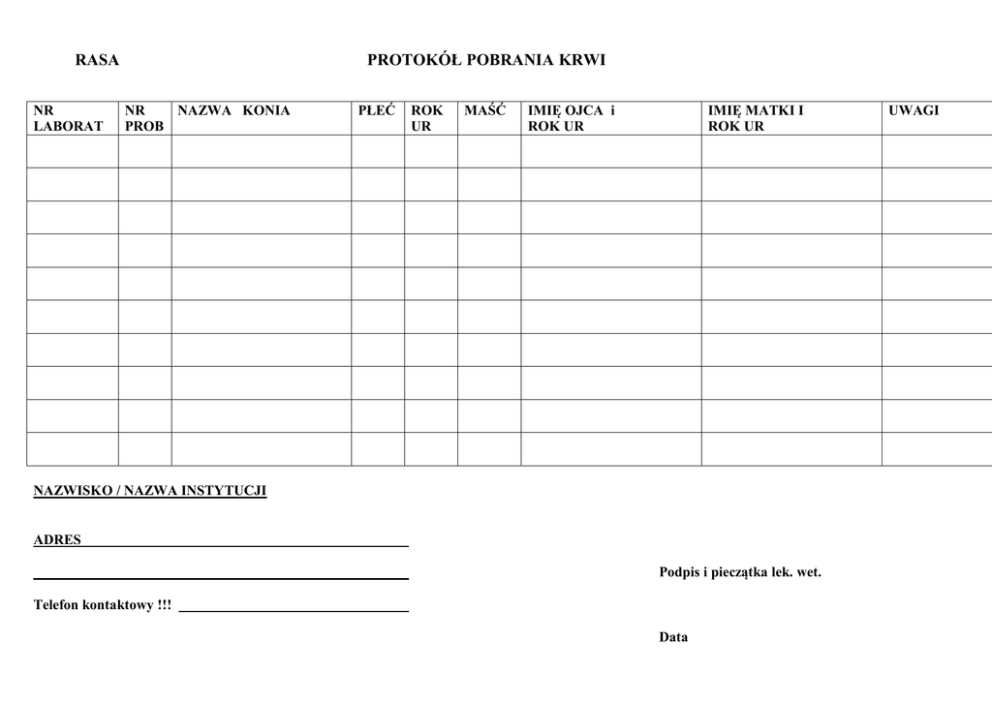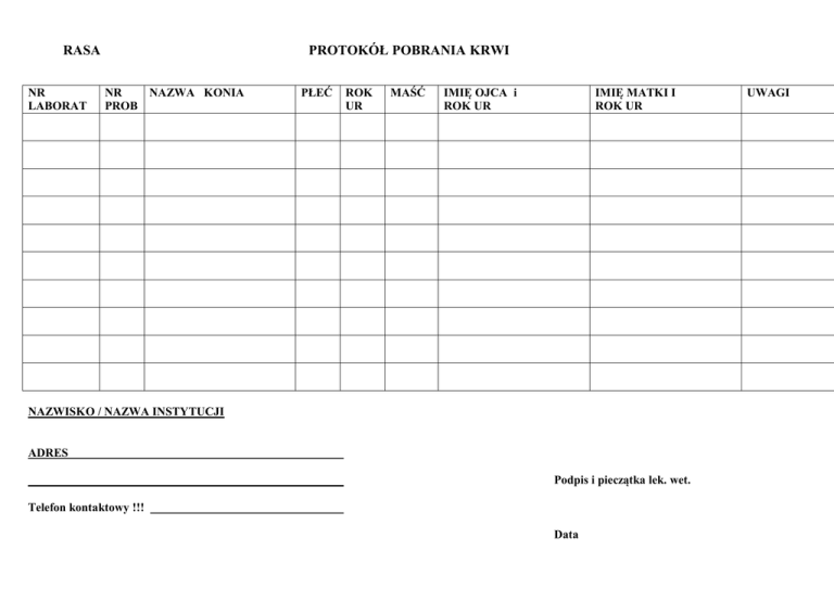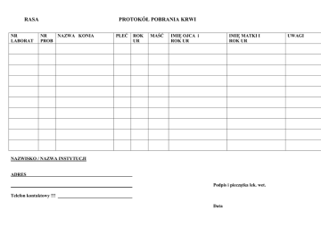 PROTOKÓŁ POBRANIA KRWI RASA NR LABORAT NR NAZWA KONIA PROB PŁEĆ ROK UR MAŚĆ IMIĘ OJCA i ROK UR IMIĘ MATKI I ROK UR NAZWISKO / NAZWA INSTYTUCJI ADRES Podpis i pieczątka lek. wet. Telefon kontaktowy !!! Data UWAGI