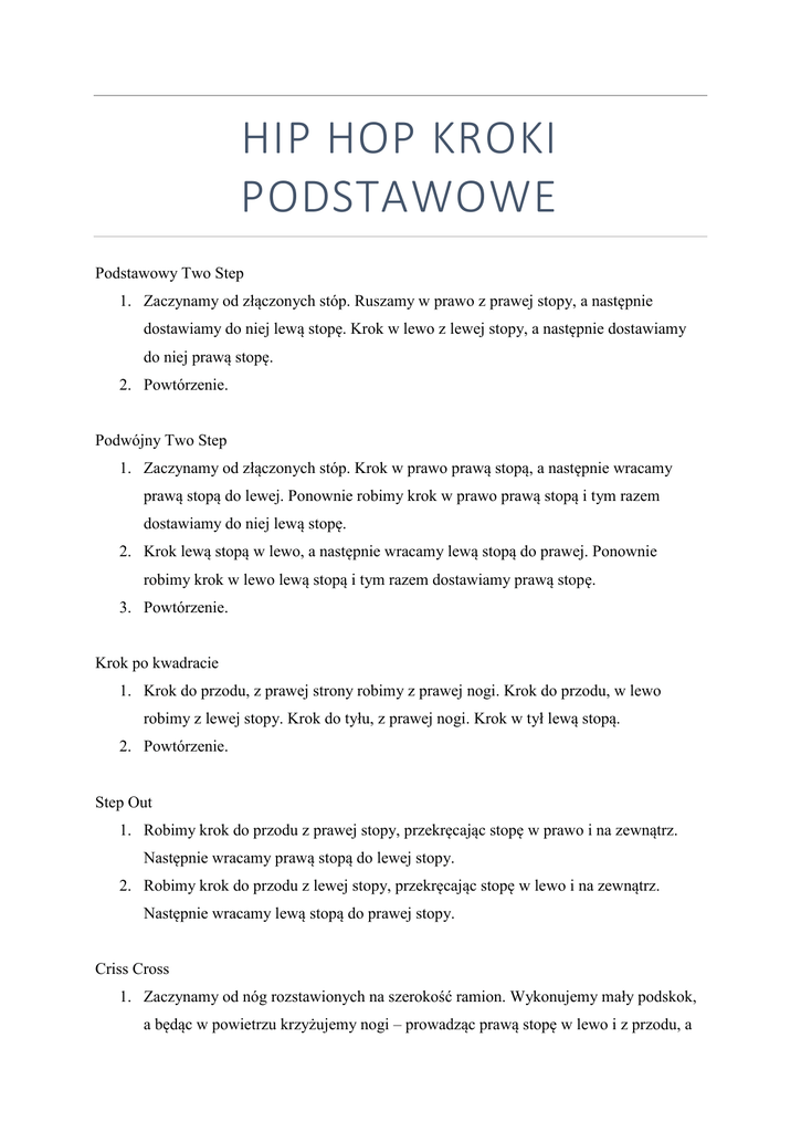 HIP HOP KROKI PODSTAWOWE Podstawowy Two Step 1. Zaczynamy od złączonych stóp. Ruszamy w prawo z prawej stopy, a następnie dostawiamy do niej lewą stopę. Krok w lewo z lewej stopy, a następnie dostawiamy do niej prawą stopę. 2. Powtórzenie. Podwójny Two Step 1. Zaczynamy od złączonych stóp. Krok w prawo prawą stopą, a następnie wracamy prawą stopą do lewej. Ponownie robimy krok w prawo prawą stopą i tym razem dostawiamy do niej lewą stopę. 2. Krok lewą stopą w lewo, a następnie wracamy lewą stopą do prawej. Ponownie robimy krok w lewo lewą stopą i tym razem dostawiamy prawą stopę. 3. Powtórzenie. Krok po kwadracie 1. Krok do przodu, z prawej strony robimy z prawej nogi. Krok do przodu, w lewo robimy z lewej stopy. Krok do tyłu, z prawej nogi. Krok w tył lewą stopą. 2. Powtórzenie. Step Out 1. Robimy krok do przodu z prawej stopy, przekręcając stopę w prawo i na zewnątrz. Następnie wracamy prawą stopą do lewej stopy. 2. Robimy krok do przodu z lewej stopy, przekręcając stopę w lewo i na zewnątrz. Następnie wracamy lewą stopą do prawej stopy. Criss Cross 1. Zaczynamy od nóg rozstawionych na szerokość ramion. Wykonujemy mały podskok, a będąc w powietrzu krzyżujemy nogi – prowadząc prawą stopę w lewo i z przodu, a lewą w prawo i nieco z tyłu. Lądujemy na ziemi z nogami skrzyżowanymi – prawa przed lewą. 2. Wykonujemy kolejny mały podskok W powietrzu przenosimy obie nogi do normalnej pozycji. Lądujemy z nogami rozstawionymi na szerokość barków. 3. Pkt. 1 i 2. Powtarzamy – tym razem stawiając lewą nogę z przodu, a prawą z tyłu. Dougie 1. Ruchy nóg przypominają Two Step, z tym wyjątkiem, że stopy pozostają rozstawione na szerokość ramion przez cały ruch. 2. Zaczynamy od kroku w bok lewą stopą. Prawą stopę przesuwamy w stronę lewej (ale ich nie łączymy), następnie zwracamy na palcach do środka wraz z ugięciem kolan. 3. Analogicznie ruch odbywa się w prawą stronę. Kick cross step 1. Nogi luźno, w lekkim rozkroku. Wykonaj luźne kopnięcie prawą nogą, jednocześnie robiąc lekko sprężynując na nogach. Podczas gdy wykonujesz kopnięcie, pochyl się na lewo. Kopiąca prawa noga krzyżuje się z lewą stając przed nią (dla zachowania równowagi na nogach); 2. Lewą nogą wykonaj krok w lewo, odkrzyżowując nogi. 3. Powtórz to samo wykonując kopnięcie lewą nogą i pochylając się na prawo. Happy feet 1. Zacznij z nogami na szerokości barków. Skręć prawą nogę w prawo na pięcie, podczas gdy lewa stopa skręca się w prawo na palcach. Powróć skręcając obie stopy w lewo, pozostawiając je płasko na podłodze. Pamiętaj o trzymaniu kolan w odległości od siebie. 2. To samo wykonaj w przeciwnym kierunku. Lewą stronę skręć w lewo na pięcie, podczas gdy prawa skręca się w lewo na palcach. Powróć skręcając obie stopy w prawo, pozostawiając je płasko na ziemi. 3. Można dodać ruchy głową lub wykonać podwójny ruch w obie strony. Wszystkie kroki można modyfikować, dodając ruchy ramion.
