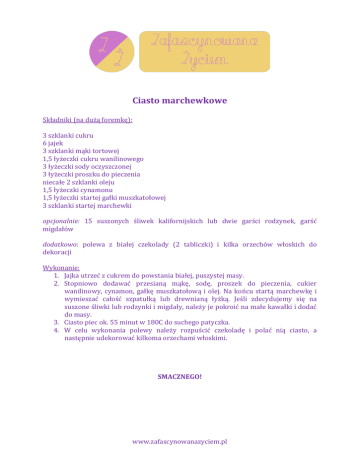 Ciasto marchewkowe Składniki (na dużą foremkę): 3 szklanki cukru 6 jajek 3 szklanki mąki tortowej 1,5 łyżeczki cukru wanilinowego 3 łyżeczki sody oczyszczonej 3 łyżeczki proszku do pieczenia niecałe 2 szklanki oleju 1,5 łyżeczki cynamonu 1,5 łyżeczki startej gałki muszkatołowej 3 szklanki startej marchewki opcjonalnie: 15 suszonych śliwek kalifornijskich lub dwie garści rodzynek, garść migdałów dodatkowo: polewa z białej czekolady (2 tabliczki) i kilka orzechów włoskich do dekoracji Wykonanie: 1. Jajka utrzeć z cukrem do powstania białej, puszystej masy. 2. Stopniowo dodawać przesianą mąkę, sodę, proszek do pieczenia, cukier wanilinowy, cynamon, gałkę muszkatołową i olej. Na końcu startą marchewkę i wymieszać całość szpatułką lub drewnianą łyżką. Jeśli zdecydujemy się na suszone śliwki lub rodzynki i migdały, należy je pokroić na małe kawałki i dodać do masy. 3. Ciasto piec ok. 55 minut w 180C do suchego patyczka. 4. W celu wykonania polewy należy rozpuścić czekoladę i polać nią ciasto, a następnie udekorować kilkoma orzechami włoskimi. SMACZNEGO! www.zafascynowanazyciem.pl