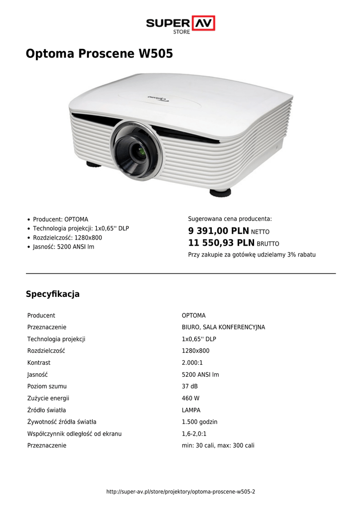 Optoma Proscene W505 Producent: OPTOMA Technologia projekcji: 1x0,65'' DLP Rozdzielczość: 1280x800 Jasność: 5200 ANSI lm Sugerowana cena producenta: 9 391,00 PLN NETTO 11 550,93 PLN BRUTTO Przy zakupie za gotówkę udzielamy 3% rabatu Specyfikacja Producent OPTOMA Przeznaczenie BIURO, SALA KONFERENCYJNA Technologia projekcji 1x0,65'' DLP Rozdzielczość 1280x800 Kontrast 2.000:1 Jasność 5200 ANSI lm Poziom szumu 37 dB Zużycie energii 460 W Źródło światła LAMPA Żywotność źródła światła 1.500 godzin Współczynnik odległość od ekranu 1,6-2,0:1 Przeznaczenie min: 30 cali, max: 300 cali http://super-av.pl/store/projektory/optoma-proscene-w505-2 HDMI x 1 DisplayPort x 1 D-Sub15 x 2 RGBHV (5xBNC) x 1 Wejścia video component video (3xchinch RCA) x 1 S-Video x 1 composite video (1xchinch RCA) x 1 3D Sync x 1 HDBaseT (RJ45) x 1 Wyjścia video D-Sub 15 x 1 audio stereo in (2x chinch RCA) x 2 Wejścia audio Mikrofon in x 1 audio stereo out (mini jack 3,5mm) x 2 USB x 1 RS232 x 1 Porty komunikacyjne RJ45 x 1 trigger 12V x 1 3D Sync-out Waga 8.6 kg Wymiary 430x183x341 mm PILOT ZDALNEGO STEROWANIA - tak Wymiary KABEL ZASILAJĄCY - tak CD-ROM Z OPROGRAMOWANIEM - tak Lens shift pionowy: +70/-20% , poziomy: +/-10% Kompatybilność 3D Frame Sequential (3D Ready) Sterowanie zoom ELEKTRYCZNE ZALEŻNE OD OBIEKTYWU Sterowanie focus ELEKTRYCZNE ZALEŻNE OD OBIEKTYWU Obiektyw f = 22,8-28,5mm (standardowy) Audio 20W Montaż sufitowy TAK Korekcja Keystone pionowa +/-20 stopni Wyrównanie jasności 85% FULL HD 1080P LENS-SHIFT DYNAMICZNY IRIS Funkcje specjalne INSTALACJA 360 STOPNI PIP STEROWANIE PRZEZ PRZEGLĄDARKĘ WWW SYMULACJA DICOM http://super-av.pl/store/projektory/optoma-proscene-w505-2 ultrakrótkoogniskowy 0,8:1 krótkoogniskowy 1,1-1,4:1 Obiektywy opcjonalne standardowy 1,6-2,0:1 długoogniskowy 2,0-3,0:1 ultradługoogniskowy 3,1-5,2:1 Przybliżony czas realizacji 7-10 DNI ROBOCZYCH Informacje Optoma W505 Potężne narzędzie prezentacji jasność 5200 lumenów wymienne obiektywy pełne wsparcie systemó sterowania Crestron, Extron, AMX, PJ-Link i Telnet LAN wsparcie standardu DICOM zaprojektowany specjalnie do projekcji profesjonalnych, bardzo mocny projektor X515 zapewnia wysoka jasność 5,200 lumenów ANSI i może być z powodzeniem stosowany nawet w najbardziej zaawansowanych instalacjach. Potężna jasność w połączeniu z kontrastem 10.000:1 gwarantuje jasny obraz i żywe kolory w prezentacjach oraz w projekcjach materiałów filmowych. Dla prezentacji medycznych możliwe jest zastosowanie trybu DICOM wzmacniającego skalę szarości kluczowa w obrazowaniu medycznym. Super AV al. Jana Pawła II 32 43 - 100 Tychy tel: 32 217 01 12 http://super-av.pl/store/projektory/optoma-proscene-w505-2