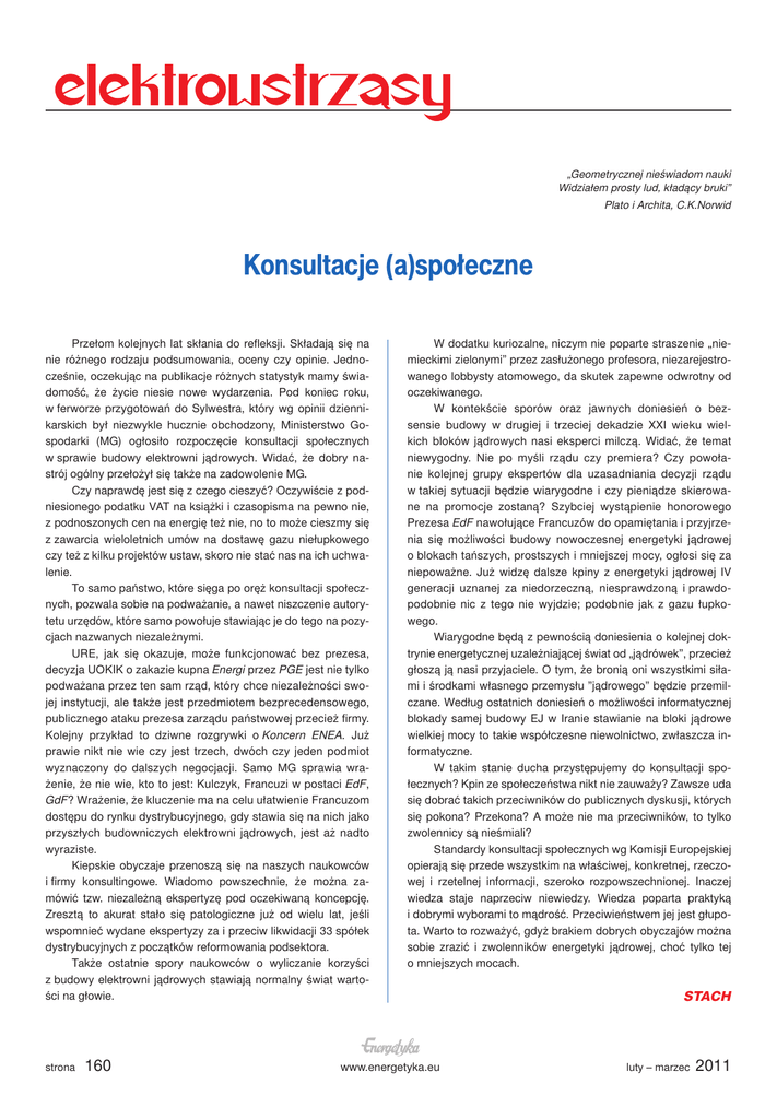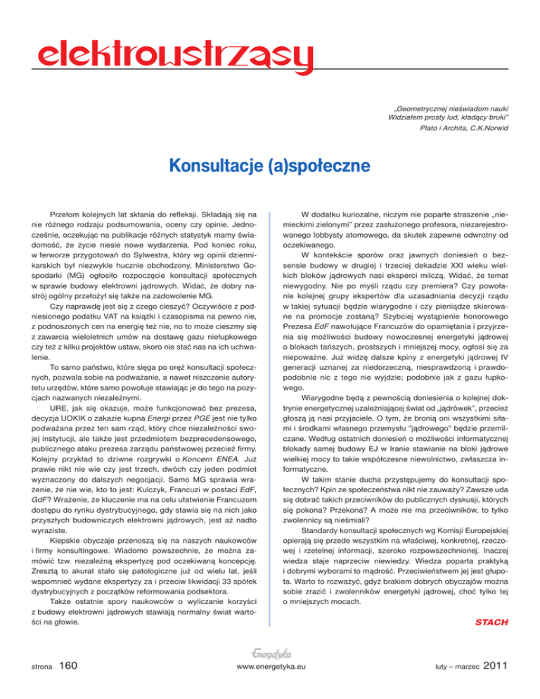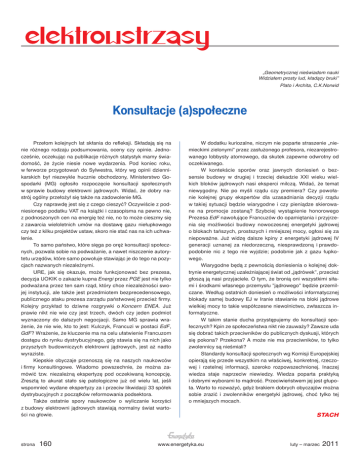 „Geometrycznej nieświadom nauki Widziałem prosty lud, kładący bruki” Plato i Archita, C.K.Norwid Konsultacje (a)społeczne Przełom kolejnych lat skłania do refleksji. Składają się na nie różnego rodzaju podsumowania, oceny czy opinie. Jednocześnie, oczekując na publikacje różnych statystyk mamy świadomość, że życie niesie nowe wydarzenia. Pod koniec roku, w ferworze przygotowań do Sylwestra, który wg opinii dziennikarskich był niezwykle hucznie obchodzony, Ministerstwo Gospodarki (MG) ogłosiło rozpoczęcie konsultacji społecznych w sprawie budowy elektrowni jądrowych. Widać, że dobry nastrój ogólny przełożył się także na zadowolenie MG. Czy naprawdę jest się z czego cieszyć? Oczywiście z podniesionego podatku VAT na książki i czasopisma na pewno nie, z podnoszonych cen na energię też nie, no to może cieszmy się z zawarcia wieloletnich umów na dostawę gazu niełupkowego czy też z kilku projektów ustaw, skoro nie stać nas na ich uchwalenie. To samo państwo, które sięga po oręż konsultacji społecznych, pozwala sobie na podważanie, a nawet niszczenie autorytetu urzędów, które samo powołuje stawiając je do tego na pozycjach nazwanych niezależnymi. URE, jak się okazuje, może funkcjonować bez prezesa, decyzja UOKIK o zakazie kupna Energi przez PGE jest nie tylko podważana przez ten sam rząd, który chce niezależności swojej instytucji, ale także jest przedmiotem bezprecedensowego, publicznego ataku prezesa zarządu państwowej przecież firmy. Kolejny przykład to dziwne rozgrywki o Koncern ENEA. Już prawie nikt nie wie czy jest trzech, dwóch czy jeden podmiot wyznaczony do dalszych negocjacji. Samo MG sprawia wrażenie, że nie wie, kto to jest: Kulczyk, Francuzi w postaci EdF, GdF? Wrażenie, że kluczenie ma na celu ułatwienie Francuzom dostępu do rynku dystrybucyjnego, gdy stawia się na nich jako przyszłych budowniczych elektrowni jądrowych, jest aż nadto wyraziste. Kiepskie obyczaje przenoszą się na naszych naukowców i firmy konsultingowe. Wiadomo powszechnie, że można zamówić tzw. niezależną ekspertyzę pod oczekiwaną koncepcję. Zresztą to akurat stało się patologiczne już od wielu lat, jeśli wspomnieć wydane ekspertyzy za i przeciw likwidacji 33 spółek dystrybucyjnych z początków reformowania podsektora. Także ostatnie spory naukowców o wyliczanie korzyści z budowy elektrowni jądrowych stawiają normalny świat wartości na głowie. strona 160 W dodatku kuriozalne, niczym nie poparte straszenie „niemieckimi zielonymi” przez zasłużonego profesora, niezarejestrowanego lobbysty atomowego, da skutek zapewne odwrotny od oczekiwanego. W kontekście sporów oraz jawnych doniesień o bezsensie budowy w drugiej i trzeciej dekadzie XXI wieku wielkich bloków jądrowych nasi eksperci milczą. Widać, że temat niewygodny. Nie po myśli rządu czy premiera? Czy powołanie kolejnej grupy ekspertów dla uzasadniania decyzji rządu w takiej sytuacji będzie wiarygodne i czy pieniądze skierowane na promocje zostaną? Szybciej wystąpienie honorowego Prezesa EdF nawołujące Francuzów do opamiętania i przyjrzenia się możliwości budowy nowoczesnej energetyki jądrowej o blokach tańszych, prostszych i mniejszej mocy, ogłosi się za niepoważne. Już widzę dalsze kpiny z energetyki jądrowej IV generacji uznanej za niedorzeczną, niesprawdzoną i prawdopodobnie nic z tego nie wyjdzie; podobnie jak z gazu łupkowego. Wiarygodne będą z pewnością doniesienia o kolejnej doktrynie energetycznej uzależniającej świat od „jądrówek”, przecież głoszą ją nasi przyjaciele. O tym, że bronią oni wszystkimi siłami i środkami własnego przemysłu ”jądrowego” będzie przemilczane. Według ostatnich doniesień o możliwości informatycznej blokady samej budowy EJ w Iranie stawianie na bloki jądrowe wielkiej mocy to takie współczesne niewolnictwo, zwłaszcza informatyczne. W takim stanie ducha przystępujemy do konsultacji społecznych? Kpin ze społeczeństwa nikt nie zauważy? Zawsze uda się dobrać takich przeciwników do publicznych dyskusji, których się pokona? Przekona? A może nie ma przeciwników, to tylko zwolennicy są nieśmiali? Standardy konsultacji społecznych wg Komisji Europejskiej opierają się przede wszystkim na właściwej, konkretnej, rzeczowej i rzetelnej informacji, szeroko rozpowszechnionej. Inaczej wiedza staje naprzeciw niewiedzy. Wiedza poparta praktyką i dobrymi wyborami to mądrość. Przeciwieństwem jej jest głupota. Warto to rozważyć, gdyż brakiem dobrych obyczajów można sobie zrazić i zwolenników energetyki jądrowej, choć tylko tej o mniejszych mocach. www.energetyka.eu Stach luty – marzec 2011