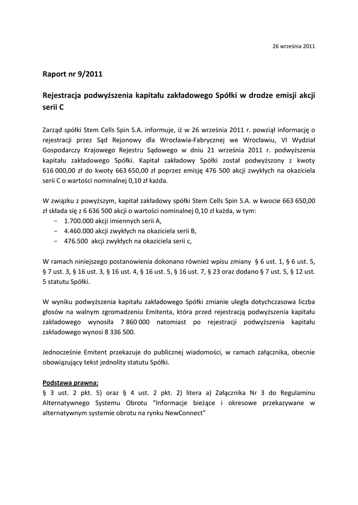26 września 2011 Raport nr 9/2011 Rejestracja podwyższenia kapitału zakładowego Spółki w drodze emisji akcji serii C Zarząd spółki Stem Cells Spin S.A. informuje, iż w 26 września 2011 r. powziął informację o rejestracji przez Sąd Rejonowy dla Wrocławia-Fabrycznej we Wrocławiu, VI Wydział Gospodarczy Krajowego Rejestru Sądowego w dniu 21 września 2011 r. podwyższenia kapitału zakładowego Spółki. Kapitał zakładowy Spółki został podwyższony z kwoty 616 000,00 zł do kwoty 663 650,00 zł poprzez emisję 476 500 akcji zwykłych na okaziciela serii C o wartości nominalnej 0,10 zł każda. W związku z powyższym, kapitał zakładowy spółki Stem Cells Spin S.A. w kwocie 663 650,00 zł składa się z 6 636 500 akcji o wartości nominalnej 0,10 zł każda, w tym: 1.700.000 akcji imiennych serii A, 4.460.000 akcji zwykłych na okaziciela serii B, 476.500 akcji zwykłych na okaziciela serii c, W ramach niniejszego postanowienia dokonano również wpisu zmiany § 6 ust. 1, § 6 ust. 5, § 7 ust. 3, § 16 ust. 3, § 16 ust. 4, § 16 ust. 5, § 16 ust. 7, § 23 oraz dodano § 7 ust. 5, § 12 ust. 5 statutu Spółki. W wyniku podwyższenia kapitału zakładowego Spółki zmianie uległa dotychczasowa liczba głosów na walnym zgromadzeniu Emitenta, która przed rejestracją podwyższenia kapitału zakładowego wynosiła 7 860 000 natomiast po rejestracji podwyższenia kapitału zakładowego wynosi 8 336 500. Jednocześnie Emitent przekazuje do publicznej wiadomości, w ramach załącznika, obecnie obowiązujący tekst jednolity statutu Spółki. Podstawa prawna: § 3 ust. 2 pkt. 5) oraz § 4 ust. 2 pkt. 2) litera a) Załącznika Nr 3 do Regulaminu Alternatywnego Systemu Obrotu "Informacje bieżące i okresowe przekazywane w alternatywnym systemie obrotu na rynku NewConnect”
