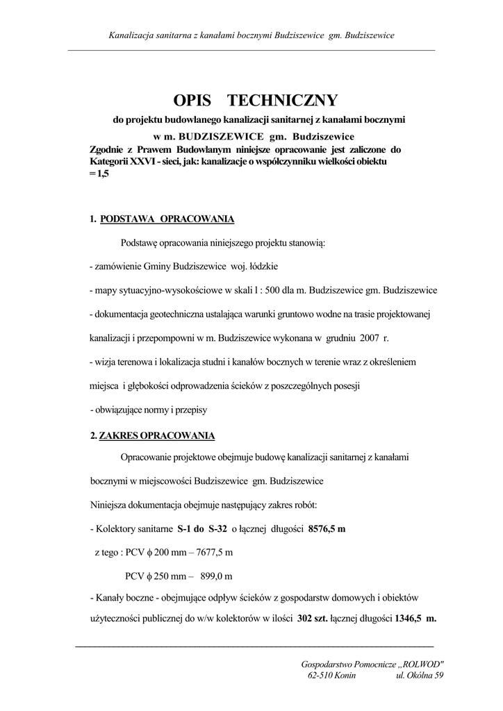 Kanalizacja sanitarna z kanałami bocznymi Budziszewice gm. Budziszewice _______________________________________________________________________________ OPIS TECHNICZNY do projektu budowlanego kanalizacji sanitarnej z kanałami bocznymi w m. BUDZISZEWICE gm. Budziszewice Zgodnie z Prawem Budowlanym niniejsze opracowanie jest zaliczone do Kategorii XXVI - sieci, jak: kanalizacje o współczynniku wielkości obiektu = 1,5 1. PODSTAWA OPRACOWANIA Podstawę opracowania niniejszego projektu stanowią: - zamówienie Gminy Budziszewice woj. łódzkie - mapy sytuacyjno-wysokościowe w skali l : 500 dla m. Budziszewice gm. Budziszewice - dokumentacja geotechniczna ustalająca warunki gruntowo wodne na trasie projektowanej kanalizacji i przepompowni w m. Budziszewice wykonana w grudniu 2007 r. - wizja terenowa i lokalizacja studni i kanałów bocznych w terenie wraz z określeniem miejsca i głębokości odprowadzenia ścieków z poszczególnych posesji - obwiązujące normy i przepisy 2. ZAKRES OPRACOWANIA Opracowanie projektowe obejmuje budowę kanalizacji sanitarnej z kanałami bocznymi w miejscowości Budziszewice gm. Budziszewice Niniejsza dokumentacja obejmuje następujący zakres robót: - Kolektory sanitarne S-1 do S-32 o łącznej długości 8576,5 m z tego : PCV φ 200 mm – 7677,5 m PCV φ 250 mm – 899,0 m - Kanały boczne - obejmujące odpływ ścieków z gospodarstw domowych i obiektów użyteczności publicznej do w/w kolektorów w ilości 302 szt. łącznej długości 1346,5 m. ___________________________________________________________________________ Gospodarstwo Pomocnicze „ROLWOD" 62-510 Konin ul. Okólna 59 Kanalizacja sanitarna z kanałami bocznymi Budziszewice gm. Budziszewice _______________________________________________________________________________ - Łączna długość sieci wraz z kanałami bocznymi wynosi 9913,0 mb. - Rurociągi tłoczne o łącznej długości 3946 m. Ponadto przewiduje się wykonać 8 szt. przepompowni sieciowych do przepompowywania ścieków surowych. 3. UZGODNIENIA I PROTOKOŁY W dokumentacji technicznej kanalizacji sanitarnej dokonano wszelkich niezbędnych uzgodnień kolizji z istniejącymi urządzeniami podziemnymi i nadziemnymi tj. - Zespół Uzgadniania Dokumentacji w Tomaszowie Mazowieckim - Zarząd Dróg Powiatowych w Tomaszowie Mazowieckim - Wojewódzki Zarząd Dróg Publicznych w Łodzi - Zakres kanalizacji uzgodniono z Gminą Budziszewice 4. UZBROJENIE TECHNICZNE NA TRASIE KANAŁÓW Na trasie projektowanych kolektorów i kanałów bocznych oraz w ich sąsiedztwie występują urządzenia podziemne, a mianowicie : - wodociąg - kable linii telefonicznych - kable energetyczne Trasy tych urządzeń zostały zinwentaryzowane geodezyjnie w trakcie aktualizacji map syt. - wys. w skali l: 500. Niezależnie od tego przed przystąpieniem do robót przewiduje się wykonanie próbnych przekopów ręcznych w celu wyznaczenia przebiegu istniejących urządzeń podziemnych i miejsc skrzyżowania z projektowaną kanalizacją sanitarną w celu ich odpowiedniego zabezpieczenia przed uszkodzeniem. ___________________________________________________________________________ Gospodarstwo Pomocnicze „ROLWOD" 62-510 Konin ul. Okólna 59 Kanalizacja sanitarna z kanałami bocznymi Budziszewice gm. Budziszewice _______________________________________________________________________________ Prace te należy prowadzić pod nadzorem przedstawicieli instytucji eksploatujących te urządzenia. Ponadto w celu zachowania bezpieczeństwa zaleca się bezwzględne wyłączenie energii elektrycznej w rejonie prowadzonych robót. Dotyczy to szczególnie miejsc skrzyżowania projektowanych kolektorów i kanałów bocznych z kablami energetycznymi. 5. OPIS PROJEKTOWANYCH ROZWIĄZAŃ 5.1. Zasięg projektowanej kanalizacji. Zasięg projektowanej kanalizacji o łącznej długości z kanałami bocznymi wynoszący 9923,0 m. obejmuje wszystkie obiekty budowlane prywatne oraz użyteczności publicznej położone w m. Budziszewice gm. Budziszewice. Dla umożliwienia sprowadzenia ścieków z całości terenu przewidzianego do skanalizowania, maksymalnego wypłycenia sieci oraz zrzutu ścieków do istniejącej kanalizacji przewidziano budowę 8 szt. przepompowni sieciowych P-1 do P-8 wraz z rurociągami tłocznymi T-1 do T-8. Łączna długość kolektorów tłocznych wynosi 3946 m. 5.2. Trasa kanałów. Trasy kanałów pokazano na planach syt- wys. w skali l : 500. Ścieki z zakresu objętego niniejszym projektem sprowadzone będą kolektorami w ilości 33 szt. oraz 8 przepompowniami wraz z rurociągami tłocznymi T-1 do T-8 do projektowanej oczyszczalni ścieków w m. Budziszewice. Kolektory zlokalizowano w pasie drogowym drogi wojewódzkiej, powiatowej oraz dróg gminnych. 5.3. Głębokość posadowienia kanałów. Zagłębienie kanalizacji określono na profilach podłużnych projektowanych kolektorów. W projekcie dążono do lokalizacji kanałów możliwie płytko przy możliwości ___________________________________________________________________________ Gospodarstwo Pomocnicze „ROLWOD" 62-510 Konin ul. Okólna 59 Kanalizacja sanitarna z kanałami bocznymi Budziszewice gm. Budziszewice _______________________________________________________________________________ wykonania właściwie kanałów bocznych. Głębokości ich w większości nie przekraczają 4,0 m. i wynoszą średnio 2,50 – 3,50 m. 5.4. Średnice i spadki. Na załączonych profilach podłużnych kanałów podano wszystkie projektowane parametry sieci tj. średnice, materiał, konstrukcję, podłoże, spadki, głębokości oraz lokalizację studni. Dla kolektorów przewidziano średnicę φ 200 i 250 mm. Projektowane spadki dostosowano do warunków terenowych oraz optymalnych zagłębień kanałów i wynoszą one średnio 5 promili. 5.5. Konstrukcja kolektorów kanalizacji sanitarnej. Kolektory kanalizacji sanitarnej zaprojektowano z rur PCV litych klasy S o średnicy φ 200 i 250 mm. ułożonych na pods