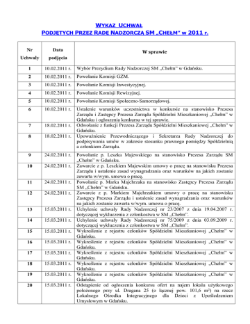 WYKAZ UCHWAŁ PODJĘTYCH PRZEZ RADĘ NADZORCZĄ SM „CHEŁM” w 2011 r. Nr Data Uchwały podjęcia 1 10.02.2011 r. Wybór Prezydium Rady Nadzorczej SM „Chełm” w Gdańsku. 2 10.02.2011 r. Powołanie Komisji GZM. 3 10.02.2011 r. Powołanie Komisji Inwestycyjnej. 4 10.02.2011 r. Powołanie Komisji Rewizyjnej. 5 10.02.2011 r. Powołanie Komisji Społeczno-Samorządowej. 6 10.02.2011 r. 7 18.02.2011 r. 8 18.02.2011 r. Ustalenie warunków uczestnictwa w konkursie na stanowisko Prezesa Zarządu i Zastępcy Prezesa Zarządu Spółdzielni Mieszkaniowej „Chełm” w Gdańsku i ogłoszenia konkursu w tej sprawie. Odwołanie z funkcji Prezesa Zarządu Spółdzielni Mieszkaniowej „Chełm” w Gdańsku. Upoważnienie Przewodniczącego i Sekretarza Rady Nadzorczej do podpisywania umów w zakresie stosunku prawnego pomiędzy Spółdzielnią a członkiem Zarządu. 9 24.02.2011 r. 10 24.02.2011 r. 11 24.02.2011 r. 12 24.02.2011 r. 13 15.03.2011 r. 14 15.03.2011 r. 15 15.03.2011 r. 16 15.03.2011 r. 17 15.03.2011 r. 18 15.03.2011 r. 19 15.03.2011 r. 20 15.03.2011 r. W sprawie Powołanie p. Leszka Majewskiego na stanowisko Prezesa Zarządu SM „Chełm” w Gdańsku. Zawarcie z p. Leszkiem Majewskim umowy o pracę na stanowisku Prezesa Zarządu i ustalenie zasad wynagradzania oraz warunków na jakich zostanie zawarta w/wym. umowa o pracę. Powołanie p. Marka Majchrzaka na stanowisko Zastępcy Prezesa Zarządu SM „Chełm” w Gdańsku. Zawarcie z p. Markiem Majchrzakiem umowy o pracę na stanowisku Zastępcy Prezesa Zarządu i ustalenie zasad wynagradzania oraz warunków na jakich zostanie zawarta w/wym. umowa o pracę. Uchylenie uchwały Rady Nadzorczej nr 23/2007 z dnia 19.04.2007 r. dotyczącej wykluczenia z członkostwa w SM „Chełm”. Uchylenie uchwały Rady Nadzorczej nr 75/2009 z dnia 03.09.2009 r. dotyczącej wykluczenia z członkostwa w SM „Chełm”. Wykreślenie z rejestru członków Spółdzielni Mieszkaniowej „Chełm” w Gdańsku. Wykreślenie z rejestru członków Spółdzielni Mieszkaniowej „Chełm” w Gdańsku. Wykreślenie z rejestru członków Spółdzielni Mieszkaniowej „Chełm” w Gdańsku. Wykreślenie z rejestru członków Spółdzielni Mieszkaniowej „Chełm” w Gdańsku. Wykreślenie z rejestru członków Spółdzielni Mieszkaniowej „Chełm” w Gdańsku. Odstąpienie od ogłoszenia konkursu ofert na najem lokalu użytkowego położonego przy ul. Dragana 25 (o łącznej pow. 101,6 m²) na rzecz Lokalnego Ośrodka Integracyjnego dla Dzieci z Upośledzeniem Umysłowym w Gdańsku. 21 15.03.2011 r. 22 15.03.2011 r. 23 15.03.2011 r. 24 24.03.2011 r. 25 24.03.2011 r. 26 24.03.2011 r. 27 24.03.2011 r. 28 24.03.2011 r. 29 24.03.2011 r. 30 24.03.2011 r. 31 24.03.2011 r. 32 24.03.2011 r. 33 24.03.2011 r. 34 24.03.2011 r. 35 24.03.2011 r. 36 24.03.2011 r. 37 24.03.2011 r. 38 24.03.2011 r. 39 24.03.2011 r. Odstąpienie od ogłoszenia konkursu ofert na dzierżawę terenu o łącznej powierzchni 4 975 m² położonego przy ul. Szopińskiego w Gdańsku z przeznaczeniem pod parking strzeżony. Wyrażenie zgody na obniżenie ceny lokalu mieszkalnego nr 116 położonego przy ul. Chałubińskiego 22. Wybór biegłego rewidenta do przeprowadzenia badania sprawozdania finansowego SM „Chełm” za 2010 r. Powołanie Komisji Statutowej jako komisji czasowej Rady Nadzorczej SM „Chełm”. Potwierdzenie czynności podejmowanych przez p. Leszka Majewskiego w okresie od dnia 01.10.2010 r. do dnia 21.12.2010 r. oraz nadanie prowadzeniu spraw Spółdzielni w tym okresie skutków zlecenia. Ustalenie wynagrodzenia dla p. L. Majewskiego za prowadzenie spraw Spółdzielni w okresie: od 01 października 2010 r. do 21 grudnia 2010 r. Potwierdzenie czynności podejmowanych przez p. Marka Majchrzaka w okresie od dnia 01.11.2010 r. do dnia 24.02.2011 r. oraz nadanie prowadzeniu spraw Spółdzielni w tym okresie skutków zlecenia Ustalenie wynagrodzenia dla p. M. Majchrzaka za prowadzenie spraw Spółdzielni w okresie: od 01 listopada 2010 r. do 24 lutego 2011 r. Utrzymanie w mocy czynności kuratora Spółdzielni Mieszkaniowej „Chełm” będącej regulaminowo uprawnieniem Rady Nadzorczej, dotyczącej podwyższenia od dnia 01 stycznia 2011 r. opłaty za podgrzanie 1 m³ wody do wysokości 16,50 zł/ m³. Odstąpienie od naliczonego ryczałtu za wodę za okres: od lipca do grudnia 2010 r., dla lokalu nr 2 przy ul. Dragana 20 oraz naliczenie zużycia wody dla ww. lokalu zgodnie z normami zużycia wody w Polsce. Ustanowienie służebności przechodu do altany śmietnikowej położonej na nieruchomości Szpora 9 /działka nr 2324/. Zatwierdzenie planu pracy Rady Nadzorczej na I półrocze - II kwartał 2011 r. Potwierdzenie czynności podejmowanych przez p. Elżbietę Piotrowską - p.o. Prezesa Zarządu - w okresie od dnia 19.06.2010 r. do dnia 30.09.2010 r. oraz nadanie prowadzeniu spraw Spółdzielni w tym okresie skutków zlecenia. Ustalenie wynagrodzenia dla p. Elżbiety Piotrowskiej za prowadzenie spraw Spółdzielni w okresie: od 19.06 2010 r. do dnia 30.09.2010 r. Potwierdzenie czynności podejmowanych przez p. Stanisława Jaruzela - p.o. Zastępcy Prezesa Zarządu - w okresie od dnia 19.06.2010 r. do dnia 31.10.2010 r. oraz nadanie prowadzeniu spraw Spółdzielni w tym okresie skutków zlecenia. Ustalenie wynagrodzenia dla p. Stanisława Jaruzela za prowadzenie spraw Spółdzielni w okresie: od 19.06.2010 r. do dnia 31.10.2010 r. Uchwalenie Regulaminu premiowania członków Zarządu SM Chełm . Uchylenie uchwały RN nr 61/2010 z dnia 08.04.2010 r. w sprawie ustalenia zasad wydzielania miejsc postojowych dla osób niepełnosprawnych oraz zatwierdzenie Regulaminu wydzielania stałych miejsc postojowych dla osób niepełnosprawnych. Wyrażenie zgody na obniżkę stawki eksploatacji podstawowej z tytułu dzierżawy terenów pod parkingi strzeżone przy ul. Biegańskiego, Cieszyńskiego i Szopińskiego w Gdańsku. 40 24.03.2011 r. 41 05.04.2011 r. 42 05.04.2011 r. 43 05.04.2011 r. Podj